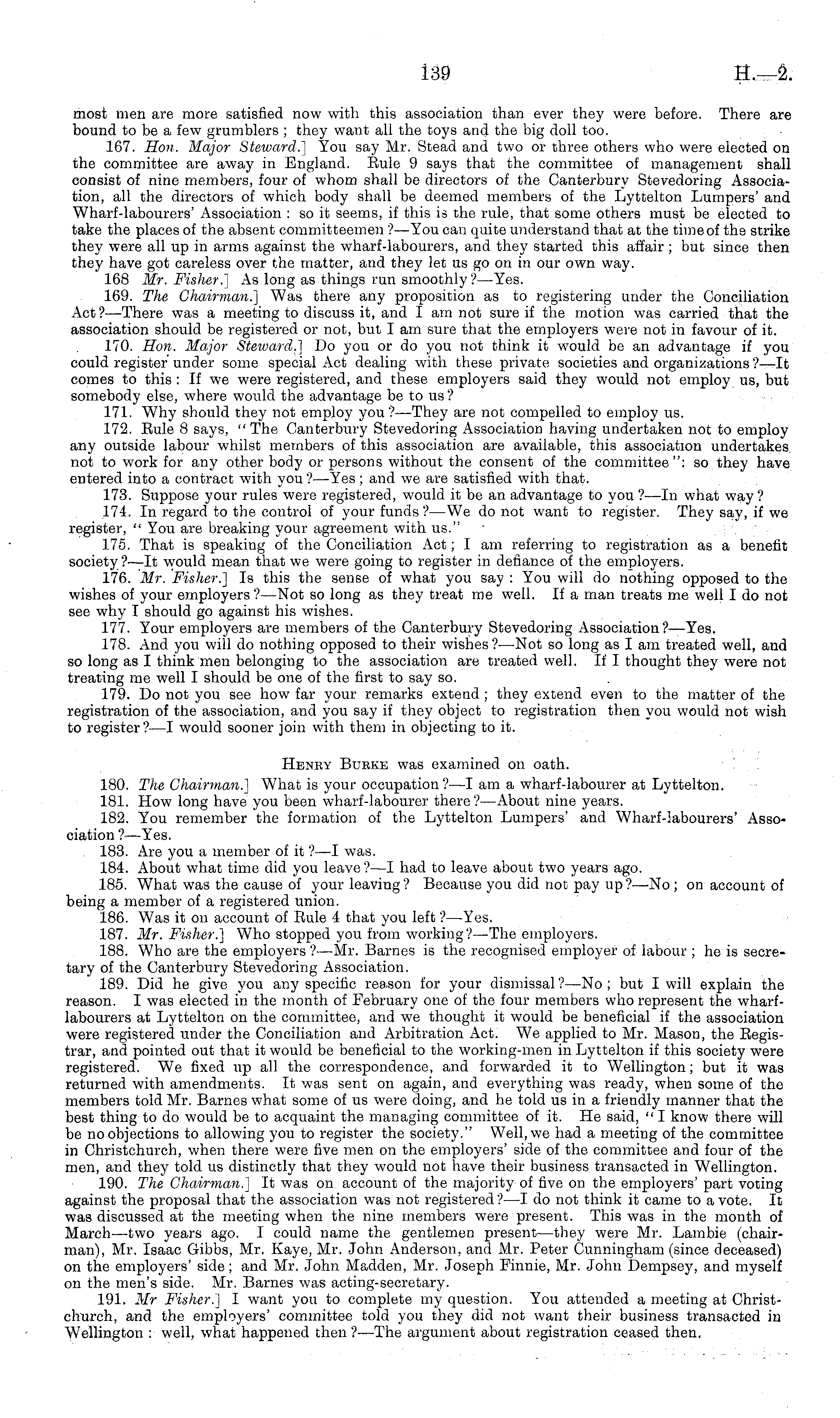 most men are more satisfied now with this association than ever they were before. There are bound to be a few grumblers ; they want all the toys and the big doll too. 167. Hon. Major Steward.] You say Mr. Stead and two or three others who were elected on the committee are away in England. Eule 9 says that the committee of management shall consist of nine members, four of whom shall be directors of the Canterbury Stevedoring Association, all the directors of which body shall be deemed members of the Lyttelton Lumpers' and Wharf-labourers' Association : so it seems, if this is the rule, that some others must be elected to take the places of the absent committeemen ?—You can quite understand that at the time of the strike they were all up in arms against the wharf-labourers, and they started this affair; but since then they have got careless over the matter, and they let us go on in our own way. 168 Mr. Fisher.] As long as things run smoothly ?—Yes. 169. The Chairman.] Was there any proposition as to registering under the Conciliation Act?— There was a meeting to discuss it, and I am not sure if the motion was carried that the association should be registered or not, but I am sure that the employers were not in favour of it. 170. Hon. Major Steward.} Do you or do you not think it would be an advantage if you could register under some special Act dealing with these private societies and organizations ?—lt comes to this : If we were registered, and these employers said they would not employ us, but somebody else, where would the advantage be to us ? 171. Why should they not employ you ?—They are not compelled to employ us. 172. Eule 8 says, "The Canterbury Stevedoring Association having undertaken not to employ any outside labour whilst members of this association are available, this association undertakes not to work for any other body or persons without the consent of the committee": so they have entered into a contract with you ?—Yes ; and we are satisfied with that. 173. Suppose your rules were registered, would it be an advantage to you ?—ln what way ? 174. In regard to the control of your funds ?—We do not want to register. They say, if we register, " You are breaking your agreement with us." 175. That is speaking of the Conciliation Act; I am referring to registration as a benefit society?—lt would mean that we were going to register in defiance of the employers. 176. Mr. Fisher.] Is this the sense of what you say : You will do nothing opposed to the wishes of your employers?— Not so long as they treat me well. If a man treats me well Ido not see why I should go against his wishes. 177. Your employers are members of the Canterbury Stevedoring Association?— Yes. 178. And you will do nothing opposed to their wishes ?—-Not so long as I am treated well, and so long as I think men belonging to the association are treated well. If I thought they were not treating me well I should be one of the first to say so. 179. Do not you see how far your remarks extend; they extend even to the matter of the registration of the association, and you say if they object to registration then you would not wish to register? —I would sooner join with them in objecting to it. Henry Burke was examined on oath. 180. The Chairman.] What is your occupation?—l am a wharf-labourer at Lyttelton. 181. How long have you been wharf-labourer there?— About nine years. 182. You remember the formation of the Lyttelton Lumpers' and Wharf-labourers' Association ? —Yes. 183. Are you a member of it ?—I was. 184. About what time did you leave?—l had to leave about two years ago. 185. What was the cause of your leaving? Because you did not pay up?—-No; on account of being a member of a registered union. 186. Was it on account of Eule 4 that you left ?—Yes. 187. Mr. Fisher.] Who stopped you from working? —The employers. 188. Who are the employers ?—Mr. Barnes is the recognised employer of labour ; he is secretary of the Canterbury Stevedoring Association. 189. Did he give you any specific reason for your dismissal ?—No ; but I will explain the reason. I was elected in the month of February one of the four members who represent the wharflabourers at Lyttelton on the committee, and we thought it would be beneficial if the association were registered under the Conciliation and Arbitration Act. We applied to Mr. Mason, the Eegistrar, and pointed out that it would be beneficial to the working-men in Lyttelton if this society were registered. We fixed up all the correspondence, and forwarded it to Wellington; but it was returned with amendments. It was sent on again, and everything was ready, when some of the members told Mr. Barnes what some of us were doing, and he told us in a friendly manner that the best thing to do would be to acquaint the managing committee of it. He said, " I know there will be no objections to allowing you to register the society." Well, we had a meeting of the committee in Christchurch, when there were five men on the employers' side of the committee and four of the men, and they told us distinctly that they would not have their business transacted in Wellington. 190. The Chairman.] It was on account of the majority of five on the employers' part voting against the proposal that the association was not registered?—l do not think it came to a vote. It was discussed at the meeting when the nine members were present. This was in the month of March—two years ago. I could name the gentlemen present —they were Mr. Lambie (chairman), Mr. Isaac Gibbs, Mr. Kaye, Mr. John Anderson, and Mr. Peter Cunningham (since deceased) on the employers' side ; and Mr. John Madden, Mr. Joseph Finnic, Mr. John Dempsey, and myself on the men's side. Mr. Barnes was acting-secretary. 191. Mr Fisher.] I want you to complete my question. You attended a meeting at Christchurch, and the employers' committee told you they did not want their business transacted in Wellington : well, what happe
