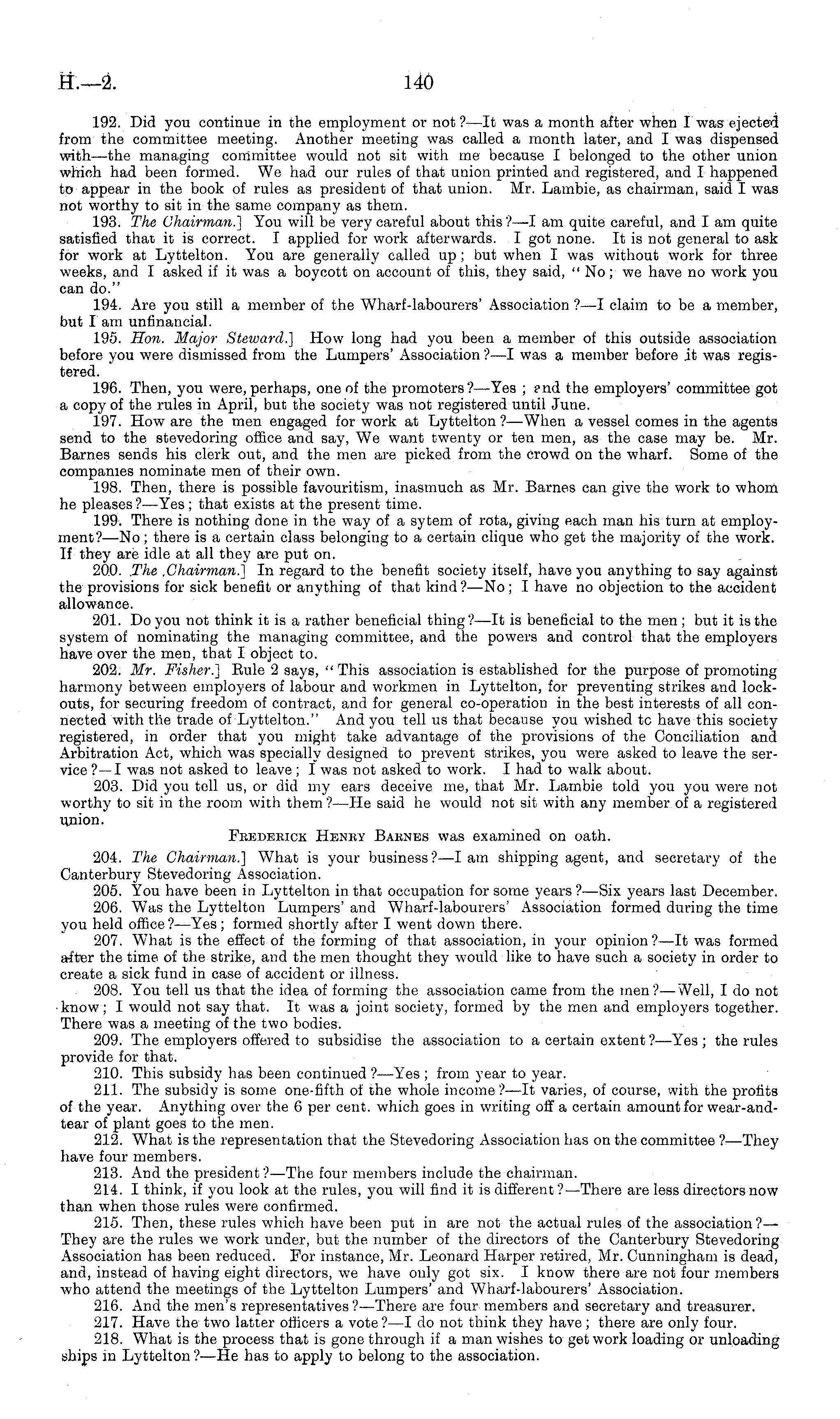 192. Did you continue in the employment or not ?—lt was a month after when I was ejected from the committee meeting. Another meeting was called a month later, and I was dispensed with—the managing committee would not sit with me because I belonged to the other union which had been formed. We had our rules of that union printed and registered, and I happened to appear in the book of rules as president of that union. Mr. Lambie, as chairman, said I was not worthy to sit in the same company as them. 193. The Chairman.] You will be very careful about this?—l am quite careful, and lam quite satisfied that it is correct. I applied for work afterwards. I got none. It is not general to ask for work at Lyttelton. You are generally called up; but when I was without work for three weeks, and I asked if it was a boycott on account of this, they said, " No; we have no work you can do." 194. Are you still a member of the Wharf-labourers' Association ?—I claim to be a member, but I am unfinancial. 195. Hon. Major Steward.] How long had you been a member of this outside association before you were dismissed from the Lumpers' Association ?—I was a member before it was registered. 196. Then, you were, perhaps, one of the promoters? —Yes ; ?nd the employers' committee got a copy of the rules in April, but the society was not registered until June. 197. How are the men engaged for work at Lyttelton ?—When a vessel comes in the agents send to the stevedoring office and say, We want twenty or ten men, as the case may be. Mr. Barnes sends his clerk out, and the men are picked from the crowd on the wharf. Some of the companies nominate men of their own. 198. Then, there is possible favouritism, inasmuch as Mr. Barnes can give the work to whom he pleases?— Yes; that exists at the present time. 199. There is nothing done in the way of a sytem of rota, giving each man his turn at employment?—No; there is a certain class belonging to a certain clique who get the majority of the work. If they are idle at all they are put on. 20.0. The .Chairman.] In regard to the benefit society itself, have you anything to say against the provisions for sick benefit or anything of that kind ? —No; I have no objection to the accident allowance. 201. Do you not think it is a rather beneficial thing?—lt is beneficial to the men; but it is the system of nominating the managing committee, and the powers and control that the employers have over the men, that I object to. 202. Mr. Fisher.] Eule 2 says, " This association is established for the purpose of promoting harmony between employers of labour and workmen in Lyttelton, for preventing strikes and lockouts, for securing freedom of contract, and for general co-operation in the best interests of all connected with the trade of Lyttelton." And you tell us that because you wished tc have this society registered, in order that you might take advantage of the provisions of the Conciliation and Arbitration Act, which was specially designed to prevent strikes, you were asked to leave the service ?—I was not asked to leave; I was not asked to work. I had to walk about. 203. Did you tell us, or did my ears deceive me, that Mr. Lambie told you you were not worthy to sit in the room with them ?—He said he would not sit with any member of a registered union. Frederick Henry Barnes was examined on oath. 204. The Chairman.] What is your business? —lam shipping agent, and secretary of the Canterbury Stevedoring Association. 205. You have been in Lyttelton in that occupation for some years ?—Six years last December. 206. Was the Lyttelton Lumpers' and Wharf-labourers' Association formed during the time you held office?— Yes; formed shortly after I went down there. 207. What is the effect of the forming of that association, in your opinion?—lt was formed after the time of the strike, and the men thought they would like to have such a society in order to create a sick fund in case of accident or illness. 208. You tell us that the idea of forming the association came from the men?— Well, I do not know; I would not say that. It was a joint society, formed by the men and employers together. There was a meeting of the two bodies. 209. The employers offered to subsidise the association to a certain extent ?—Yes ; the rules provide for that. 210. This subsidy has been continued ?—Yes ; from year to year. 211. The subsidy is some one-fifth of the whole income?—lt varies, of course, with the profits of the year. Anything over the 6 per cent, which goes in writing off a certain amount for wear-and-tear of plant goes to the men. 212. What is the representation that the Stevedoring Association has on the committee ?—They have four members. 213. And the president ?—The four members include the chairman. 214. I think, if you look at the rules, you will find it is different ?—There are less directors now than when those rules were confirmed. 215. Then, these rules which have been put in are not the actual rules of the association ?— They are the rules we work under, but the number of the directors of the Canterbury Stevedoring Association has been reduced. For instance, Mr. Leonard Harper retired, Mr. Cunningham is dead, and, instead of having eight directors, we have only got six. I know there are not four members who attend the meetings of the Lyttelton Lumpers' and Wharf-labourers' Association. 216. And the men's representatives?— There are four members and secretary and treasurer. 217. Have the two latter officers a vote? —I do not think they have; there are only four. 218. What is the process that is gone through if a man wishes to get work loading or unloading ships in Lyttelton?—He has to apply to belong to the association.