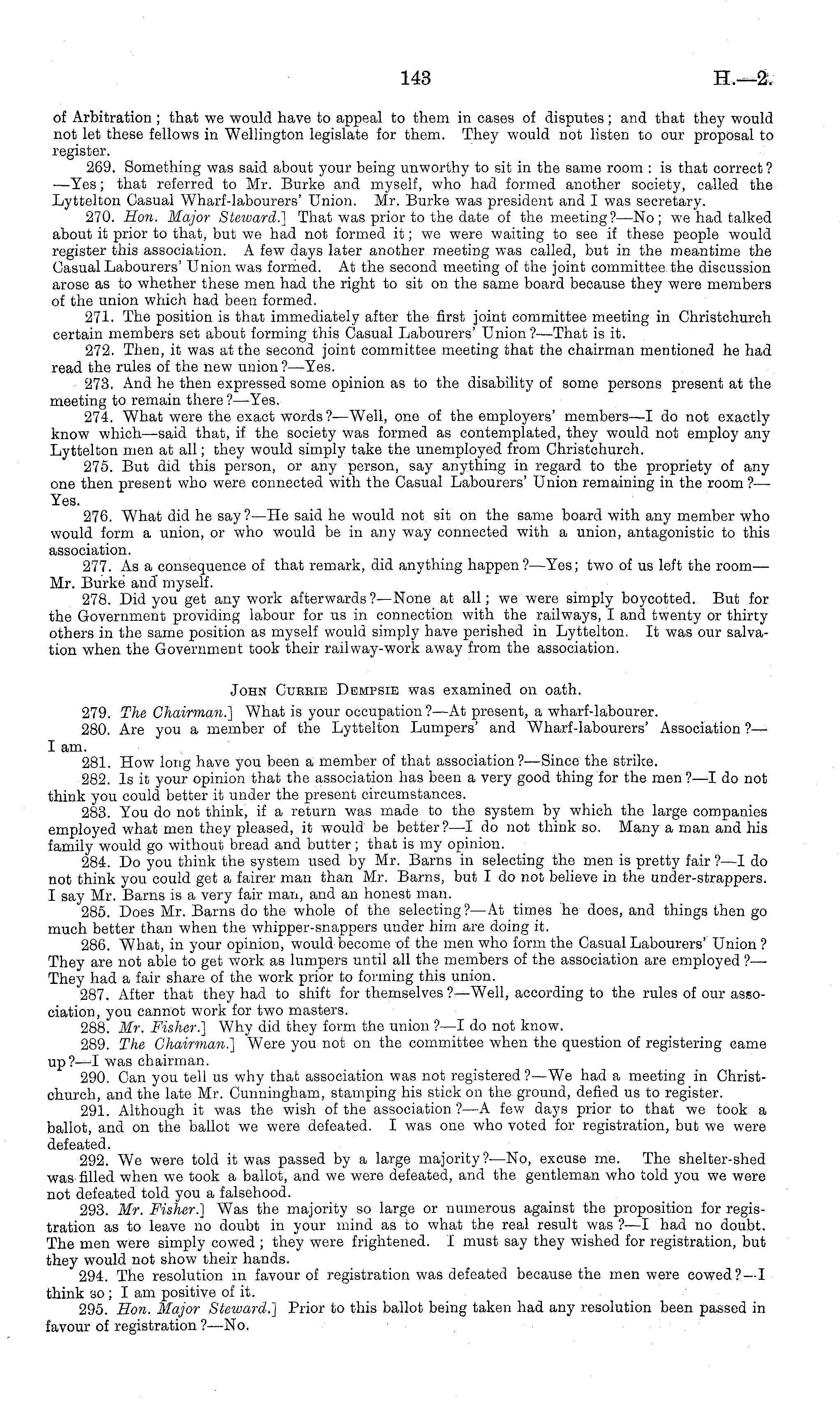 of Arbitration; that we would have to appeal to them in cases of disputes; and that they would not let these fellows in Wellington legislate for them. They would not listen to our proposal to register. 269. Something was said about your being unworthy to sit in the same room : is that correct ? —Yes; that referred to Mr. Burke and myself, who had formed another society, called the Lyttelton Casual Wharf-labourers' Union. Mr. Burke was president and I was secretary. 270. Hon. Major Steward.] That was prior to the date of the meeting?—No; we had talked about it prior to that, but we had not formed it; we were waiting to see if these people would register this association. A few days later another meeting was called, but in the meantime the Casual Labourers' Union was formed. At the second meeting of the joint committee the discussion arose as to whether these men had the right to sit on the same board because they were members of the union which had been formed. 271. The position is that immediately after the first joint committee meeting in Christchurch certain members set about forming this Casual Labourers' Union?— That is it. 272. Then, it was at the second joint committee meeting that the chairman mentioned he had read the rules of the new union? —Yes. 273. And he then expressed some opinion as to the disability of some persons present at the meeting to remain there?— Yes. 274. What were the exact words ? —Well, one of the employers' members—l do not exactly know which —said that, if the society was formed as contemplated, they would not employ any Lyttelton men at all; they would simply take the unemployed from Christchurch. 275. But did this person, or any person, say anything in regard to the propriety of any one then present who were connected with the Casual Labourers' Union remaining in the room?— Yes. 276. What did he say?—He said he would not sit on the same board with any member who would form a union, or who would be in any way connected with a union, antagonistic to this association. 277. As a consequence of that remark, did anything happen? —Yes; two of us left the room— Mr. Burke and' myself. 278. Did you get any work afterwards ? —None at all; we were simply boycotted. But for the Government providing labour for us in connection with the railways, I and twenty or thirty others in the same position as myself would simply have perished in Lyttelton. It was our salvation when the Government took their railway-work away from the association. John Currie Dempsie was examined on oath. 279. The Chairman.] What is your occupation ? —At present, a wharf-labourer. 280. Are you a member of the Lyttelton Lumpers' and Wharf-labourers' Association ?— I am. 281. How long have you been a member of that association? —Since the strike. 282. Is it your opinion that the association has been a very good thing for the men ?—I do not think you could better it under the present circumstances. 283. You do not think, if a return was made to the system by which the large companies employed what men they pleased, it would be better? —I do not think so. Many a man and his family would go without bread and butter; that is my opinion. 284. Do you think the system used by Mr. Barns in selecting the men is pretty fair ?—I do not think you could get a fairer man than Mr. Barns, but I do not believe in the under-strappers. I say Mr. Barns is a very fair man, and an honest man. 285. Does Mr. Barns do the whole of the selecting ?—At times he does, and things then go much better than when the whipper-snappers under him are doing it. 286. What, in your opinion, would become of the men who form the Casual Labourers' Union ? They are not able to get work as lumpers until all the members of the association are employed ?— They had a fair share of the work prior to forming this union. 287. After that they had to shift for themselves ? —Well, according to the rules of our association, you cannot work for two masters. 288. Mr. Fisher.] Why did they form the union ? —I do not know. 289. The Chairman.] Were you not on the committee when the question of registering came up ? —I was chairman. 290. Can you tell us why that association was not registered ? —We had a meeting in Christchurch, and the late Mr. Cunningham, stamping his stick on the ground, defied us to register. 291. Although it was the wish of the association? —A few days prior to that we took a ballot, and on the ballot we were defeated. I was one who voted for registration, but we were defeated. 292. We were told it was passed by a large majority?—No, excuse me. The shelter-shed was filled when we took a ballot, and we were defeated, and the gentleman who told you we were not defeated told you a falsehood. 293. Mr. Fisher.] Was the majority so large or numerous against the proposition for registration as to leave no doubt in your mind as to what the real result was ? —I had no doubt. The men were simply cowed ; they were frightened. 1 must say they wished for registration, but they would not show their hands. 294. The resolution in favour of registration was defeated because the men were cowed?—l think so; lam positive of it. 295. Hon. Major Steward.] Prior to this ballot being taken had any resolution been passed in favour of registration ?—No.