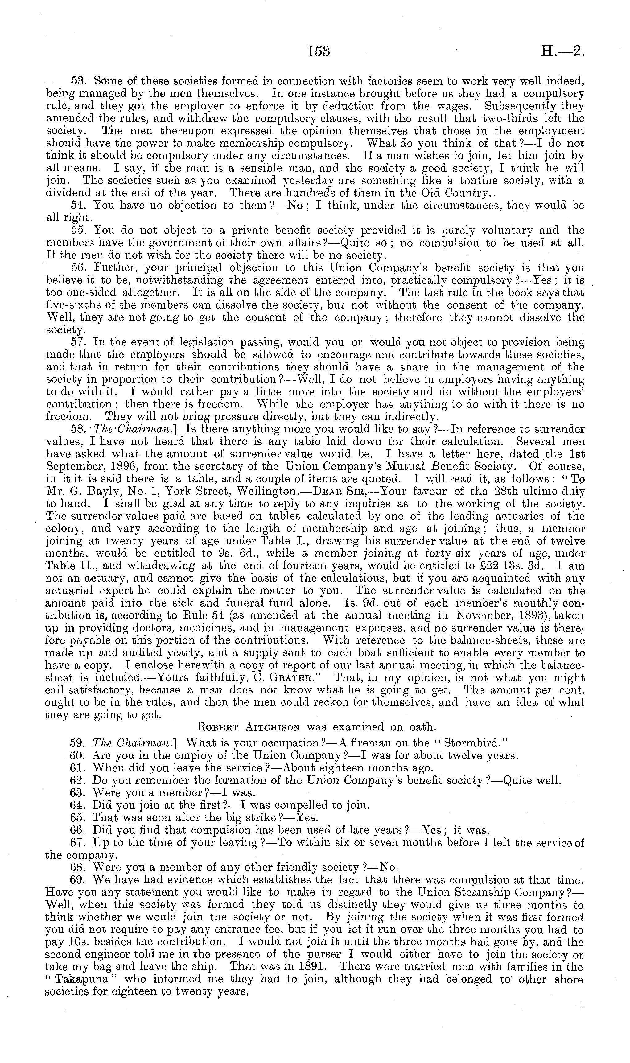 53. Some of these societies formed in connection with factories seem to work very well indeed, being managed by the men themselves. In one instance brought before us they had a compulsory rule, and they got the employer to enforce it by deduction from the wages. Subsequently they amended the rules, and withdrew the compulsory clauses, with the result that two-thirds left the society. The men thereupon expressed the opinion themselves that those in the employment should have the power to make membership compulsory. What do you think of that ?—I do not think it should be compulsory under any circumstances. If a man wishes to join, let him join by all means. I say, if the man is a sensible man, and the society a good society, I think he will join. The societies such as you examined yesterday are something like a tontine society, with a dividend at the end of the year. There are hundreds of them in the Old Country. 54. You have no objection to them ?—No ; I think, under the circumstances, they would be all right. 55 You do not object to a private benefit society provided it is purely voluntary and the members have the government of their own affairs?— Quite so ; no compulsion to be used at all. If the men do not wish for the society there will be no society. 56. Further, your principal objection to this Union Company's benefit society is that you believe it to be, notwithstanding the agreement entered into, practically compulsory ? —Yes; it is too one-sided altogether. It is all on the side of the company. The last rule in the book says that five-sixths of the members can dissolve the society, but not without the consent of the company. Well, they are not going to get the consent of the company; therefore they cannot dissolve the society. 57. In the event of legislation passing, would you or would you not object to provision being made that the employers should be allowed to encourage and contribute towards these societies, and that in return for their contributions they should have a share in the management of the society in proportion to their contribution ?—Well, I do not believe in employers having anything to do with it. I would rather pay a little more into the society and do without the employers' contribution ; then there is freedom. While the employer has anything to do with it there is no freedom. They will not bring pressure directly, but they can indirectly. 58. ■ The-Chairman.] Is there anything more you would like to say ?—ln reference to surrender values, I have not heard that there is any table laid down for their calculation. Several men have asked what the amount of surrender value would be. I have a letter here, dated the Ist September, 1896, from the secretary of the Union Company's Mutual Benefit Society. Of course, in it it is said there is a table, and a couple of items are quoted. I will read it, as follows : "To Mr. G. Bayly, No. 1, York Street, Wellington.—Dear Sir,—Your favour of the 28th ultimo duly to hand. I shall be glad at any time to reply to any inquiries as to the working of the society. The surrender values paid are based on tables calculated by one of the leading actuaries of the colony, and vary according to the length of membership and age at joining; thus, a member joining at twenty years of age under Table 1., drawing his surrender value at the end of twelve months, would be entitled to 9s. 6d., while a member joining at forty-six years of age, under Table 11., and withdrawing at the end of fourteen years, would be entitled to £22 13s. 3d. I am not an actuary, and cannot give the basis of the calculations, but if you are acquainted with any actuarial expert he could explain the matter to you. The surrender value is calculated on the amount paid into the sick and funeral fund alone. Is. 9d. out of each member's monthly contribution is, according to Eule 54 (as amended at the annual meeting in November, 1893), taken up in providing doctors, medicines, and in management expenses, and no surrender value is therefore payable on this portion of the contributions. With reference to the balance-sheets, these are made up and audited yearly, and a supply sent to each boat sufficient to enable every member to have a copy. I enclose herewith a copy of report of our last annual meeting, in which the balancesheet is included. —Yours faithfully, C. Grater." That, in my opinion, is not what you might call satisfactory, because a man does not know what he is going to get. The amount per cent. ought to be in the rules, and then the men could reckon for themselves, and have an idea of what they are going to get. Eobert Aitchison was examined on oath. 59. The Chairman.] What is your occupation?—A fireman on the " Stormbird." 60. Are you in the employ of the Union Company?—l was for about twelve years. 61. When did you leave the service ? —About eighteen months ago. 62. Do you remember the formation of the Union Company's benefit society?— Quite well. 63. Were you a member?—l was. 64. Did you join at the first?—l was compelled to join. 65. That was soon after the big strike?— Yes. 66. Did you find that compulsion has been used of late years?— Yes; it was. 67. Up to the time of your leaving ? —To within six or seven months before I left the service of the company. 68. Were you a member of any other friendly society ? —No. 69. We have had evidence which establishes the fact that there was compulsion at that time. Have you any statement you would like to make in regard to the Union Steamship Company?— Well, when this society was formed they told us distinctly they would give us three months to think whether we would join the society or not. By joining the society when it was first formed you did not require to pay any entrance-fee, but if you let it run over the three months you had to pay 10s. besides the contribution. I would not join it until the three months had gone by, and the second engineer told me in the presence of the pur