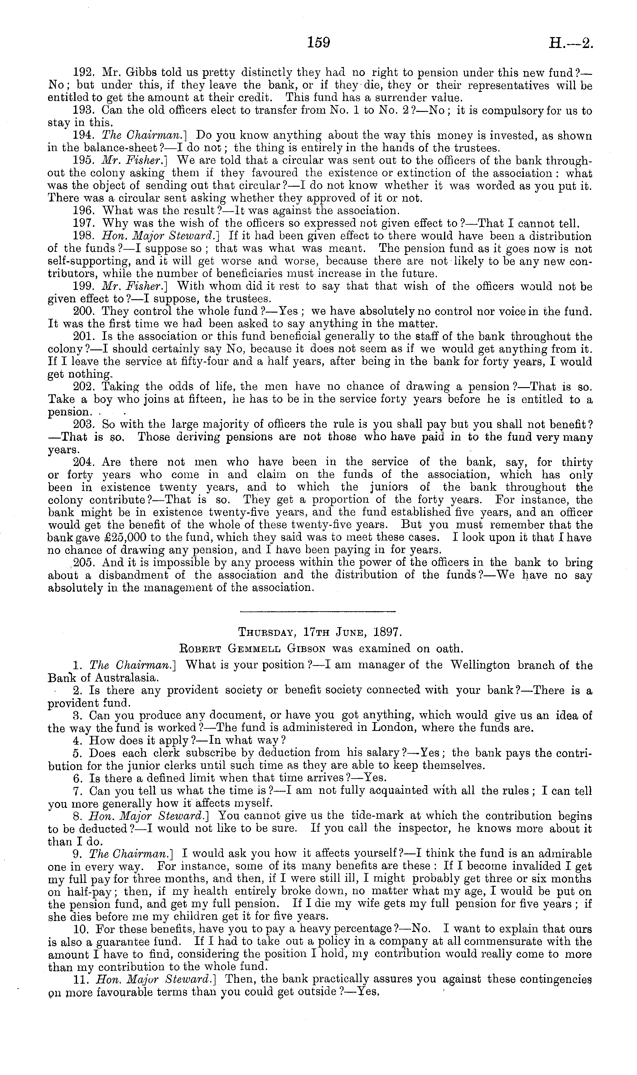 Thursday, 17th June, 1897. Eobert Gemmell Gibson was examined on oath. 1. The Chairman.] What is your position ?—lam manager of the Wellington branch of the Bank of Australasia. 2. Is there any provident society or benefit society connected with your bank?— There is a provident fund. 3. Can you produce any document, or have you got anything, which would give us an idea of the way the fund is worked? —The fund is administered in London, where the funds are. 4. How does it apply? —In what way? 5. Does each clerk subscribe by deduction from his salary?— Yes; the bank pays the contribution for the junior clerks until such time as they are able to keep themselves. 6. Is there a defined limit when that time arrives ?—Yes. 7. Can you tell us what the time is ? —I am not fully acquainted with all the rules ; I can tell you more generally how it affects myself. 8. Hon. Major Steward.] You cannot give us the tide-mark at which the contribution begins to be deducted ?—I would not like to be sure. If you call the inspector, he knows more about it than I do. 9. The Chairman.] I would ask you how it affects yourself?—l think the fund is an admirable one in every way. For instance, some of its many benefits are these :If I become invalided I get my full pay for three months, and then, if I were still ill, I might probably get three or six months on half-pay; then, if my health entirely broke down, no matter what my age, I would be put on the pension fund, and get my full pension. If I die my wife gets my full pension for five years ; if she dies before me my children get it for five years. 10. For these benefits, have you to pay a heavy percentage ? —No. I want to explain that ours is also a guarantee fund. If I had to take out a policy in a company at all commensurate with the amount I have to find, considering the position I hold, my contribution would really come to more than my contribution to the whole fund. 11. Hon. Major Steward.] Then, the bank practically assures you against these contingencies pn more favourable terms than you could get outside ?—Yes,