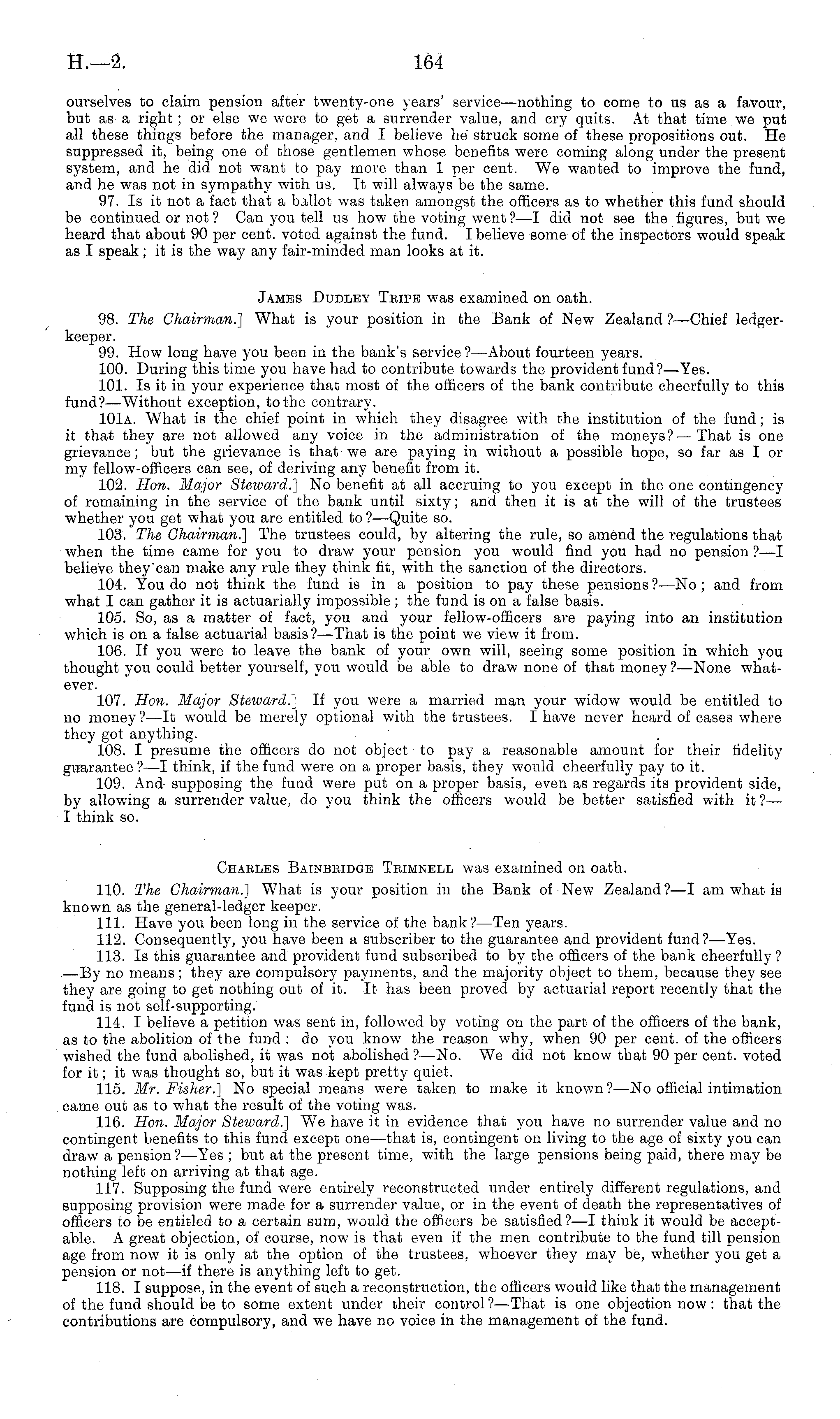 ourselves to claim pension after twenty-one years' service—nothing to come to us as a favour, but as a right; or else we were to get a surrender value, and cry quits. At that time we put all these things before the manager, and I believe he struck some of these propositions out. He suppressed it, being one of those gentlemen whose benefits were coming along under the present system, and he did not want to pay more than 1 per cent. We wanted to improve the fund, and he was not in sympathy with us. It will always be the same. 97. Is it not a fact that a ballot w T as taken amongst the officers as to whether this fund should be continued or not? Can you tell us how the voting went?—l did not see the figures, but we heard that about 90 per cent, voted against the fund. I believe some of the inspectors would speak as I speak; it is the way any fair-minded man looks at it. James Dudley Tripe was examined on oath. 98. The Chairman.] What is your position in the Bank of New Zealand ?—Chief ledgerkeeper. 99. How long have you been in the bank's service ?—About fourteen years. 100. During this time you have had to contribute towards the provident fund?— Yes. 101. Is it in your experience that most of the officers of the bank contribute cheerfully to this fund?— Without exception, to the contrary. 101 a. What is the chief point in which they disagree with the institution of the fund; is it that they are not allowed any voice in the administration of the moneys?— That is one grievance; but the grievance is that we are paying in without a possible hope, so far as lor my fellow-officers can see, of deriving any benefit from it. 102. Hon. Major Steward.] No benefit at all accruing to you except in the one contingency of remaining in the service of the bank until sixty; and then it is at the will of the trustees whether you get what you are entitled to?— Quite so. 103. The Chairman.] The trustees could, by altering the rule, so amend the regulations that when the time came for you to draw your pension you would find you had no pension ?—I believe they'can make any rule they think fit, with the sanction of the directors. 104. You do not think the fund is in a position to pay these pensions ?—No ; and from what I can gather it is actuarially impossible; the fund is on a false basis. 105. So, as a matter of fact, you and your fellow-officers are paying into an institution which is on a false actuarial basis?— That is the point we view it from. 106. If you were to leave the bank of your own will, seeing some position in which you thought you could better yourself, you would be able to draw none of that money ?—None whatever. 107. Hon. Major Steward.] If you were a married man your widow would be entitled to no money ?—lt would be merely optional with the trustees. I have never heard of cases where they got anything. 108. I presume the officers do not object to pay a reasonable amount for their fidelity guarantee ? —I think, if the fund were on a proper basis, they would cheerfully pay to it. 109. And- supposing the fund were put on a proper basis, even as regards its provident side, by allowing a surrender value, do you think the officers would be better satisfied with it ?— I think so. Charles Bainbridge Trimnell was examined on oath. 110. The Chairman.] What is your position in the Bank of New Zealand?—l am what is known as the general-ledger keeper. 111. Have you been long in the service of the bank? —Ten years. 112. Consequently, you have been a subscriber to the guarantee and provident fund ?—Yes. 113. Is this guarantee and provident fund subscribed to by the officers of the bank cheerfully? —By no means; they are compulsory payments, and the majority object to them, because they see they are going to get nothing out of it. It has been proved by actuarial report recently that the fund is not self-supporting. 114. I believe a petition was sent in, followed by voting on the part of the officers of the bank, as to the abolition of the fund : do you know the reason why, when 90 per cent, of the officers wished the fund abolished, it was not abolished ?—No. We did not know that 90 per cent, voted for it; it was thought so, but it was kept pretty quiet. 115. Mr. Fisher.] No special means were taken to make it known?—No official intimation came out as to what the result of the voting was. 116. Hon. Major Steward.] We have it in evidence that you have no surrender value and no contingent benefits to this fund except one —that is, contingent on living to the age of sixty you can draw a pension ? —Yes ; but at the present time, with the large pensions being paid, there may be nothing left on arriving at that age. 117. Supposing the fund were entirely reconstructed under entirely different regulations, and supposing provision were made for a surrender value, or in the event of death the representatives of officers to be entitled to a certain sum, would the officers be satisfied?—l think it would be acceptable. A great objection, of course, now is that even if the men contribute to the fund till pension age from now it is only at the option of the trustees, whoever they may be, whether you get a pension or not—if there is anything left to get. 118. I suppose, in the event of such a reconstruction, the officers would like that the management of the fund should be to some extent under their control?— That is one objection now : that the contributions are compulsory, and we have no voice in the management of the fund.
