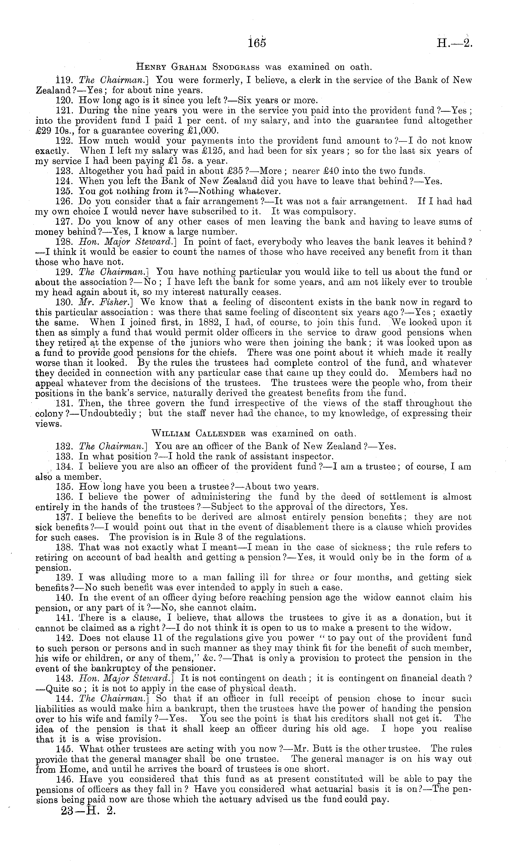 Henry Graham Snodgrass was examined on oath. 119. The Chairman.] You were formerly, I believe, a clerk in the service of the Bank of New Zealand ?—Yes ; for about nine years. 120. How long ago is it since you left ?—Six years or more. 121. During the nine years you were in the service you paid into the provident fund?— Yes ; into the provident fund I paid 1 per cent, of my salary, and into the guarantee fund altogether £29 10s., for a guarantee covering £1,000. 122. How much would your payments into the provident fund amount to ?—I do not know exactly. When I left my salary was £125, and had been for six years ; so for the last six years of my service I had been paying £1 ss. a year. 123. Altogether you had paid in about £35 ? —More ; nearer £40 into the two funds. 124. When you left the Bank of New Zealand did you have to leave that behind?— Yes. 125. You got nothing from it ?—Nothing whatever. 126. Do you consider that a fair arrangement ? —lt was not a fair arrangement. If I had had my own choice I would never have subscribed to it. It was compulsory. 127. Do you know of any other cases of men leaving the bank and having to leave sums of money behind ?—Yes, I know a large number. 128. Hon. Major Steward.] In point of fact, everybody who leaves the bank leaves it behind ? —I think it would be easier to count the names of those who have received any benefit from it than those who have not. 129. The Chairman.] You have nothing particular you would like to tell us about the fund or about the association ?—No ; I have left the bank for some years, and am not likely ever to trouble my head again about it, so my interest naturally ceases. 130. Mr. Fisher.] We know that a feeling of discontent exists in the bank now in regard to this particular association : was there that same feeling of discontent six years ago ?—Yes ; exactly the same. When I joined first, in 1882, I had, of course, to join this fund. We looked upon it then as simply a fund that would permit older officers in the service to draw good pensions when they retired at the expense of the juniors who were then joining the bank; it was looked upon as a fund to provide good pensions for the chiefs. There was one point about it which made it really worse than it looked. By the rules the trustees had complete control of the fund, and whatever they decided in connection with any particular case that came up they could do. Members had no appeal whatever from the decisions of the trustees. The trustees were the people who, from their positions in the bank's service, naturally derived the greatest benefits from the fund. 131. Then, the three govern the fund irrespective of the views of the staff throughout the colony ? —Undoubtedly ; but the staff never had the chance, to my knowledge, of expressing their views. William Callender was examined on oath, 132. The Chairman.] You are an officer of the Bank of New Zealand ?—Yes. 133. In what position ? —I hold the rank of assistant inspector. 134. I believe you are also an officer of the provident fund ?—I am a trustee; of course, lam also a member. 135. How long have you been a trustee? —About two years. 136. I believe the power of administering the fund by the deed of settlement is almost entirely in the hands of the trustees ? —Subject to the approval of the directors, Yes. 137. I believe the benefits to be derived are almost entirely pension benefits; they are not sick benefits? —I would point out that in the event of disablement there is a clause which provides for such cases. The provision is in Eule 3of the regulations. 138. That was not exactly what I meant —I mean in the case of sickness; the rule refers to retiring on account of bad health and getting a pension ? —Yes, it would only be in the form of a pension. 139. I was alluding more to a man falling ill for three or four months, and getting sick benefits? —No such benefit was ever intended to apply in such a case. 140. In the event of an officer dying before reaching pension age the widow cannot claim his pension, or any part of it ?—No, she cannot claim. 141. There is a clause, I believe, that allows the trustees to give it as a donation, but it cannot be claimed as a right ?—I do not think it is open to us to make a present to the widow. 142. Does not clause 11 of the regulations give you power " to pay out of the provident fund to such person or persons and in such manner as they may think fit for the benefit of such member, his wife or children, or any of them," &c. ? —That is only a provision to protect the pension in the event of the bankruptcy of the pensioner. 143. Hon. Major Steward.] It is not contingent on death ; it is contingent on financial death ? —Quite so ; it is not to apply in the case of physical death. 144. The Chairman.] So that if an officer in full receipt of pension chose to incur such liabilities as would make him a bankrupt, then the trustees have the power of handing the pension over to his wife and family ?—Yes. You see the point is that his creditors shall not get it. The idea of the pension is that it shall keep an officer during his old age. I hope you realise that it is a wise provision. 145. What other trustees are acting with you now ?—Mr. Butt is the other trustee. The rules provide that the general manager shall be one trustee. The general manager is on his way out from Home, and until he arrives the board of trustees is one short. 146. Have you considered that this fund as at present constituted will be able to pay the pensions of officers as they fall in? Have you considered what actuarial basis it is on?— The pensions being paid now are those which the actuary advised us the fund could pay. 23-H. 2.