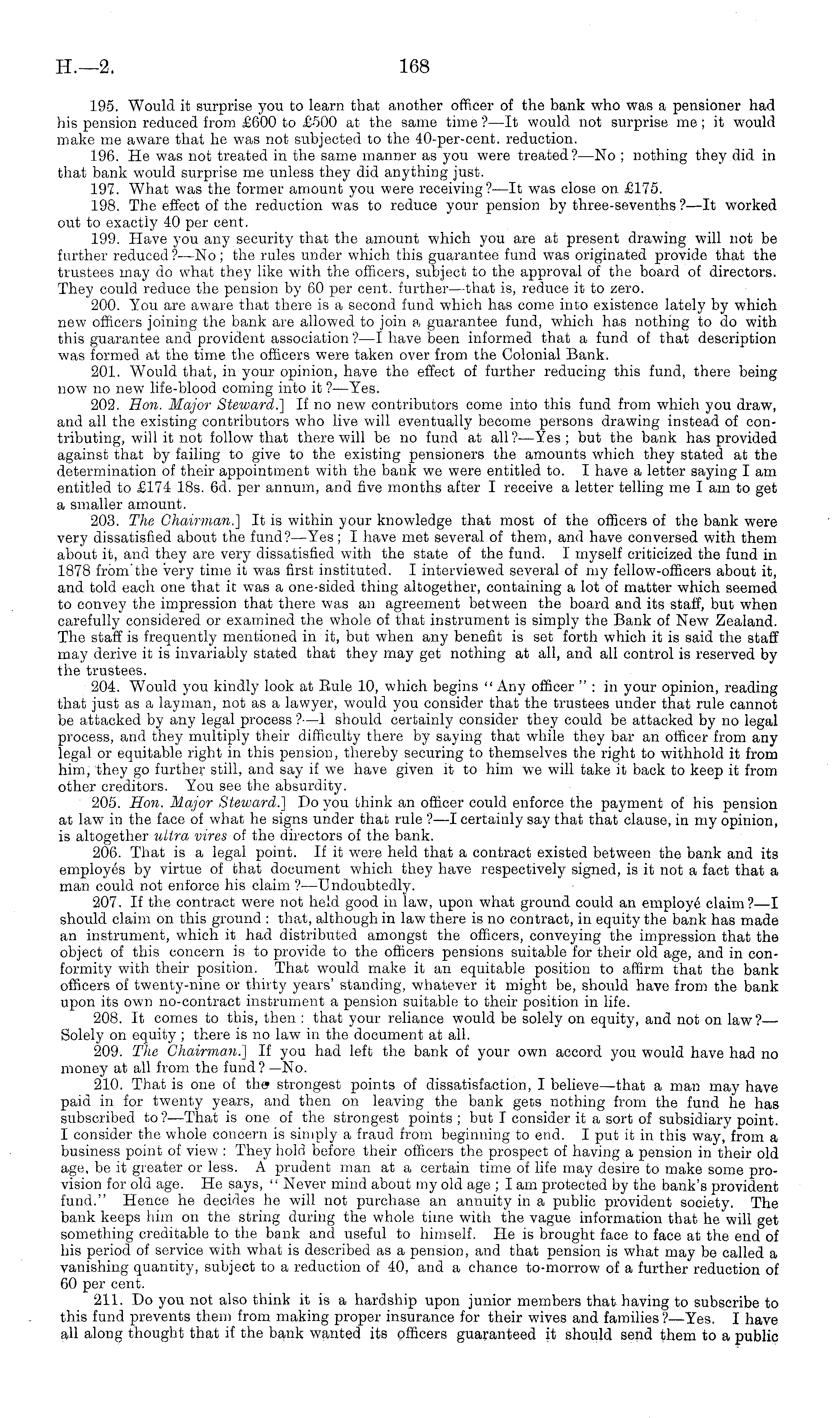 195. Would it surprise you to learn that another officer of the bank who was a pensioner had his pension reduced from £600 to £500 at the same time ? —lt would not surprise me; it would make me aware that he was not subjected to the 40-per-cent. reduction. 196. He was not treated in the same manner as you were treated?—No ; nothing they did in that bank would surprise me unless they did anything just. 197. What was the former amount you were receiving? —It was close on £175. 198. The effect of the reduction was to reduce your pension by three-sevenths ?—lt worked out to exactly 40 per cent. 199. Have you any security that the amount which you are at present drawing will not be further reduced ?—No ; the rules under which this guarantee fund was originated provide that the trustees may do what they like with the officers, subject to the approval of the board of directors. They could reduce the pension by 60 per cent, further—that is, reduce it to zero. 200. You are aware that there is a second fund which has come into existence lately by which new officers joining the bank are allowed to join a guarantee fund, which has nothing to do with this guarantee and provident association ?—I have been informed that a fund of that description was formed at the time the officers were taken over from the Colonial Bank. 201. Would that, in your opinion, have the effect of further reducing this fund, there being now no new life-blood coming into it ? —Yes. 202. Hon. Major Steward.] If no new contributors come into this fund from which you draw, and all the existing contributors who live will eventually become persons drawing instead of contributing, will it not follow that there will be no fund at all? —Yes; but the bank has provided against that by failing to give to the existing pensioners the amounts which they stated at the determination of their appointment with the bank we were entitled to. I have a letter saying lam entitled to £174 18s. 6d. per annum, and five months after I receive a letter telling me I am to get a smaller amount. 203. The Chairman.] It is within your knowledge that most of the officers of the bank were very dissatisfied about the fund?— Yes; I have met several of them, and have conversed with them about it, and they are very dissatisfied with the state of the fund. I myself criticized the fund in 1878 frbm'the very time it was first instituted. I interviewed several of my fellow-officers about it, and told each one that it was a one-sided thing altogether, containing a lot of matter which seemed to convey the impression that there was an agreement between the board and its staff, but when carefully considered or examined the whole of that instrument is simply the Bank of New Zealand. The staff is frequently mentioned in it, but when any benefit is set forth which it is said the staff may derive it is invariably stated that they may get nothing at all, and all control is reserved by the trustees. 204. Would you kindly look at Eule 10, which begins " Any officer " : in your opinion, reading that just as a layman, not as a lawyer, would you consider that the trustees under that rule cannot be attacked by any legal process ? —1 should certainly consider they could be attacked by no legal process, and they multiply their difficulty there by saying that while they bar an officer from any legal or equitable right in this pension, thereby securing to themselves the right to withhold it from him, they go further still, and say if we have given it to him we will take it back to keep it from other creditors. You see the absurdity. 205. Hon. Major Steward.] Do you think an officer could enforce the payment of his pension at law in the face of what he signs under that rule ?—I certainly say that that clause, in my opinion, is altogether ultra vires of the directors of the bank. 206. That is a legal point. If it were held that a contract existed between the bank and its employes by virtue of that document which they have respectively signed, is it not a fact that a man could not enforce his claim ?—Undoubtedly. 207. If the contract were not held good in law, upon what ground could an employe claim?—l should claim on this ground : that, although in law there is no contract, in equity the bank has made an instrument, which it had distributed amongst the officers, conveying the impression that the object of this concern is to provide to the officers pensions suitable for their old age, and in conformity with their position. That would make it an equitable position to affirm that the bank officers of twenty-nine or thirty years' standing, whatever it might be, should have from the bank upon its own no-contract instrument a pension suitable to their position in life. 208. It comes to this, then : that your reliance would be solely on equity, and not on law?— Solely on equity ; there is no law in the document at all. 209. The Chairman.] If you had left the bank of your own accord you would have had no money at all from the fund ? —No. 210. That is one of the? strongest points of dissatisfaction, I believe—that a man may have paid in for twenty years, and then on leaving the bank gets nothing from the fund he has subscribed to?— That is one of the strongest points ; but I consider it a sort of subsidiary point. I consider the whole concern is simply a fraud from beginning to end. I put it in this way," from a business point of view : They hold before their officers the prospect of having a pension in their old age, be it greater or less. A prudent man at a certain time of life may desire to make some provision for old age. He says, " Never mind about my old age ;I am protected by the bank's provident fund." Hence he decides he will not purchase an annuity in a public provident society. The bank keeps him on the string during the whole time with the vague information that he will get something creditable to the bank and useful to himself. He is brought face 