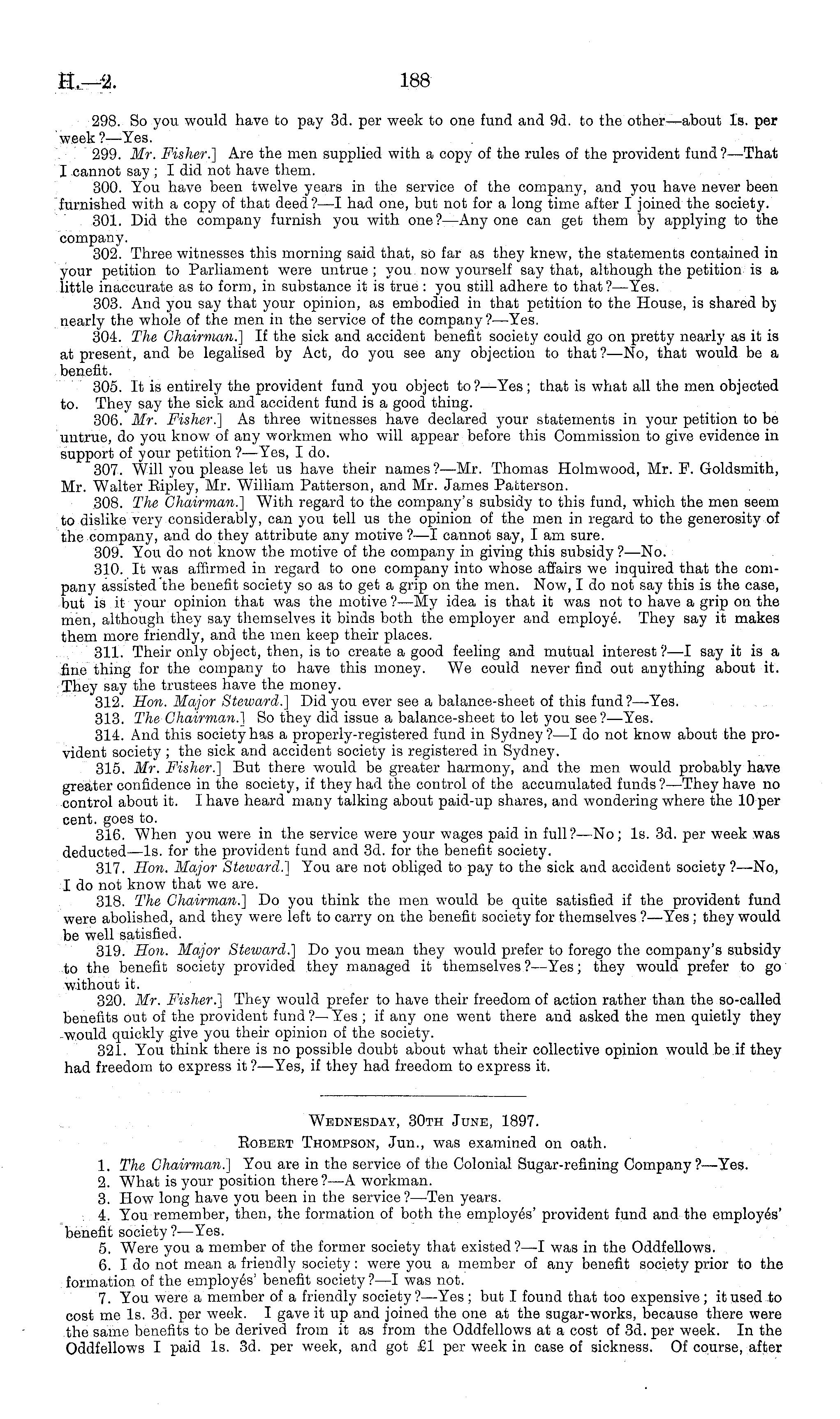 Wednesday, 30th June, 1897. Eobert Thompson, Jun., was examined on oath. 1. The Chairman.] You are in the service of the Colonial Sugar-refining Company ?—Yes. 2. What is your position there? —A workman. 3. How long have you been in the service?— Ten years. 4. You remember, then, the formation of both the employes' provident fund and the employes' benefit society ?—Yes. 5. Were you a member of the former society that existed?—l was in the Oddfellows. 6. I do not mean a friendly society : were you a member of any benefit society prior to the formation of the employes' benefit society ? —I was not. 7. You were a member of a friendly society ?—Yes ; but I found that too expensive; it used to cost me Is. 3d. per week. I gave it up and joined the one at the sugar-works, because there were the same benefits to be derived from it as from the Oddfellows at a cost of 3d. per week. In the Oddfellows I paid Is. 3d. per week, and got £1 per week in case of sickness. Of course, after