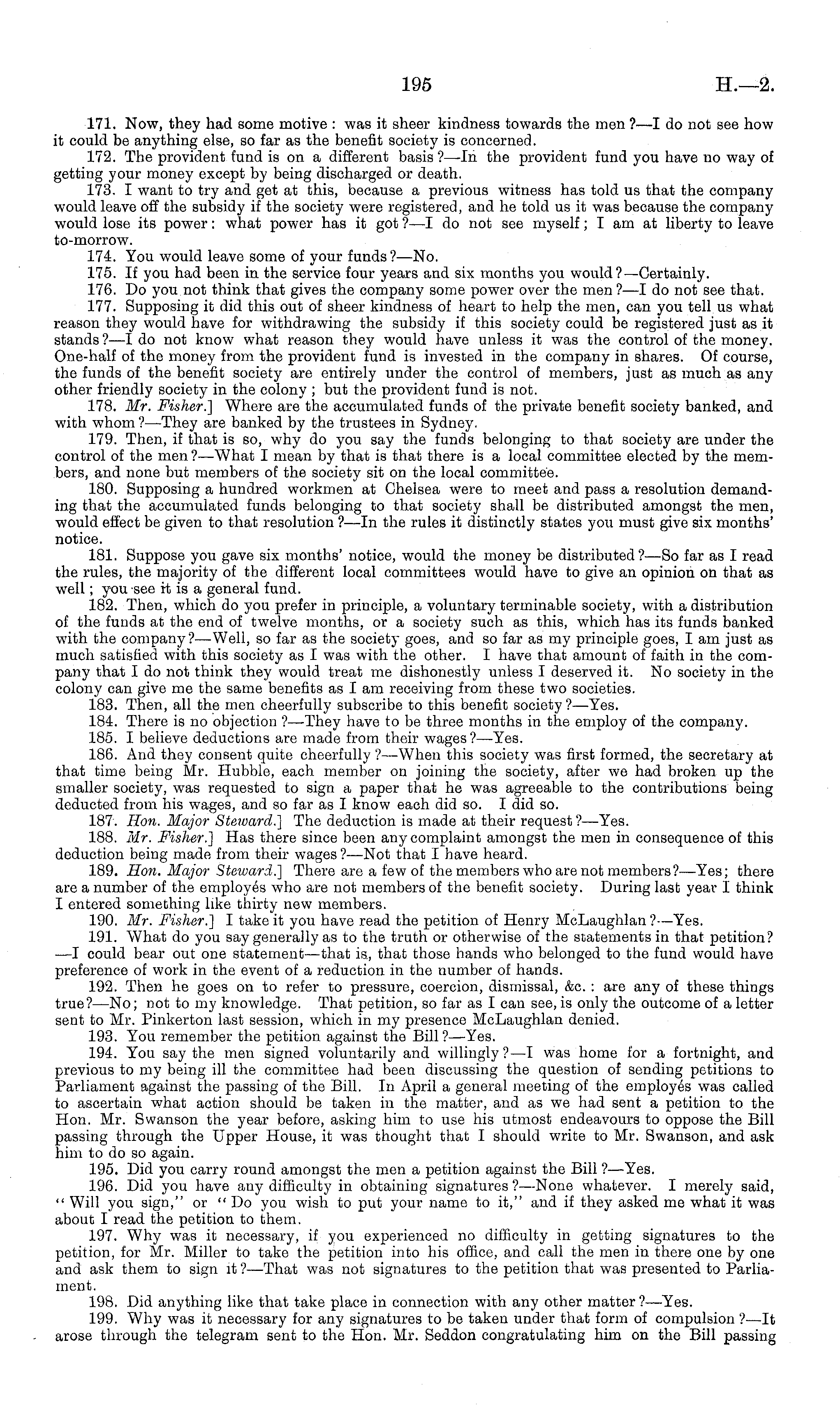 171. Now, they had some motive : was it sheer kindness towards the men ?—I do not see how it could be anything else, so far as the benefit society is concerned. 172. The provident fund is on a different basis ? —ln the provident fund you have no way of getting your money except by being discharged or death. 173. I want to try and get at this, because a previous witness has told us that the company would leave off the subsidy if the society were registered, and he told us it was because the company would lose its power: what power has it got ?—I do not see myself; I am at liberty to leave to-morrow. 174. You would leave some of your funds ? —No. 175. If you had been in the service four years and six months you would?— Certainly. 176. Do you not think that gives the company some power over the men? —I do not see that. 177. Supposing it did this out of sheer kindness of heart to help the men, can you tell us what reason they would have for withdrawing the subsidy if this society could be registered just as it stands?—l do not know what reason they would have unless it was the control of the money. One-half of the money from the provident fund is invested in the company in shares. Of course, the funds of the benefit society are entirely under the control of members, just as much as any other friendly society in the colony ; but the provident fund is not. 178. Mr. Fisher.] Where are the accumulated funds of the private benefit society banked, and with whom ?—They are banked by the trustees in Sydney. 179. Then, if that is so, why do you say the funds belonging to that society are under the control of the men ?—What I mean by that is that there is a local committee elected by the members, and none but members of the society sit on the local committee. 180. Supposing a hundred workmen at Chelsea were to meet and pass a resolution demanding that the accumulated funds belonging to that society shall be distributed amongst the men, would effect be given to that resolution ?—ln the rules it distinctly states you must give six months' notice. 181. Suppose you gave six months' notice, would the money be distributed?—So far as I read the rules, the majority of the different local committees would have to give an opinion on that as well; you see it is a general fund. 182. Then, which do you prefer in principle, a voluntary terminable society, with a distribution of the funds at the end of twelve months, or a society such as this, which has its funds banked with the company? —Well, so far as the society goes, and so far as my principle goes, I am just as much satisfied with this society as I was with the other. I have that amount of faith in the company that Ido not think they would treat me dishonestly unless I deserved it. No society in the colony can give me the same benefits as I am receiving from these two societies. 183. Then, all the men cheerfully subscribe to this benefit society ?—Yes. 184. There is no objection ?—They have to be three months in the employ of the company. 185. I believe deductions are made from their wages? —Yes. 186. And they consent quite cheerfully ? —When this society was first formed, the secretary at that time being Mr. Hubble, each member on joining the society, after we had broken up the smaller society, was requested to sign a paper that he was agreeable to the contributions being deducted from his wages, and so far as I know each did so. I did so. 187. Hon. Major Steward.] The deduction is made at their request? —Yes. 188. Mr. Fisher.] Has there since been any complaint amongst the men in consequence of this deduction being made from their wages?— Not that I have heard. 189. Hon. Major Steward.] There are a few of the members who are not members?— Yes; there are a number of the employes who are not members of the benefit society. During last year I think I entered something like thirty new members. 190. Mr. Fisher.] I take it you have read the petition of Henry McLaughlan ? —Yes. 191. What do you say generally as to the truth or otherwise of the statements in that petition? —I could bear out one statement—that is, that those hands who belonged to the fund would have preference of work in the event of a reduction in the number of hands. 192. Then he goes on to refer to pressure, coercion, dismissal, &c. : are any of these things true? —No; not to my knowledge. That petition, so far as I can see, is only the outcome of a letter sent to Mr. Pinkerton last session, which in my presence McLaughlan denied. 193. You remember the petition against the Bill ?—-Yes. 194. You say the men signed voluntarily and willingly?—l was home for a fortnight, and previous to my being ill the committee had been discussing the question of sending petitions to Parliament against the passing of the Bill. In April a general meeting of the employes was called to ascertain what action should be taken in the matter, and as we had sent a petition to the Hon. Mr. Swanson the year before, asking him to use his utmost endeavours to oppose the Bill passing through the Upper House, it was thought that I should write to Mr. Swanson, and ask him to do so again. 195. Did you carry round amongst the men a petition against the Bill ?—Yes. 196. Did you have any difficulty in obtaining signatures ?—None whatever. I merely said, " Will you sign," or " Do you wish to put your name to it," and if they asked me what it was about I read the petition to them. 197. Why was it necessary, if you experienced no difficulty in getting signatures to the petition, for Mr. Miller to take the petition into his office, and call the men in there one by one and ask them to sign it ?—That was not signatures to the petition that was presented to Parliament. 198. Did anything like that take place in connection with any other matter?— Yes. 199. Why was it necessary for any signatures to be taken under that form of compulsion ?—lt arose through the telegram sent to the Hon. 