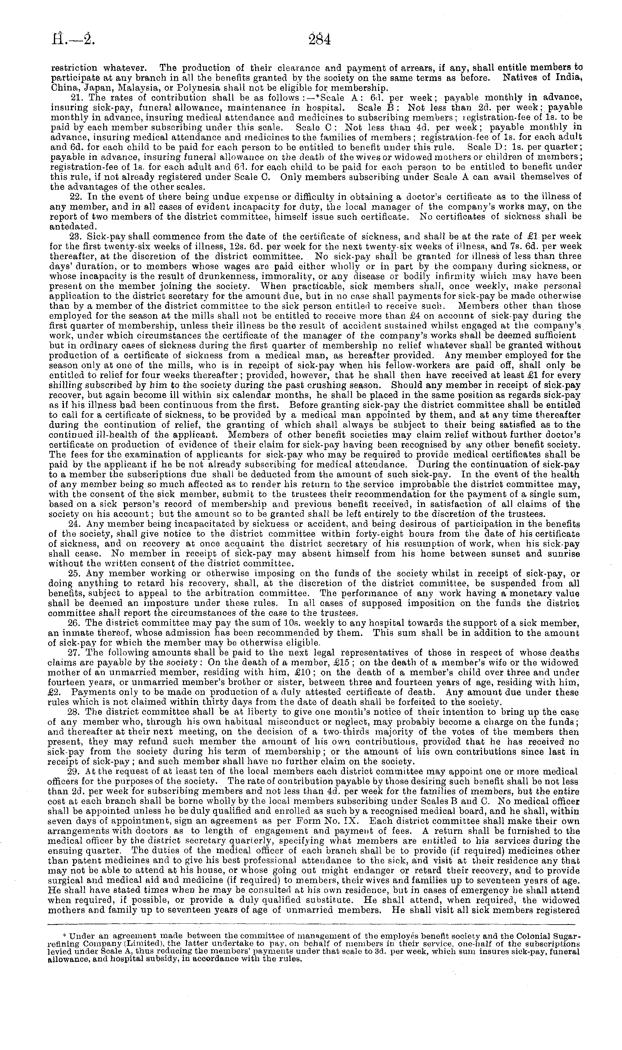 restriction whatever. The production of their clearance and payment of arrears, if any, shall entitle members to participate at any branch in all the benefits granted by the society on the same terms as before. Natives of India, China, Japan, Malaysia, or Polynesia shall not be eligible for membership. 21. The rates of contribution shall be as follows :—*Scale A: 6il. per week; payable monthly in advance, insuring sick-pay, funeral allowance, maintenance in hospital. Scale B : Not less than 2d. per week; payable monthly in advance, insuring medical attendance and medicines to subscribing members; legistration-fee of Is. to be paid by each member subscribing under this scale. Scale C: Not less than 4d. per week; payable monthly in advance, insuring medical attendance and medicines to the families of members; registration-fee of Is. for each adult and 6d. for each child to be paid for each person to be entitled to benefit under this rule. Scale I): Is. per quarter; payable in advance, insuring funeral allowance on the death of the wives or widowed mothers or children of members ; registration-fee of Is. for each adult and 61. for each child to be paid for each person to be entitled to benefit under this rule, if not already registered under Scale C. Only members subscribing under Scale A can avail themselves of the advantages of the other scales. 22. In the event of there being undue expense or difficulty in obtaining a doctor's certificate as to the illness of any member, and in all cases of evident incapacity for duty, the local manager of the company's works may, on the report of two members of the district committee, himself issue such certificate. No certificates of sickness shall be antedated. 23. Sick-pay shall commence from the date of the certificate of sickness, and shall be at the rate of £1 per week for the first twenty-six weeks of illness, 12s. 6d. per week for the next twenty-six weeks of illness, and 7s. 6d. per week thereafter, at the discretion of the district committee. No sick-pay shall be granted for illness of less than three days' duration, or to members whose wages are paid either wholly or in part by the company during sickness, or whose incapacity is the result of drunkenness, immorality, or any disease or bodily infirmity which may have been present on the member joining the society. When practicable, sick members shall, once weekly, make personal application to the district secretary for the amount due, but in no case shall payments for sick-pay be made otherwise than by a member of the district committee to the sick person entitled to receive such. Members other than those employed for the season at the mills shall not be entitled to receive more than £4 on account of sick-pay during the first quarter of membership, unless their illness be the result of accident sustained whilst engaged at the company's work, under which circumstances the certificate of the manager of the company's works shall be deemed sufficient but in ordinary cases of sickness during the first quarter of membership no relief whatever shall be granted without production of a certificate of sickness from a medical man, as hereafter provided. Any member employed for the season only at one of the mills, who is in receipt of sick-pay when his fellow-workers are paid off, shall only be entitled to relief for four weeks thereafter ; provided, however, that he shall then have received at least £1 for every shilling subscribed by him to the society during the past crushing season. Should any member in receipt of sick-pay recover, but again become ill within six calendar months, he shall be placed in the same position as regards sick-pay as if his illness bad been continuous from the first. Before granting sick-pay the district committee shall be entitled to call for a certificate of sickness, to be provided by a medical man appointed by them, and at any time thereafter during the continution of relief, the granting of which shall always be subject to their being satisfied as to the continued ill-health of the applicant. Members of other benefit societies may claim relief without further doctor's certificate on production of evidence of their claim for sick-pay having been recognised by any other benefit society. The fees for the examination of applicants for sick-pay who may be required to provide medical certificates shall be paid by the applicant if he be not already subscribing for medical attendance. During the continuation of sick-pay to a member the subscriptions due shall be deducted from the amount of such sick-pay. In the event of the health of any member being so much affected as to render his return to the service improbable the district committee may, with the consent of the sick member, submit to the trustees their recommendation for the payment of a single sum, based on a sick person's record of membership and previous benefit received, in satisfaction of all claims of the society on his account; but the amount so to be granted shall be left entirely to tbe discretion of the trustees. 24. Any member being incapacitated by sickness or accident, and being desirous of participation in the benefits of the society, shall give notice to the district committee within forty-eight hours from the date of his certificate of sickness, and on recovery at once acquaint the district secretary of his resumption of work, when his sickpay shall cease. No member in receipt of sick-pay may absent himself from his home between sunset and sunrise without the written consent of the district committee. 25. Any member working or otherwise imposing on the funds of the society whilst in receipt of sick-pay, or doing anything to retard his recovery, shall, at the discretion of the district committee, be suspended from all benefits, subject to appeal to the arbitration committee. The performance of any work having a monetary value shall be deemed an imposture under these rules. In all cases of supposed imposi