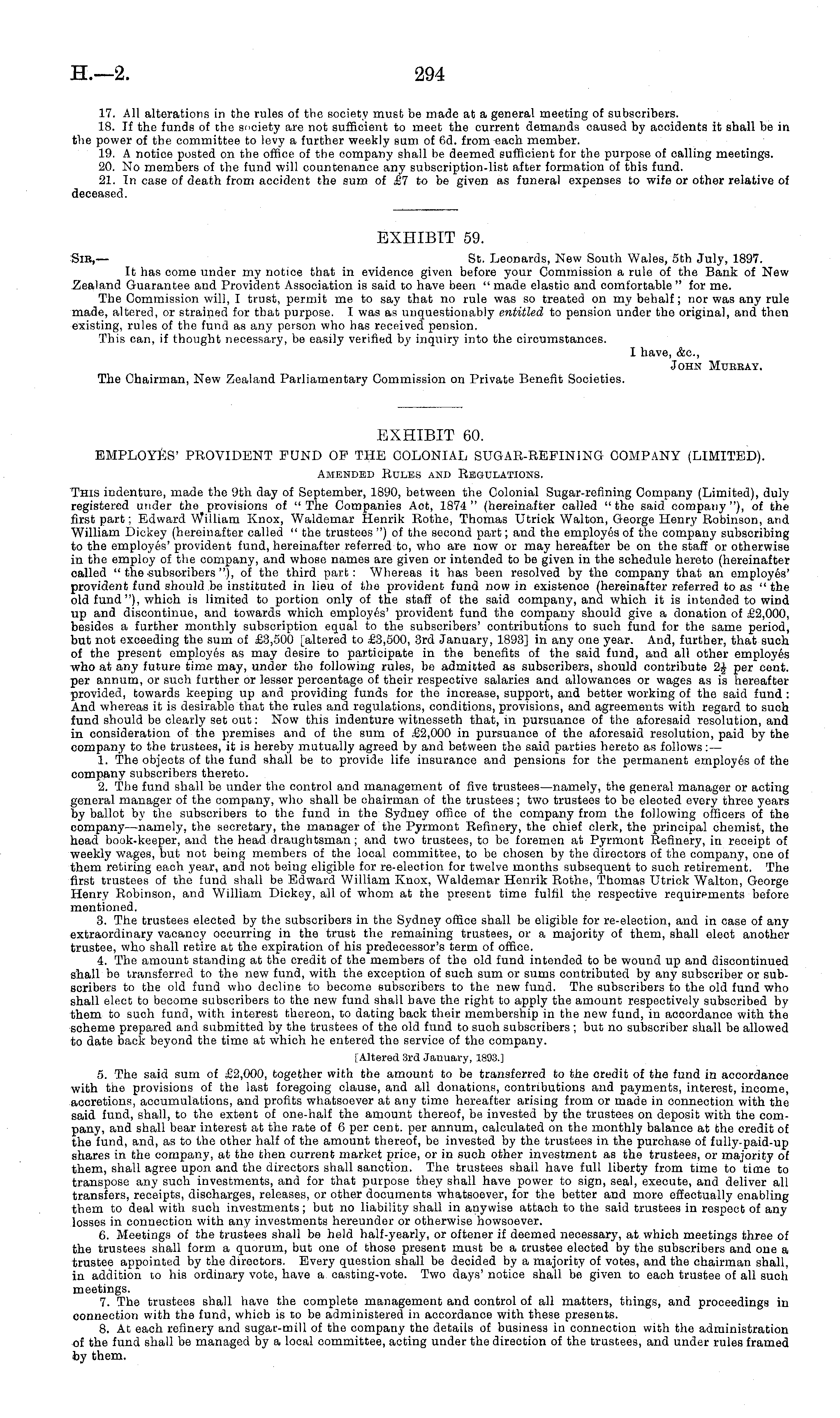 EXHIBIT 60. EMPLOYES' PROVIDENT FUND OF THE COLONIAL SUGAR-REFINING COMPANY (LIMITED). Amended Rules and Regulations. This indenture, made the 9th day of September, 1890, between the Colonial Sugar-refining Company (Limited), duly registered under the provisions of "The Companies Act, 1874" (hereinafter called "the said company"), of the first part; Edward William Knox, Waldemar Henrik Rothe, Thomas Utrick Walton, George Henry Robinson, and William Dickey (hereinafter called " the trustees ") of the second part; and the employes of the company subscribing to the employes' provident fund, hereinafter referred to, who are now or may hereafter be on the staff or otherwise in the employ of the company, and whose names are given or intended to be given in the schedule hereto (hereinafter called " the -subscribers "), of the third part: Whereas it has been resolved by the company that an employes' provident fund should be instituted in lieu of the provident fund now in existence (hereinafter referred to as " the old fund"), which is limited to portion only of the staff of the said company, and which it is intended to wind up and discontinue, and towards which employes' provident fund the company should give a donation of £2,000, besides a further monthly subscription equal to the subscribers' contributions to such fund for the same period, but not exceeding the sum of £3,500 [altered to £3,500, 3rd January, 1893] in any one year. And, further, that such of the present employes as may desire to participate in the benefits of the said fund, and all other employes who at any future time may, under the following rules, be admitted as subscribers, should contribute 2J per cent. per annum, or such further or lesser percentage of their respective salaries and allowances or wages as is hereafter provided, towards keeping up and providing funds for the increase, support, and better working of the said fund : And whereas it is desirable that the rules and regulations, conditions, provisions, and agreements with regard to such fund should be clearly set out: Now this indenture witnesseth that, in pursuance of the aforesaid resolution, and in consideration of the premises and of the sum of £2,000 in pursuance of the aforesaid resolution, paid by the company to the trustees, it is hereby mutually agreed by and between the said parties hereto as follows: — 1. The objects of the fund shall be to provide life insurance and pensions for the permanent employes of the company subscribers thereto. 2. The fund shall bo under the control and management of five trustees—namely, the general manager or acting general manager of the company, who shall be chairman of the trustees; two trustees to be elected every three years by ballot by the subscribers to the fund in the Sydney office of the company from the following officers of the company —namely, the secretary, the manager of the Pyrmont Refinery, the chief clerk, the principal chemist, the head book-keeper, and the head draughtsman ; and two trustees, to be foremen at Pyrmont Refinery, in receipt of weekly wages, but not being members of the local committee, to be chosen by the directors of the company, one of them retiring each year, and not being eligible for re-election for twelve months subsequent to such retirement. The first trustees of the fund shall be Edward William Knox, Waldemar Henrik Rothe, Thomas Utrick Walton, George Henry Robinson, and William Dickey, all of whom at the present time fulfil the respective requirements before mentioned. 3. The trustees elected by the subscribers in the Sydney office shall be eligible for re-election, and in case of any extraordinary vacancy occurring in the trust the remaining trustees, or a majority of them, shall elect another trustee, who shall retire at the expiration of his predecessor's term of office. 4. The amount standing at the credit of the members of the old fund intended to be wound up and discontinued shall be transferred to the new fund, with the exception of such sum or sums contributed by any subscriber or subscribers to the old fund who decline to become subscribers to the new fund. The subscribers to the old fund who shall elect to become subscribers to the new fund shall have the right to apply the amount respectively subscribed by them to such fund, with interest thereon, to dating back their membership in the new fund, in accordance with the scheme prepared and submitted by the trustees of the old fund to such subscribers ; but no subscriber shall be allowed to date back beyond the time at which he entered the service of the company. [Altered 3rd January, 1893.] 5. The said sum of £2,000, together with the amount to be transferred to the credit of the fund in accordance with tne provisions of the last foregoing clause, and all donations, contributions and payments, interest, income, accretions, accumulations, and profits whatsoever at any time hereafter arising from or made in connection with the said fund, shall, to the extent of one-half the amount thereof, be invested by the trustees on deposit with the company, and shall bear interest at the rate of 6 per cent, per annum, calculated on the monthly balance at the credit of the fund, and, as to the other half of the amount thereof, be invested by the trustees in the purchase of fully-paid-up shares in the company, at the then current market price, or in such other investment as the trustees, or majority of them, shall agree upon and the directors shall sanction. The trustees shall have full liberty from time to time to transpose any such investments, and for that purpose they shall have power to sign, seal, execute, and deliver all transfers, receipts, discharges, releases, or other documents whatsoever, for the better and more effectually enabling them to deal with such investments ; but no liability shall in anywise attach to the said trustees in respect of any losses in connection with any investments hereunder or otherwise howso