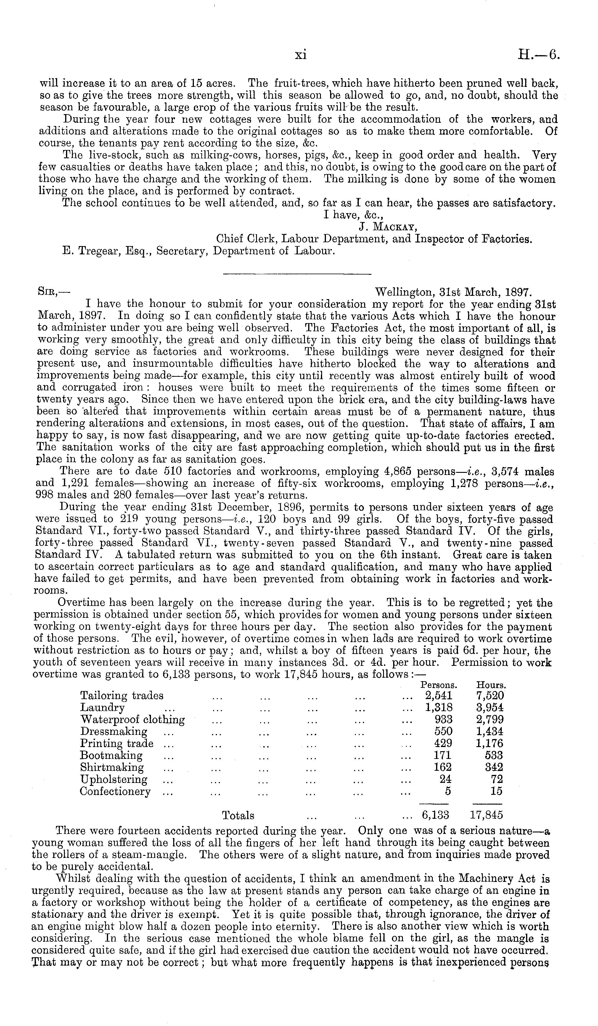 Sik,— Wellington, 31st March, 1897. I have the honour to submit for your consideration my report for the year ending 31st March, 1897. In doing so I can confidently state that the various Acts which I have the honour to administer under you are being well observed. The Factories Act, the most important of all, is working very smoothly, the great and only difficulty in this city being the class of buildings that are doing service as factories and workrooms. These buildings were never designed for their present use, and insurmountable difficulties have hitherto blocked the way to alterations and improvements being made—for example, this city until recently was almost entirely built of wood and corrugated iron : houses were built to meet the requirements of the times some fifteen or twenty years ago. Since then we have entered upon the brick era, and the city building-laws have been so altered that improvements within certain areas must be of a permanent nature, thus rendering alterations and extensions, in most cases, out of the question. That state of affairs, lam happy to say, is now fast disappearing, and we are now getting quite up-to-date factories erected. The sanitation works of the city are fast approaching completion, which should put us in the first place in the colony as far as sanitation goes. There are to date 510 factories and workrooms, employing 4,865 persons— i.e., 3,574 males and 1,291 females—showing an increase of fifty-six workrooms, employing 1,278 persons— i.e., 998 males and 280 females —over last year's returns. During the year ending 31st December, 1896, permits to persons under sixteen years of age were issued to 219 young persons— i.e., 120 boys and 99 girls. Of the boys, forty-five passed Standard VI., forty-two passed Standard V., and thirty-three passed Standard IV. Of the girls, forty-three passed Standard VI., twenty-seven passed Standard V., and twenty-nine passed Standard IV. A tabulated return was submitted to you on the 6th instant. Great care is taken to ascertain correct particulars as to age and standard qualification, and many who have applied have failed to get permits, and have been prevented from obtaining work in factories and workrooms. Overtime has been largely on the increase during the year. This is to be regretted; yet the permission is obtained under section 55, which provides for women and young persons under sixteen working on twenty-eight days for three hours per day. The section also provides for the payment of those persons. The evil, however, of overtime comes in when lads are required to work overtime without restriction as to hours or pay; and, whilst a boy of fifteen years is paid 6d. per hour, the youth of seventeen years will receive in many instances 3d. or 4d. per hour. Permission to work overtime was granted to 6,133 persons, to work 17,845 hours, as follows: — Persons. Hours. Tailoring trades ... ... ... ... ... 2,541 7,520 Laundry ... ... ... ... ... ... 1,318 3,954 Waterproof clothing ... ... ... ... ... 933 2,799 Dressmaking ... ... ... ... ... ... 550 1,434 Printing trade ... ... ... ... ... ... 429 1,176 Bootmaking ... ... ... ... ... ... 171 533 Shirtmaking ... ... ... ... ... ... 162 342 Upholstering ... ... ... ... ... ... 24 72 Confectionery ... ... ... ... ... ... 5 15 Totals ... ... ... 6,133 17,845 There were fourteen accidents reported during the year. Only one was of a serious nature—a young woman suffered the loss of all the fingers of her left hand through its being caught between the rollers of a steam-mangle. The others were of a slight nature, and from inquiries made proved to be purely accidental. Whilst dealing with the question of accidents, I think an amendment in the Machinery Act is urgently required, because as the law at present stands any person can take charge of an engine in a factory or workshop without being the holder of a certificate of competency, as the engines are stationary and the driver is exempt. Yet it is quite possible that, through ignorance, the driver of an engine might blow half a dozen people into eternity. There is also another view which is worth considering. In the serious case mentioned the whole blame fell on the girl, as the mangle is considered quite safe, and if the girl had exercised due caution the accident would not have occurred. That may or may not be correct; but what more frequently happens is that inexperienced persons