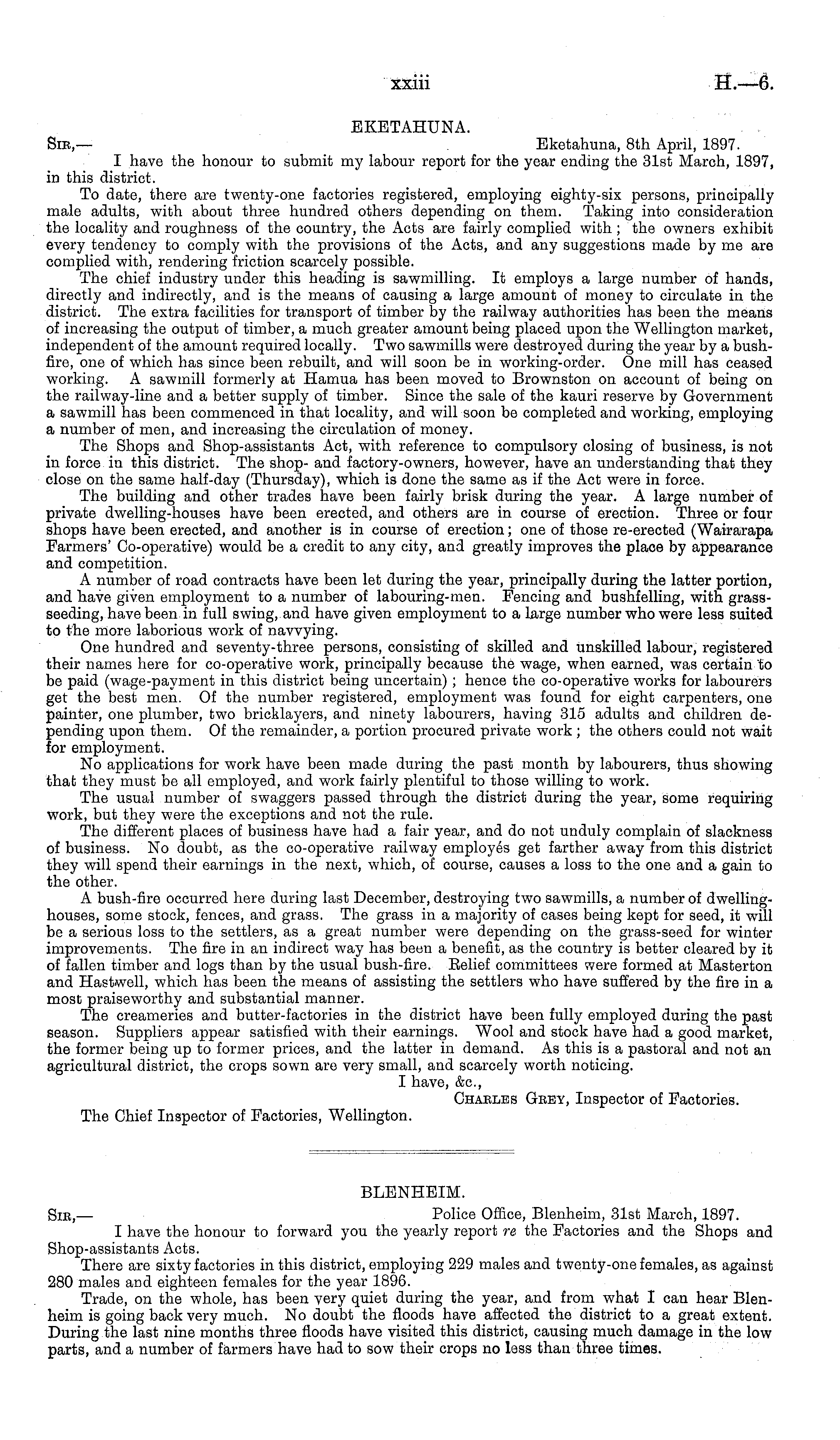 BLENHEIM. Sib, — Police Office, Blenheim, 31st March, 1897. I have the honour to forward you the yearly report re the Factories and the Shops and Shop-assistants Acts. There are sixty factories in this district, employing 229 males and twenty-one females, as against 280 males and eighteen females for the year 1896. Trade, on the whole, has been yery quiet during the year, and from what I can hear Blenheim is going back very much. No doubt the floods have affected the district to a great extent. During the last nine months three floods have visited this district, causing much damage in the low parts, and a number of farmers have had to sow their crops no less than three times.