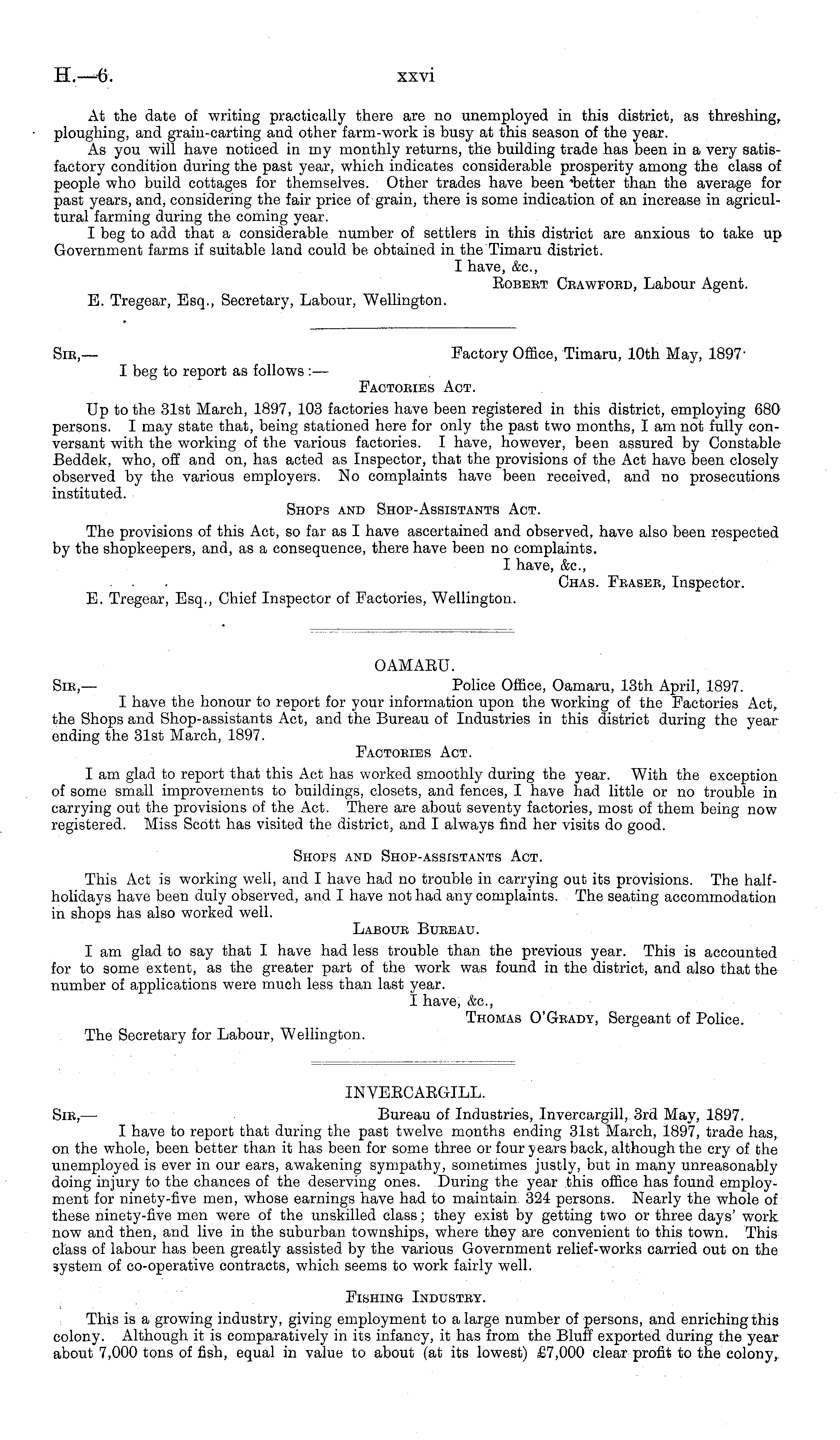 INVEECAEGILL. Sib, — Bureau of Industries, Invercargill, 3rd May, 1897. I have to report that during the past twelve months ending 31st March, 1897, trade has, on the whole, been better than it has been for some three or four years back, although the cry of the unemployed is ever in our ears, awakening sympathy, sometimes justly, but in many unreasonably doing injury to the chances of the deserving ones. During the year this office has found employment for ninety-five men, whose earnings have had to maintain 324 persons. Nearly the whole of these ninety-five men were of the unskilled class; they exist by getting two or three days' work now and then, and live in the suburban townships, where they are convenient to this town. This class of labour has been greatly assisted by the various Government relief-works carried out on the system of co-operative contracts, which seems to work fairly well. Pishing Industey. This is a growing industry, giving employment to a large number of persons, and enriching this colony. Although it is comparatively in its infancy, it has from the Bluff exported during the year about 7,000 tons of fish, equal in value to about (at its lowest) £7,000 clear profit to the colony,