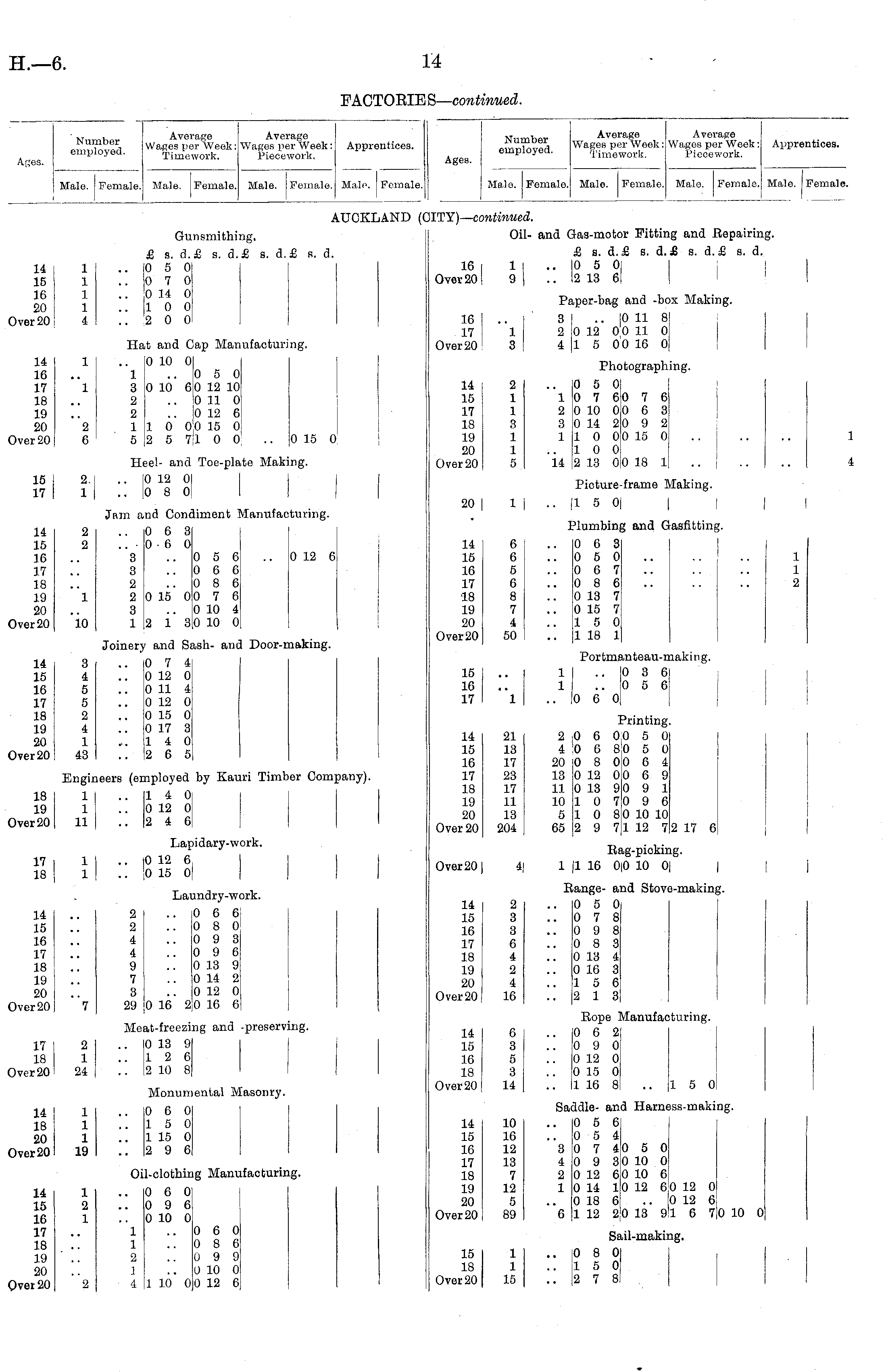 Number employed. Average Wages per Week: Tiniowork. Average "Wages per Week: Piecework. Apprentices. Number employed. Average "Wages per Week: Timework. Average Wages por Week: Piecework. Apprentices. Ages. Ages. Male. I Female. I Male. Female. Male. Female. Malo. Female. Malo. Female. Male. Female. Malo. Female. Male. Female. auok: ,AND (i JITY) — continued. ig and Repairing. £ s. d.£ s. d. 14 15 16 20 lver20 1 1 1 1 4 1 1 1 1 4 Gunsmi thing. £ s. a.£ s. d.£ s. d.£ r. d. 0 5 0l 0 7 0 0 14 0 10 0 2 0 0 Oil- and Gas-motor Fittin £ a. d.£ s. d. 16 I 1 ..050 Over20J 9 .. 2 13 6 Paper-bag and -bo 3x Making. Ha at and Cap Manufacturing. 16 3 .. [0 11 8 17 1 2 0 12 0 0 11 0 Over20 3 4 1 5 00 16 0 1 3 14 16 17 18 19 20 iver20 1 1 1 3 2 2 2 1 6 5 0 10 0 .. 0 S 0 0 10 60 12 10 .. lo 11 0 .. JO 12 6 1 0 00 15 0i 2 5 7,1 0 0 .. 0 15 0 Photograph 14 2 ..050 15 1 1076076 17 1 2 0 10 00 6 3 18 3 30 14 2092 19 1 1 1 0 00 15 0 20 1 ..100 Over20 5 14 2 13 00 18 1 ing. I 1 15 17 H( 2. .. 1 .. and Toe-plate Making. 0 12 0 0 8 0 Picture-frame 1 taking. 4 20 I 1 I .. [1 5 0| I I 14 15 16 17 18 19 20 lver20 Jam a ind Condiment Manufacturing. 2 2 3 3 2 1 2 3 10 1 0 6 3 0 • 6 O .. 0 5 6 .. 0 12 6 ..066 ..086 0 15 0 0 7 6 .. 0 10 4 2 1 3 0 10 0 Plumbing and G rasfitting. ! 14 6 ..063 15 6 ..050 16 6 ..067 17 6 ..086 18 8 .. 0 13 7 19 7 .. 0 15 7 20 4 ..150 Over20 50 .. 1 18 1 I 1 1 2 Joinery y and Sash- and Door-making. Door-: taking. 14 15 16 17 18 19 20 iver20 3 4 5 5 2 4 1 43 0 7 4 0 12 0 0 11 4 0 12 0 0 15 0 0 17 3 14 0 2 6 5 Portmanteau-n 15 1 ..036 16 1 ..056 17 1 ..060 inteau-n 0 3 6 0 5 6 Printing. P 5 0 0 5 0 0 6 4 0 6 9 0 9 1 0 9 6 0 10 10 1 12 7 taking. 18 19 iver20 Engineers (en 1 1 11 mployed by Kauri Timber Company). 14 0 0 12 0 2 4 6 by Kairi Tim ier Com iany). Printing 14 21 2 0 6 00 5 0 15 13 4 !0 6 80 5 0 16 17 20 p 8 00 6 4 17 23 13 0 12 00 6 9 18 17 11 0 13 90 9 1 19 11 10 1 0 70 9 6 20 13 5 1 0 80 10 10 Over 20 204 65 2 9 71 12 7 2 17 6 Lapidary-work. iidary-w< irk. Rag-pickir Over 20 J 4| 1 |1 16 Op 10 0j ig-pickir |0 10 0] ig17 18 11 :: ! |0 12 6 JO 15 0! I I Laundry-work. Eange- and Stovi 14 2 ..050 15 3 ..078 16 3 ..098 17 6 ..083 18 4 .. 0 13 4 19 2 .. 0 16 3 20 4 ..156 Over20 16 ..213 nd Stove 3-making. 14 15 16 17 18 19 20 lver20 undry-W( 0 6 6! 0 8 0 0 9 3 0 9 6 0 13 9 !o 14 2 10 12 0 6 16 6 >rk. 2 2 4 4 9 7 3 7 29 .. 0 6 6! ..080 ..093 ..096 .. 0 13 9 .. 0 14 2 .. JO 12 0 0 16 2'0 16 6 17 18 iver20 Me( 2 1 24 2 1 24 iat-freezing and -preserving. 0 13 9 12 6 2 10 8 ng and -preservi ing. Eope Manufac 14 6 ..062 15 3 ..090 16 5 .. 0 12 0 18 3 .. 0 15 0 Over20 14 .. 1 16 8 !anufai ituring. Monumental Masonry. ental 15 0 14 18 20 lver20 1 1 1 19 .asonry. 1 1 1 19 0 6 0 15 0 1 15 0 2 9 6 Saddle- and Harne 14 10 ..056 15 16 ..054 16 12 3074050 17 13 4 0 9 30 10 0 18 7 2 0 12 60 10 6 19 12 10 14 ljO 12 6: 20 5 .. 0 18 6 0ver20 89 6 1 12 2 0 13 9 d Harm jss-makii 'g0 5 0 0 10 0 0 10 6 0 12 6 ; 1 2 1 Oi: il-clothing Manufacturing. ig Man; ifaoturi: *• 14 15 16 17 18 19 20 Iver 20 i 2 1 1 1 2 J 2 : 4 0 6 0 0 9 6 0 10 0 ..060 ..086 ..099 .. 0 10 0 |l 10 0 0 12 6 0 6 0 0 8 6 0 9 9 0 10 0 0 12 6 Sail-makii '0 13* 9 1 lil-makh ! 0 12 0 0 12 6 1 6 7| a S!o io o 15 1 .. |0 8 0 18 1 ..150 Over20 15 ..278 2