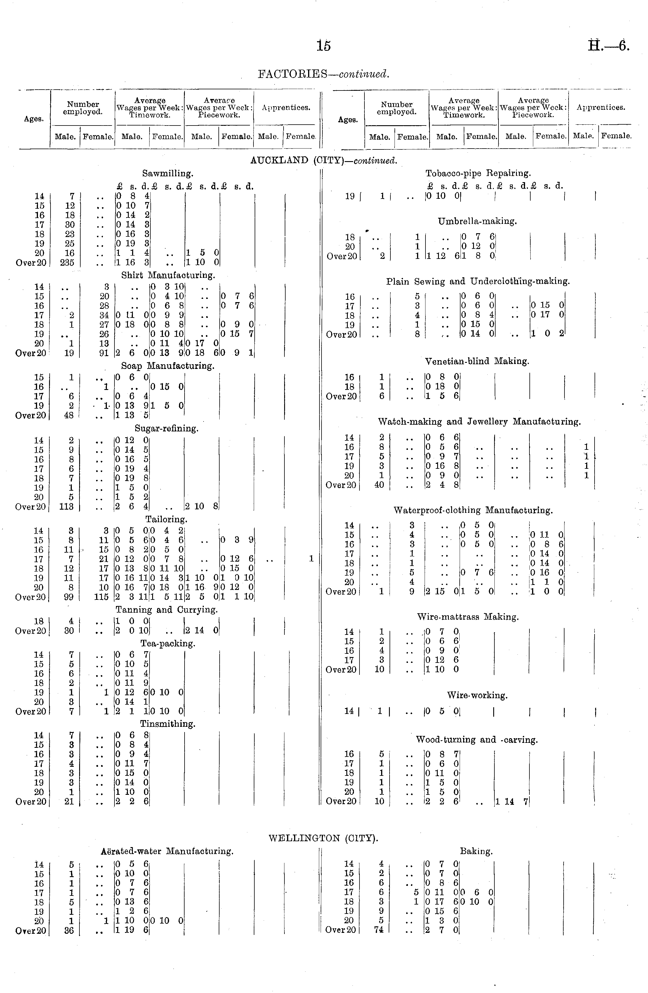 Number employed. Average Wages per Week: Timework. Averare Wages per Week: Piecework. Number employed. Average Wa,ges per Week: Timework. Average Wages Tier Week: Apprentices. Piecework. Apprentices. Ages. Ages. Male. Female. Male. Female. Male. Female. Male. Female Male. Female. Male. Female. Male. Female. Male. Female. AUCKLAND (< !ITY) — continued. 7 12 18 30 23 25 16 !35 Sawmilling. £ s. d.£ s. 6l.£ s. d.£ s. d, .. 0 8 41 .. 0 10 7 .. 0 14 2 .. 0 14 3 .. 0 16 3 .. 0 19 3 .. 114 .. 15 0 .. 1 16 3 .. 1 10 0 iwmilling. £ s. d.£ s. d. £ s. d. 1. Tobacco-pipe Repairing. £ s. d. £ s. d. £ s. d. £ s. d. 19 J 1 I .. |0 10 0| I I I 14 15 16 17 18 19 20 )ver20 7 12 18 30 23 25 16 235 Umbrella-making. 18 ' .. 1 ..0 7 6! 20 .. 1 .. 0 12 0 ; Over20 2 11 12 6180 15 0 1 10 0 Shirt Manufacturing. Manufac ;turing. Plain Sewing and Underclothing-making. 14 15 16 17 18 19 20 lver20 "2 1 '2 1 1 19 3 .. 0 3 10 20 .. 0 4 10 .. 0 7 £ 28 ..068 .. 0 7 £ 34 0 11 00 9 9 27 0 18 0088 .. 09C 26 .. 0 10 10 .. 0 15 7 13 .. 0 11 4 0 17 0 91 2 6 00 13 910 18 60 9 1 0 3 10 0 4 10 0 6 8 0 9 9 0 8 8 0 10 10 0 11 4 0 13 9! .. 0 7 6 0 7 6 0 9 0 0 15 7 6 6 0 7 1 Iβ .. 5 ..060 I I 17 .. 3 ..060 .. i0 15 0| 18 .. 4 ..084 |0 17 01 19 .. 1 .. 0 15 0 Over20 .. 8 , . 0 14 0 .. |l 0 2 1 19 0 17' 0 !0 18 6 0 9 1 Venetian-blind Making. 1 6 J I Soap Manufacturing. .. 0 6 0j 1 .. 0 15 0 ..064 ■ 1- 0 13 91 5 0 .. 1 13 5 Manufac ituring. 15 16 17 19 Ivor 20 1 16 1 ..080 18 1 .. 0 18 0 Over20 6 ..156 6 2 48 0 15 0 15 0 ;ar-refini Watch-making and Jewellery Manufacturing. Sugar-refining. ing. 14 15 16 17 18 19 20 iver20 2 9 8 6 7 1 5 113 2 9 8 6 7 1 5 .13 .. 0 12 0 .. 0 14 5 .. 0 16 5 .. 0 19 4 .. 0 19 8 ..150 ..152 .. 2 6 4 .. 2 10 8 14 2 ..066 16 8 ..056 17 5 ..097 19 3 .. 0 16 8 20 1 ..090 Over 20 40 ..248 1 1 1 1 2 10 8 Waterproof-clothing Manufacturing. 14 15 16 17 18 19 20 iver20 3 8 11 7 12 11 8 99 3 8 11 7 12 11 8 99 Tailoring. 3 0 5 0.0 4 2 11 0 5 60 4 6 .. 0 3 £ 15 0 8 20 5 0 21 0 12 00 7 8 .. 0 12 € 17 0 13 8 0 11 10 .. 0 15 C 17 0 16 110 14 31 10 01 0 1C 10 0 16 7 0 18 01 16 9 0 12 C 115 2 3 111 5 112 5 01 1 1C Cailoring 0 4 2 JO 4 6 0 5 0 0 7 8 0 11 10 0 14 3 0 18 0 1 5 11 r 0 3 ! 0 12 1 0 15 1 1 0 l< 0 12 1 1 1 l< 9 6 .. 0 0 0 0 14 .. 3 ..050 15 .. 4 ..050 .. 0 11 0 16 .. 3 ..0 5 0! ..086 17 1 .. .. .. 0 14 0 18 .. 1 .. .. .. 0 14 0 19 .. 5 ..076 .. 0 16 0 20 4 .. .. ..110 Over20 1 i 9 2 15 01 5 0 .. ! 1 0 0 I 1 10 0 1 16 9 2 5 0 18 >ver20 4 30 4 30 Tanning and Currying. .. 1 0 01 .. 2 0 10) .. 2 14 0 g and Ci [ urrying. Wire-matfcrass Making. ) - 2 14 0 14 1 ...0 7 0, 15 2 .. 0 6 6 1 16 4 .. 0 9 0 1 17 3 .. 0 12 6 Over20 10 .. 1 10 0 1 7 5 6 2 1 3 7 Tea-packing. ..067 .. 0 10 5 .. 0 11 4 .. 0 11 9 1 0 12 6 0 10 0 .. 0 14 1 1 |2 1 10 10 0 3a-paokii ng14 15 16 18 19 20 >ver20 7 5 6 2 1 3 7 0 10 0 Wire-working. 0 10 0 14 I 1 I .. |0 5 0, I I I ! 14 15 16 17 18 19 20 lver20 7 3 3 4 3 3 1 21 Tinsmithing. ..068 ..084 ..094 .. 0 11 7j .. 0 15 0 .. 0 14 0 .. 1 10 0! .. 2 2 6 nsmithh «• Wood-turning and -carving. 16 6 1 ..087 17 1 ..060 18 1 .. 0 11 0 19 1 ..15 0! 20 1 .. 1 5 0| Over20 10 ..226 .. 1 14 7| w rON (CITY). 1LLING , Aerated-water Manufacturing. Baking. 14 15 16 17 18 19 20 irer20 5 1 1 1 5 1 1 36 ..056 I .. 0 10 0 ..076 ..076 .. 0 13 6 ..126 1 1 10 0 0 10 0 .. 1 19 6 14 4 ..070 15 2 ..070 16 6 ..086 17 6 50 11 0060 18 3 1 0 17 6 0 10 0 19 9 .. 0 15 6 20 5 ..130 Over20 74 ..270