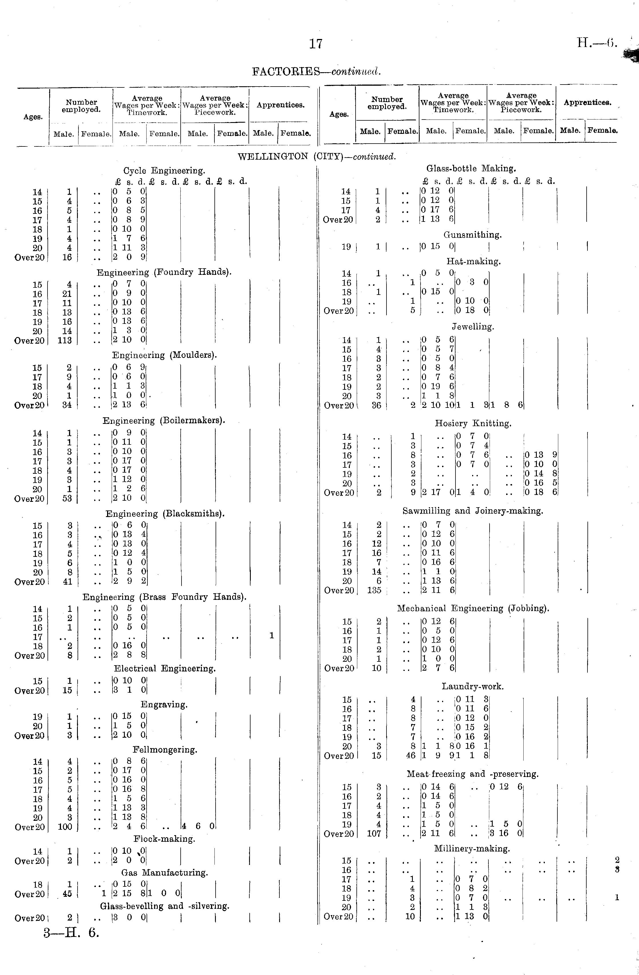 Number employed. Average Wages per Week: Timework. Average Wages per Week: Piecework. Apprentices. Number employed. Average Wages per Week: Timework. Average Wages per Week: Piecework. Apprentices. Ages. Ages. Male. Female. Male. Female. Male. Female. Male. Female. Male. Female. Male. Female. Male. Female. Male. Female. w: BLLI1 rGTON (' ilTY)— continued. Cycle Engine £ s. d. £ s. d. 14 1 ..050 15 4 ..063 16 5 ..085 17 I 4 .. 10 8 9 18 1 .. |0 10 0 19 4 ..176 20 4 .. 1 11 3 Over20 16 .. J2 0 9 iering. £ s. a. £ s. a. 14 1 15 1 17 4 Over 20 2 Glass-bottle Making. £ s. a. £ s. a. £ s. d. 0 12 0 0 12 0 0 17 6 1 13 6 jottle Making. £ s. a. £ s. d. £ s. d. Gunsmithing. msrnithi: I nsrnithing. 19 j 1 J |0 15 0| i •■ I Hat-making. I at-inakii at-making. Engineering (Foun< 15 4 ..070 16 21 ..090 17 11 .. 0 10 0 18 13 .. 0 13 6 19 16 .. 0 13 6 20 14 ..130 Over20 113 .. 2 10 0 (Foum Iry Hai .as). 14 1 16 18 1 19 Over 20 1 1 1 1 1 5 0 5 0 L ..030 0 15 0 L .. 0 10 0 j .. 0 18 0 0 3 0 1 "l 1 5 0 10 0 0 18 0 14 1 15 4 16 3 17 3 18 2 19 2 20 3 Over 20 I 36 1 4 3 3 2 2 3 36 :: 2 2 Jewelling. 0 5 6 !0 5 7 0 5 0 0 8 4 0 7 6 0 19 6 1 1 8 i 2 10 101 1318 6 1 1 Engineering (M 15 2 ..069 17 9 ..060 18 4 ..113 20 1 ..100. Over20 34 .. 2 13 6 :ring f Moulders) ig (BoiL 113 18 6 Engineering (Boil 14 1 ..090 15 1 .. 0 11 0 16 3 .. 0 10 0 17 3 .. 0 17 0 18 4 .. 0 17 0 19 3 .. 1 12 0 20 1 ..126 Over20 53 .. 2 10 0 srmakei :s). '2 -1 3 8 s 3 9 Hosiery Knitting. ery Knij tting. 14 15 16 17 19 20 Over 20 2 1 3 8 3 2 8 9 L I ..0 7 0' J .. 0 7 41 3 .. 0 7 6 ! .. i ..070.. i ; i ) 217 01 4 0 0 7 0' 0 7 4' 0 7 6 0 7 0 j • ■ (0 13 9 p 10 0 ;0 14 8 '0 16 5 ■0 18 6 • • ! 14 0 Engineering (Bla 15 3 ..060 16 3 ., 0 13 4 17 4 .. 0 13 0 18 5 .. 0 12 4 19 6 ..100 20 8 ..150 Over20 41 ..292 Saw: Sa\ wmilling and Joinery-ma] and Joii nery-ma] king. :ng (Blai iksmith: ')■ 14 2 15 2 16 12 17 16 18 7 19 14 20 6 Over 20 I 135 2 2 12 16 7 14 6 135 : t 0 7 0i 0 12 6 0 10 0! 0 11 6 0 16 6 110 1 13 6 2 11 6i Engineering (Brass Pc 14 1 .. 0 5 0; 15 2 ..050 16 1 ..050 17 18 2 .. 0 16 0 Over20 8 ..288 Engine Irass Pi iundry Mechi Med ihanical Engineering (Jot: Inginee: ing (Jo ibing). 15 2 16 1 17 1 18 2 20 1 Over 20 10 2 1 1 2 1 10 0 12 6 0 5 0 0 12 6 0 10 0 1 0 0 2 7 6 Electrical Engi ;al Bngi I ineering, 15 1 10 10 01 Over 20 15 .. |8 1 0| T7 1 v> rr**o TTi n . 1 15 I Ingravin: 15 .. j 16 .. 17 18 19 20 3 Over 20 15 ;; j 3 15 4 8 8 7 7 8 46 4 8 8 7 7 8 46 Laundry-work. t .. 0 11 3 3 .. 0 11 6 3 .. 0 12 0 7 .. 0 15 2 7 .. 0 16 2 3 1 1 80 16 li 3 1 9 91 1 81 >rk. Engravin: 19 I 1 .. 0 15 0 20 1 ..150 Over20 3 .. 2 10 0 1 1 3 £• Fellmonger •ing. lmonge: 14 4 ..086 15 2 .. 0 17 0 16 5 .. 0 16 0 17 5 .. 0 16 8 18 4 ..156 19 4 .. 1 18 8 20 3 .. 1 13 8 Over20 100 ..246 4 2 5 5 4 4 3 100 15 3 16 2 17 4 18 4 19 4 Over 20 107 3 2 4 4 4 107 Mei M [eat freezing and -preserv: 0 14 6j .. 0 12 6 0 14 6 1 5 0 1 r> 0 15 0 ..150 2 11 6 .. 3 16 0 ing. 4 6 0 Flock-maki ing. 14 1 .. 0 10 x 0 Over20 2 ..200 Gas Manufad 18 1 j .. 0 15 0 Over20 .45 | 1 [2 15 81 0 0 1 2 Millinery-making. 1 45 "l turing. I i 15 16 17 18 19 20 Over 20 1 4 3 2 10 1 4 3 2 10 ..070 t ..082 i ..070.. ! ..113 ) .. 1 13 0 2 3 1 Glass-bevelling anc Over20l 2 ) .. |3 0 0| ] 2 Gli a d -silvering. ! 1