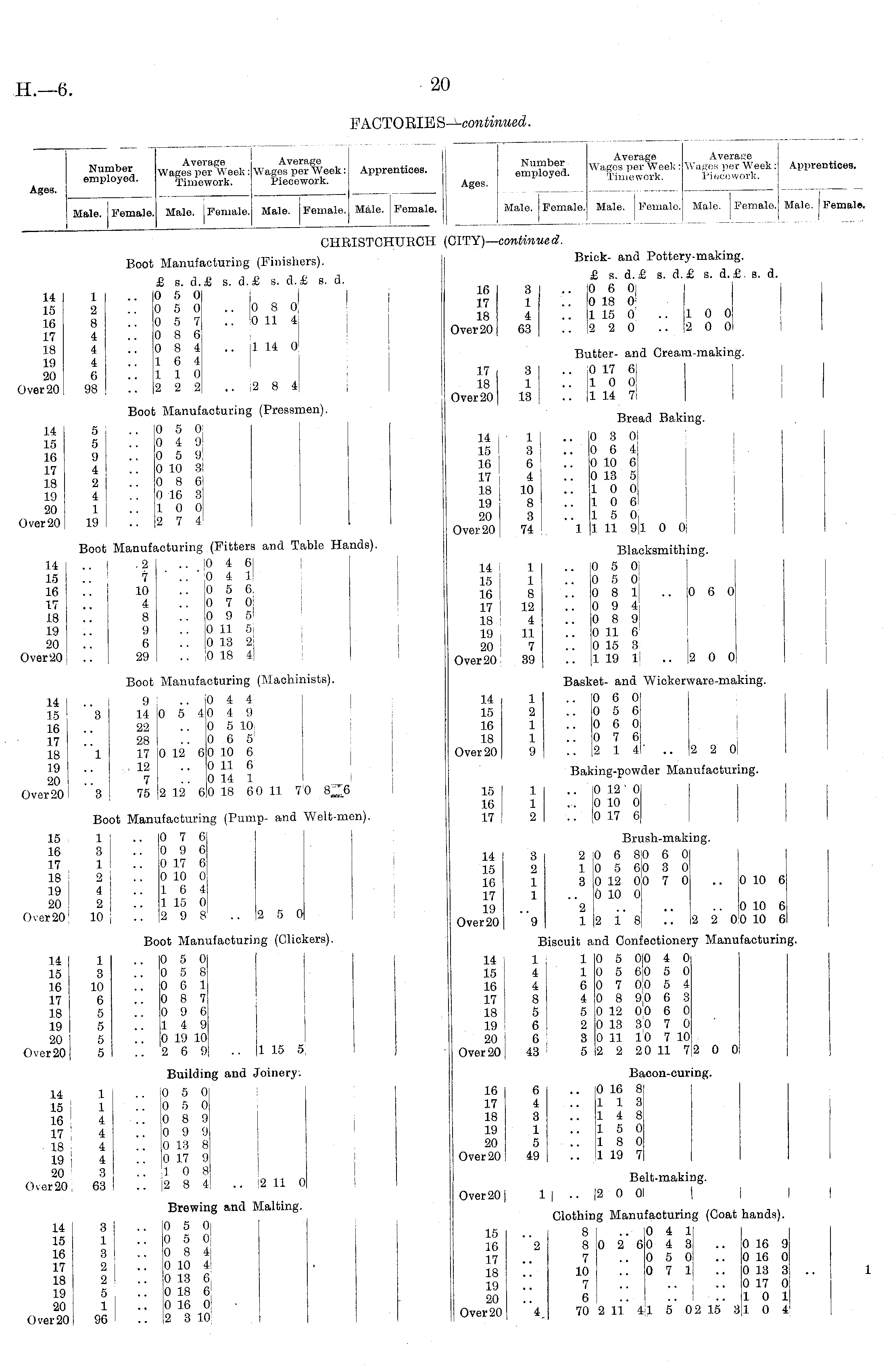Average Average Wages per Week: Wages per Week: Tirnework. Piecework. Number employed. Average "Wages per W T eek: Tlrnework. Average Wages per W r eek: Apprentices. Piecework. Number employed. Apprentices. Ages. [ee. Male. Female. i Male. Female. Male. Female. "I Male. Female. . - -■ Male. Female. Male. Femalo. Malo. Female. Male. Female. Male. Female. GHRISTCHURGH (CITY)— continued. 14 15 16 17 18 19 20 Over 20 1 I 2 8 4 4 4 6 98 1 I 2 8 4 4 4 6 98 Boot 1 1 1 1 i Manufacturing (Finishers). £ s. d.£ s. d.£ s. d.£ e. d. 0 5 0| 0 5 0 ..080 0 5 7 .. |0 11 4 0 8 6 0 8 4 .. 1 14 0 16 4 1 1 0 J2 2 2| ..,2 8 4 j Brick- and Pottery-making. £ s. d.£ s. d.£ s. d.£ s. d. 16 3 .. 10 6 0: 17 1 .. 0 18 0 18 4 .. 1 15 0 ..100 Over20 63 .. |2 2 0 .. !2 0 01 Butter- and Cream-making. 17 3 .. 10 17 61 18 1 ..lOOi Over20 13 .. 1 14 7; Boot t Manufacturing (Pressmen). Bread Baking. 14 15 16 17 18 19 20 Over 20 I 9 4 ! 2 4 1 19 I 9 4 ! 2 4 1 19 " 0 5 0 0 4 9| 0 5 9! 0 10 3| 0 8 6i 0 16 3 10 0 2 7 4 14 I II .. 0 3 01 15 ! 3 .. 0 6 4j 16 j 6 .. 0 10 6 17 4 .. 0 13 5 18 10 ..10 0; 19 8 ! ..10 6! 20 3 ..150, Over 20 74 1 1 11 91 0 0| ing. 14 15 16 17 18 19 20 Over 20 Boot Boot ; Manufs .2 7 10 4 8 9 6 29 acturing (Fitters and Table Hands). .. JO 4 61 [ ' .. ' 0 4 l! .. 0 5 6, .. 0 7 Oj .. 0 9 51 .. 0 11 51 .. 0 13 2; .. 10 18 i\ Blaeksmithing. 14 1 .. 0 5 0i 15 I 1 ..0 5 0; 16 8 .. 0 8 lj ..060 17 I 12 ..0 9 4, 18 4 ..0 8 9; 19 11 .. 0 11 6 20 7 .. 0 15 3 Over20 39 .. 1 19 l| ..200 ■ing. 0 6 0 2 0 0 Boot ■> Manufacturing (Machinists). Basket- and Wickerware-making. ware-making. 1 14 15 16 17 18 19 20 Over20 3 1 3 3 1 3 9 14 22 28 17 12 7 75 .. 0 4 4 0 5 40 4 9 .. 0 5 10 .. 0 6 5 0 12 6 0 10 6 .. 0 11 6 .. 0 14 1 2 12 60 18 60 11 70 8^6 14 1 ..060 15 2 ..056 16 1 ..060 18 1 ..076 Over20 9 .. 2 1 41' .. 2 2 0| 2 2 0! Baking-powder Manufacturing. 15 1 .. 10 12' 0 16 1 ... 0 10 0 17 2 .. i0 17 6 ier Ma; mfactur; ing. in ). 1 1 2 B01 Bo Dot Mam iufacturing (Pump- and Welt-men). 15 16 17 18 j 19 20 ! Over 201 1 I 2 10 1 3 1 2 4 2 10 0 7 6 0 9 6 0 17 6 0 10 0 16 4 1 15 0 2 9 S ..250 Brush-making. 14 3 2 0 6 8;0 6 0 15 2 1 0 5 6;0 3 0 16 1 3 0 12 00 7 0 .. 0 10 6 17 1 .. 0 10 0 19 . 2 .. .. .. j0 10 6 Over20 "9 12 18 .. 2 2 o'o 10 6 3 2 1 1 ing. 0 10 6 "9 •2 2 0 1 b 10 6 0 10 6 B( loot Manufacturing (Clickers). .facturi. Biscuit and Confectionery Manufacturing. ry Manu ifacturin ; 14 15 16 17 18 19 20 Over20 1 3 10 6 5 5 5 5 1 3 10 6 5 5 5 5 1 3 10 6 5 5 5 5 0 5 0 0 5 8 0 6 1 0 8 7 0 9 6 14 9 0 19 10 2 6 9 .. 1 15 5 14 1 1 0 5 O'O 4 0 15 4 1 1 0 5 6,0 5 0 16 4 I 6 0 7 0054 17 8 1 4 0 8 90 6 3 18 5 5 0 12 00 6 0 19 6 ; 2 0 13 30 7 0 20 ' 6 3 0 11 10 7 10 Over20' 43 5 2 2 20 11 72 0 0 .. 1 15 5 2 0 0 Building and Joinery. ig and Joinery. Bacon-curing. 16 6 .. 0 16 8 17 4 ..113 18 3 ..148 19 1 ..150 20 5 ..180 Over20 49 .. 1 19 7 ing. 14 15 16 17 18 19 20 Over 20 1 1 4 4 4 4 3 63 1 1 4 4 4 4 3 63 •• i0 5 0 !o 5 0 l0 8 9 '0 9 9 JO 13 8 !0 17 9 ] 0 8 !2 8 4 .. 2 11 0 Belt-making. Over201 1 | .. |2 0 01 | ilt-makir I 1 I 14 15 16 17 18 19 20 Over 20 3 1 8 2 2 5 1 96 Brewing and Malting. Clothing Manufacturing (Coat hands). 15 .. 8 ..041 16 2 8026043 .. 0 16 9 17 7 j .. 0 S 0 .. 0 16 0 18 10 1 ..0 7 1; .. 0 13 3 .. 19 .. 7 0 17 0 20 6 10 1 Over20 4 70 2 11 41 5 0 2 15 31 0 4' i i facturinj g (Coat hands). 3 1 8 2 2 5 1 96 ! ! ! i i ! 0 5 0, I 0 5 0: 0 8 4! 0 10 4 ; 0 13 6 0 18 6 0 16 0 : 2 3 10 0 4 1 0 4 3 0 5 0i 0 7 1; 0 16 9 0 16 0 0 13 3 0 17 0 10 1 10 4 1 5' 0 2 15 3