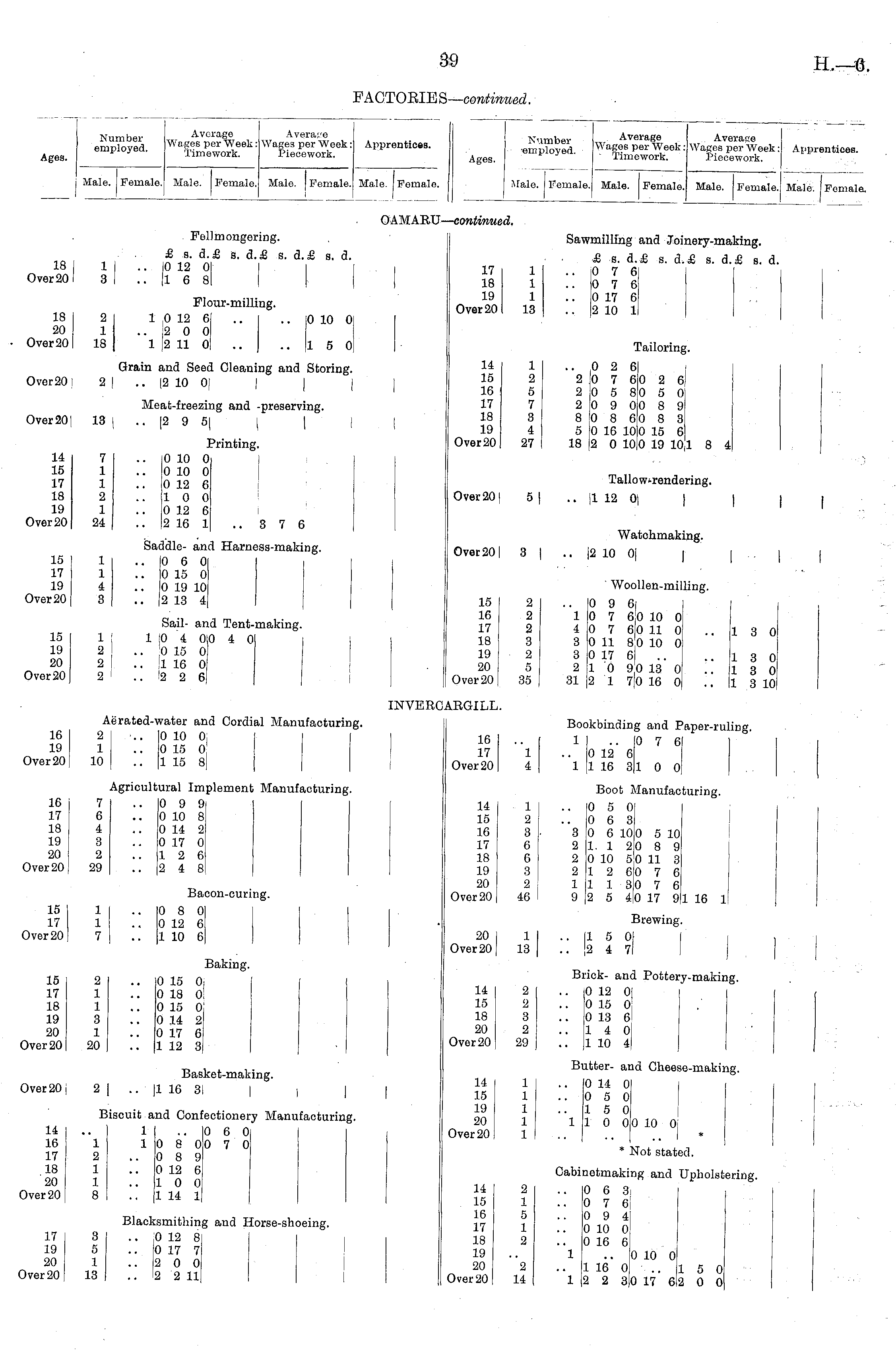 Number employed. Average Wages per Week: Timework. Average Wages per Week: Piecework. Apprentices. Ages. Number employed. Average Wages per Week: Timework. Average Wages per Week: Apprentices. Piecework. Ages. j Male. Female. Male. Female. Male. Female. i Male. Female. Male. Female. Male. Female. Male. Female. Male. Female. OAMARU—continued. 18 j Over 20 I Pellmongering. £ s. d.£ s. d.£ s. a.£ s. d. II .. 0 12 0 3 1 ..168 17 1 18 1 19 1 Over 20 13 Sawmilling and Joinery-making. £ b. a.£ s. d.£ s. d.£ a. d. .. 0 7 61 .. 0 7 6| .. 0 17 6 .. |2 10 1 18 20 Over 20 Flour-milling. 2 1 ,0 12 6 .. .. 0 10 0 1 .. ! 2 0 0 18 112 11 0 .. ..150 Tailoring. Over 20! Over 201 Grain and Seed Cleaning and Storing. 2 I .. (2 10 0] I I I Meat-freezing and -preserving. 13 J .. |2 9 5] I I I I 14 1 15 2 16 5 17 7 18 3 19 4 Over 20 27 ..026 2 Jo 7 6 0 2 6,1 2 0 5 80 5 0 2 0 9 00 8 9 8 JO 8 60 8 3 5 0 16 10 0 15 6| 18 2 0 10 0 19 10,1 8 4 14 15 17 18 19 Over 20 Printing. 7 .. 0 10 0 1 .. 0 10 0 1 .. 0 12 6 2 ..100 1 .. 0 12 6 24 .. 2 16 1 ..376 Tallow-rendering. Over 20 j 5| .. |1 12 0| I I I I Watchmaking. 15 17 19 Over 20 Saddle- and Harness-making. 1 ..060 1 .. 0 15 0 & .. 0 19 10 3 .. 2 13 4 Over 20 I 3 | ... 12 10 0| I I I I Woollen-milling. 15 19 20 Over 20 Sail- and Tent-making. II 10 40040 2 .. 0 15 0 2 .. 1 16 0 2 ..(2 2 6 id Tent-: 0 4 0 laking 15 2 16 2 17 2 18 3 19 2 ' 20 5 Over 20 35 2 2 2 3 2 5 35 .. 0 9 6i 1 0 7 6X) 10 0 4 0 7 6 0 11 0 ..130 3 0 11 8 0 10 0 3 0 17 6 .. ..130 210 90 13 0 .. 130 31 2 1 7|0 16 0 ..13 10 INVEBC ARGILL. I, 16 19 Over 20 Aerated-water and Cordial Manufacturing. 2 .. 0 10 0 1 .. 0 15 o; 10 .. 1 15 8 I 16 17 1 Over 20 4 1 4 Bookbinding and Paper-ruling. 1 ..076 .. 0 12 6 1 1 16 31 0 0 I 16 17 18 19 20 Over 20 Agricultural Implement Manufacturing. 7 ..099 6 .. 0 10 8 4 .. 0 14 2 3 .. 0 17 0 2 ..126 29 ..248 ilement t Manufi Boot Manufacturing. 14 1 15 2 16 3 17 6 18 6 19 3 20 2 ,' Over 20 46 1 2 3 6 6 3 2 46 .. 0 5 0i .. 0 6 3 3 0 6 100 5 10 2 1. 1 20 8 9 2 0 10 5;0 11 3 2 1 2 6,0 7 6 111-3076 9 2 5 4iO 17 91 16 1 Bacon-curing. ig1 16 1 15 17 Over 20 1 ..080 1 .. 0 12 6 7 .. 1 10 6 1 13 Brewing. 20 1 Over20 13 .. 1 5 Of .. 2 4 71 I Baking. Brick- and Pottery-making. 15 17 18 19 20 Over 20 2 .. 0 15 0: 1 .. 0 18 0 1 .. 0 15 0 3 .. 0 14 2 1 .. 0 17 6 20 .. 1 12 3 2 1 1 3 1 20 14 2 15 2 18 3 20 2 Over 20 29 .. i0 12 0! .. 0 15 0 .. 0 13 6! .. 1 4 0| .. 1 10 4| ry-maki: 1 igOver 20, Basket-making. 2 I .. |1 16 3i ! i I I Butter- and Cheese-making. id Cheei se-maki 2 iket-mak i ing. 14 1 15 1 19 1 20 1 Over 20 1 .. 0 14 0 ..050 ..150 11 0 0 0 10 0 «• Biscuit and Confectionery Manufacturing. > 1 fectioner •y Mam 14 16 17 18 20 Over 20 1 ..060 1 1 0 8 00 7 0 2 ..089 1 .. 0 12 6 1 ..100 8 .. 1 14 1 1 2 1 1 8 0 6 0 0 7 0 ifaoturing. * Not stated. Cabinetmaking and Upholstering. 0 10 0 Not stat .ed. ng and Upliols: iring. 17 19 20 Over 20 Blacksmithing and Horse-shoeing. 3 .. 0 12 8 5 .. 0 17 7 1 ..200 13 ,.l2 2 11 seing. 14 2 15 1 16 5 17 1 18 2 19 20 2 Over 20 14 .. 0 6 8i .. 0 7 6| ..094 .. 0 10 0 .. 0 16 6 1 .. 0 10 0 ■• 1 16 0 .. 15 0 12 2 3)0 17 6 2 0 0 0 10 0 (0 IT , ' 6 15 0 2 0 0
