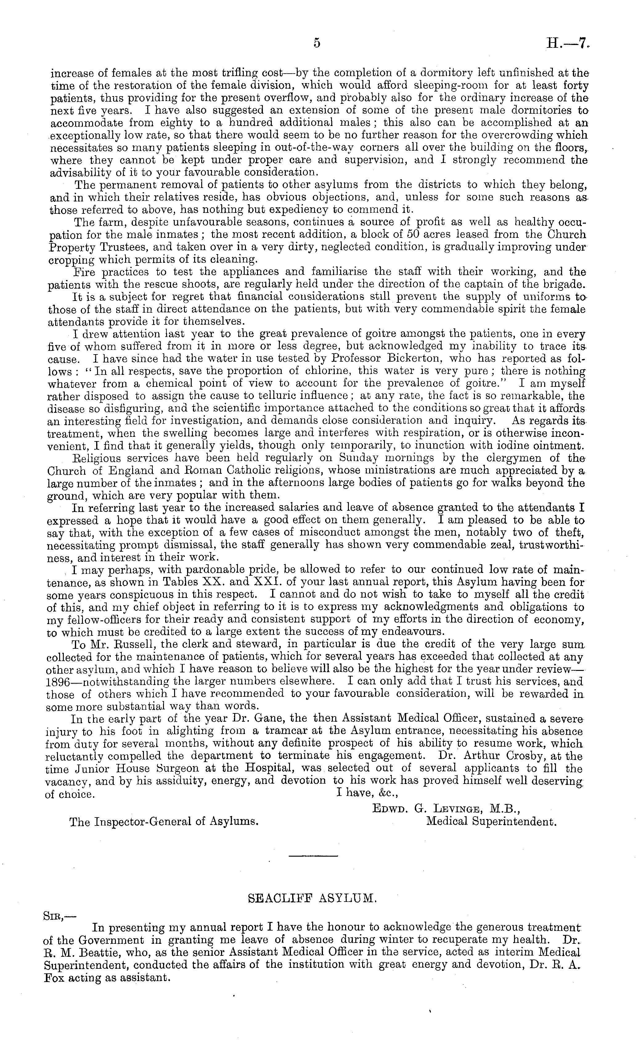 SEACLIFF ASYLUM. Sib,— In presenting my annual report I have the honour to acknowledge the generous treatment of the Government in granting me leave of absence during winter to recuperate my health. Dr. E. M. Beattie, who, as the senior Assistant Medical Officer in the service, acted as interim Medical Superintendent, conducted the affairs of the institution with great energy and devotion, Dr. E. A. Fox acting as assistant.