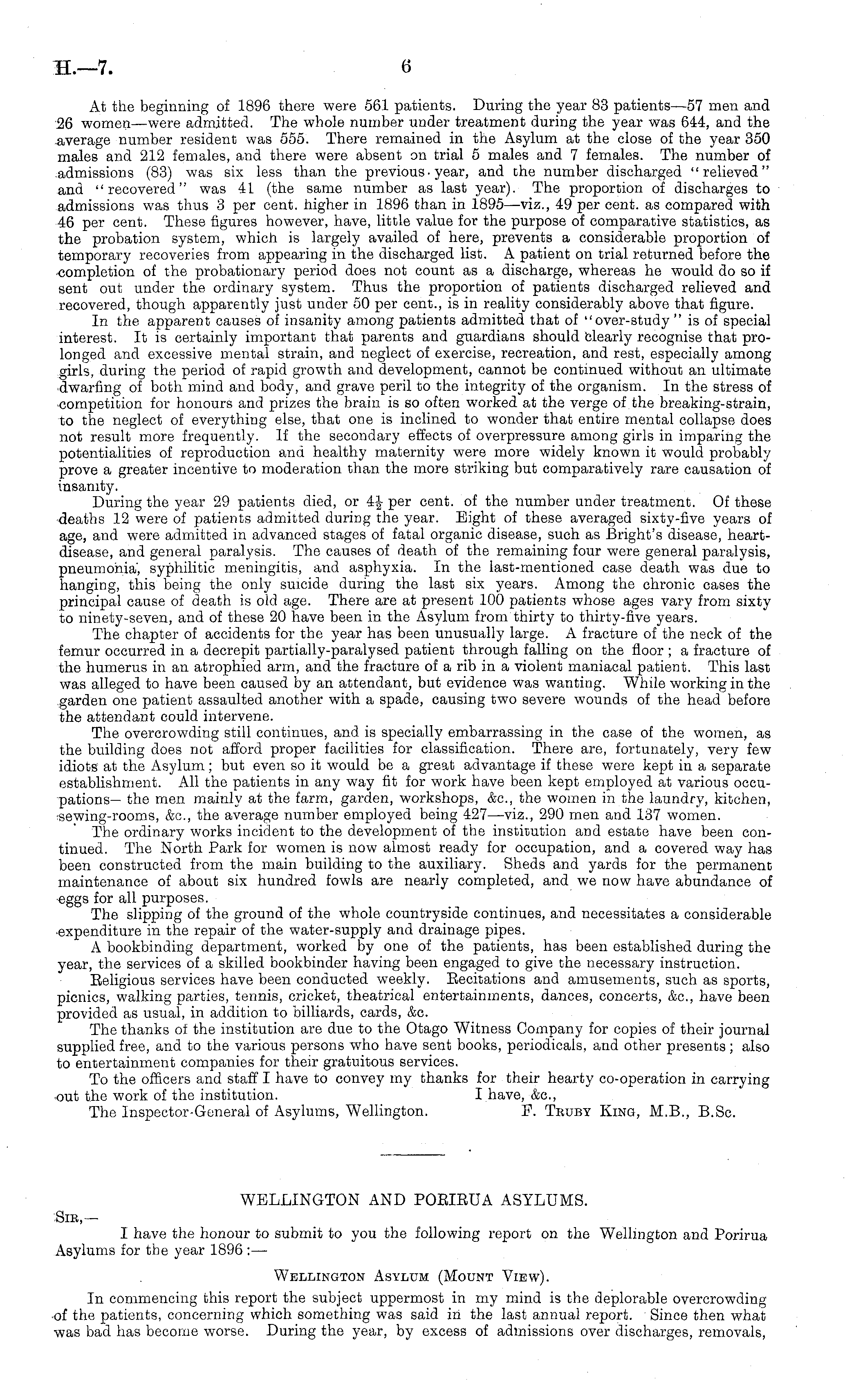 WELLINGTON AND POEIBUA ASYLUMS. Sib,— I have the honour to submit to you the following report on the Wellington and Porirua Asylums for the year 1896 : — Wellington Asylum (Mount View). In commencing this report the subject uppermost in my mind is the deplorable overcrowding •of the patients, concerning which something was said in the last annual report. Since then what was bad has become worse. During the year, by excess of admissions over discharges, removals,