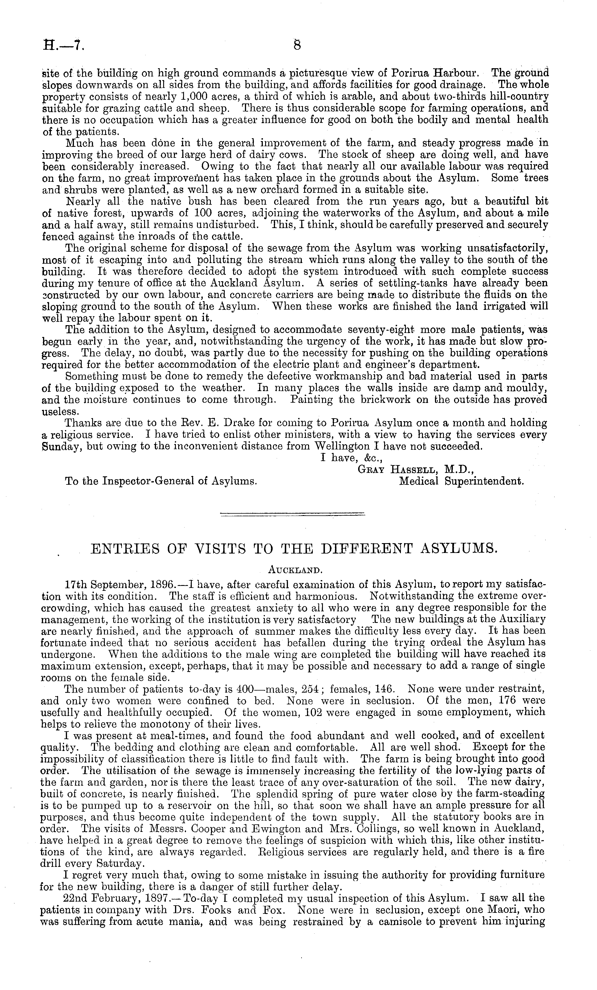 ENTRIES OF VISITS TO THE DIFFERENT ASYLUMS. Auckland. 17th September, 1896. —I have, after careful examination of this Asylum, to report my satisfaction with its condition. The staff is efficient and harmonious. Notwithstanding the extreme overcrowding, which has caused the greatest anxiety to all who were in any degree responsible for the management, the working of the institution is very satisfactory The new buildings at the Auxiliary are nearly finished, and the approach of summer makes the difficulty less every day. It has been fortunate indeed that no serious accident has befallen during the trying ordeal the Asylum has undergone. When the additions to the male wing are completed the building will have reached its maximum extension, except, perhaps, that it may be possible and necessary to add a range of single rooms on the female side. The number of patients to-day is 400—males, 254 ; females, 146. None were under restraint, and only two women were confined to bed. None were in seclusion. Of the men, 176 were usefully and healthfully occupied. Of the women, 102 were engaged in some employment, which helps to relieve the monotony of their lives. I was present at meal-times, and found the food abundant and well cooked, and of excellent quality. The bedding and clothing are clean and comfortable. All are well shod. Except for the impossibility of classification there is little to find fault with. The farm is being brought into good order. The utilisation of the sewage is immensely increasing the fertility of the low-lying parts of the farm and garden, nor is there the least trace of any over-saturation of the soil. The new dairy, built of concrete, is nearly finished. The splendid spring of pure water close by the farm-steading is to be pumped up to a reservoir on the hill, so that soon we shall have an ample pressure for all purposes, and thus become quite independent of the town supply. All the statutory books are in order. The visits of Messrs. Cooper and Ewington and Mrs. Gollings, so well known in Auckland, have helped in a great degree to remove the feelings of suspicion with which this, like other institutions of the kind, are always regarded. Eeligious services are regularly held, and there is a fire drill every Saturday. I regret very much that, owing to some mistake in issuing the authority for providing furniture for the new building, there is a danger of still further delay. 22nd February, 1897.—T0-day I completed my usual inspection of this Asylum. I saw all the patients in company with Drs. Fooks and Fox. None were in seclusion, except one Maori, who was suffering from acute mania, and was being restrained by a camisole to prevent him injuring