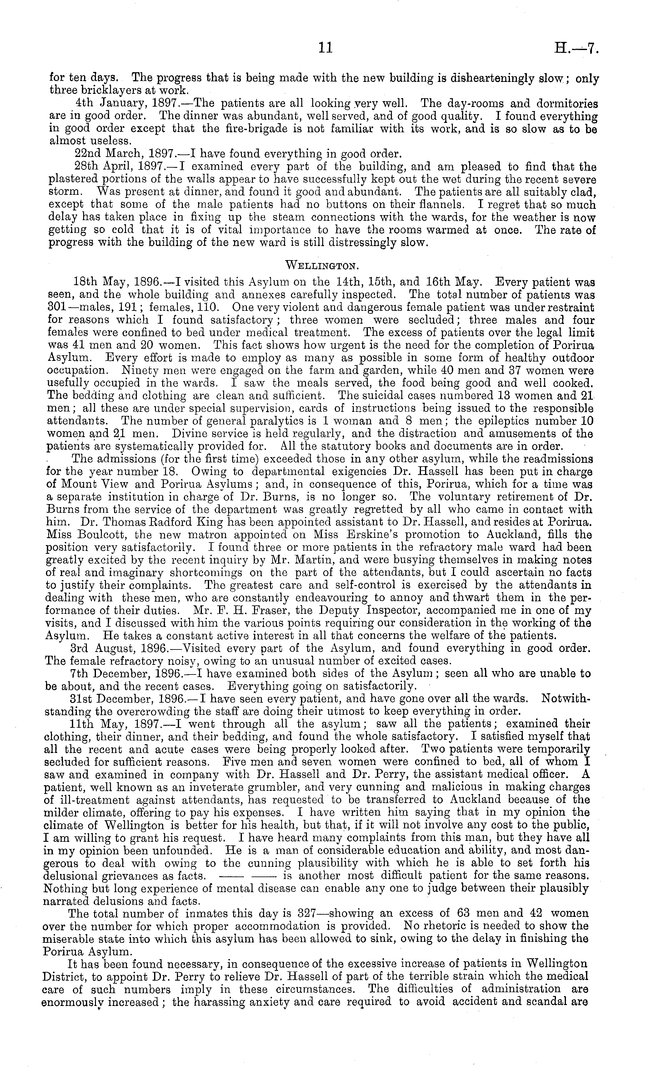for ten days. The progress that is being made with the new building is dishearteningly slow; only three bricklayers at work. 4th January, 1897. —The patients are all looking very well. The day-rooms and dormitories are in good order. The dinner was abundant, well served, and of good quality. I found everything in good order except that the fire-brigade is not familiar with its work, and is so slow as to be almost useless. 22nd March, 1897. —I have found everything in good order. 28th April, 1897. — I examined every part of the building, and am pleased to find that the plastered portions of the walls appear to have successfully kept out the wet during the recent severe storm. Was present at dinner, and found it good and abundant. The patients are all suitably clad, except that some of the male patients had no buttons on their flannels. I regret that so much delay has taken place in fixing up the steam connections with the wards, for the weather is now getting so cold that it is of vital importance to have the rooms warmed at once. The rate of progress with the building of the new ward is still distressingly slow. Wellington. 18th May, 1896.—1 visited this Asylum on the 14th, 15th, and 16th May. Every patient was seen, and the whole building and annexes carefully inspected. The total number of patients was 301—males, 191; females, 110. One very violent and dangerous female patient was under restraint for reasons which I found satisfactory ; three women were secluded; three males and four females were confined to bed under medical treatment. The excess of patients over the legal limit was 41 men and 20 women. This fact shows how urgent is the need for the completion of Porirua Asylum. Every effort is made to employ as many as possible in some form of healthy outdoor occupation. Ninety men were engaged on the farm and garden, while 40 men and 37 women were usefully occupied in the wards. I saw the meals served, the food being good and well cooked. The bedding and clothing are clean and sufficient. The suicidal cases numbered 13 women and 21 men; all these are under special supervision, cards of instructions being issued to the responsible attendants. The number of general paralytics is 1 woman and 8 men; the epileptics number 10 women and 21 men. Divine service is held regularly, and the distraction and amusements of the patients are systematically provided for. All the statutory books and documents are in order. The admissions (for the first time) exceeded those in any other asylum, while the readmissions for the year number 18. Owing to departmental exigencies Dr. Hassell has been put in charge of Mount View and Porirua Asylums ; and, in consequence of this, Porirua, which for a time was a separate institution in charge of Dr. Burns, is no longer so. The voluntary retirement of Dr. Burns from the service of the department was greatly regretted by all who came in contact with him. Dr. Thomas Eadford King has been appointed assistant to Dr. Hassell, and resides at Porirua. Miss Boulcott, the new matron appointed on Miss Erskine's promotion to Auckland, fills the position very satisfactorily. I found three or more patients in the refractory male ward had been greatly excited by the recent inquiry by Mr. Martin, and were busying themselves in making notes of real and imaginary shortcomings on the part of the attendants, but I could ascertain no facts to justify their complaints. The greatest care and self-control is exercised by the attendants in dealing with these men, who are constantly endeavouring to annoy and thwart them in the performance of their duties. Mr. E. H. Eraser, the Deputy Inspector, accompanied me in one of my visits, and I discussed with him the various points requiring our consideration in the working of the Asylum. He takes a constant active interest in all that concerns the welfare of the patients. 3rd August, 1896.—Visited every part of the Asylum, and found everything in good order. The female refractory noisy, owing to an unusual number of excited cases. 7th December, 1896.—1 have examined both sides of the Asylum ; seen all who are unable to be about, and the recent cases. Everything going on satisfactorily. 31st December, 1896.— I have seen every patient, and have gone over all the wards. Notwithstanding the overcrowding the staff are doing their utmost to keep everything in order. 11th May, 1897.—1 went through all the asylum; saw all the patients; examined their clothing, their dinner, and their bedding, and found the whole satisfactory. I satisfied myself that all the recent and acute cases were being properly looked after. Two patients were temporarily secluded for sufficient reasons. Eive men and seven women were confined to bed, all of whom I saw and examined in company with Dr. Hassell and Dr. Perry, the assistant medical officer. A patient, well known as an inveterate grumbler, and very cunning and malicious in making charges of ill-treatment against attendants, has requested to be transferred to Auckland because of the milder climate, offering to pay his expenses. I have written him saying that in my opinion the climate of Wellington is better for his health, but that, if it will not involve any cost to the public, lam willing to grant his request. I have heard many complaints from this man, but they have all in my opinion been unfounded. He is a man of considerable education and ability, and most dangerous to deal with owing to the cunning plausibility with which he is able to set forth his delusional grievances as facts. is another most difficult patient for the same reasons. Nothing but long experience of mental disease can enable any one to judge between their plausibly narrated delusions and facts. The total number of inmates this day is 327 —showing an excess of 63 men and 42 women over the number for which proper accommodation is provided. No rhetoric is needed to show the miserable state into which this asylum has been allowed to 