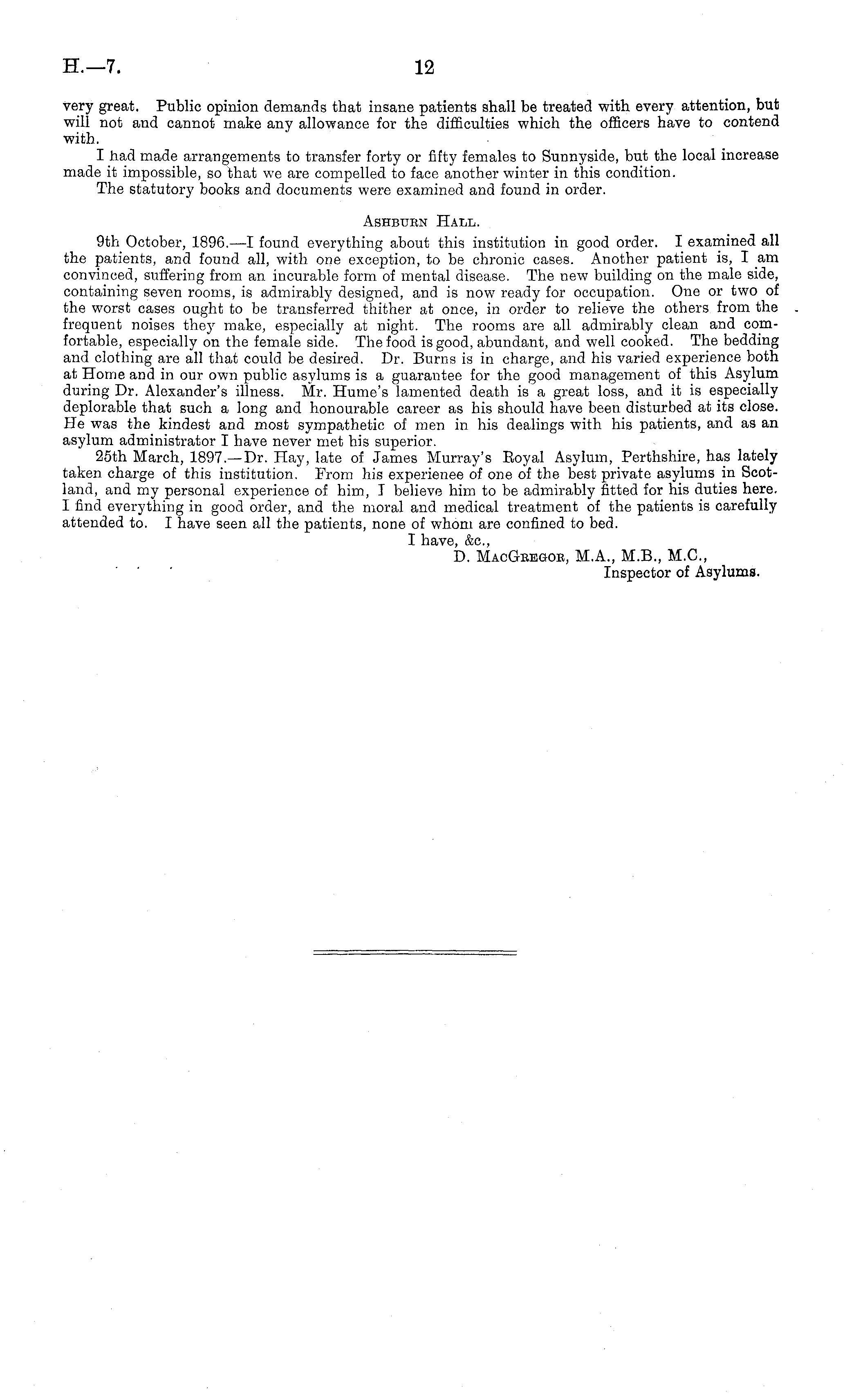 very great. Public opinion demands that insane patients shall be treated with every attention, but will not and cannot make any allowance for the difficulties which the officers have to contend with. I had made arrangements to transfer forty or fifty females to Sunnyside, but the local increase made it impossible, so that we are compelled to face another winter in this condition. The statutory books and documents were examined and found in order. Ashburn Hall. 9th October, 1896.—1 found everything about this institution in good order. I examined all the patients, and found all, with one exception, to be chronic cases. Another patient is, I am convinced, suffering from an incurable form of mental disease. The new building on the male side, containing seven rooms, is admirably designed, and is now ready for occupation. One or two of the worst cases ought to be transferred thither at once, in order to relieve the others from the frequent noises they make, especially at night. The rooms are all admirably clean and comfortable, especially on the female side. The food is good, abundant, and well cooked. The bedding and clothing are all that could be desired. Dr. Burns is in charge, and his varied experience both at Home and in our own public asylums is a guarantee for the good management of this Asylum during Dr. Alexander's illness. Mr. Hume's lamented death is a great loss, and it is especially deplorable that such a long and honourable career as his should have been disturbed at its close. He was the kindest and most sympathetic of men in his dealings with his patients, and as an asylum administrator I have never met his superior. 25th March, 1897.—Dr. Hay, late of James Murray's Eoyal Asylum, Perthshire, has lately taken charge of this institution. From his experience of one of the best private asylums in Scotland, and my personal experience of him, J believe him to be admirably fitted for his duties here. I find everything in good order, and the moral and medical treatment of the patients is carefully attended to. I have seen all the patients, none of whom are confined to bed. I have, &c, D. MacGeegoe, M.A., M.8., M.C., Inspector of Asylums.