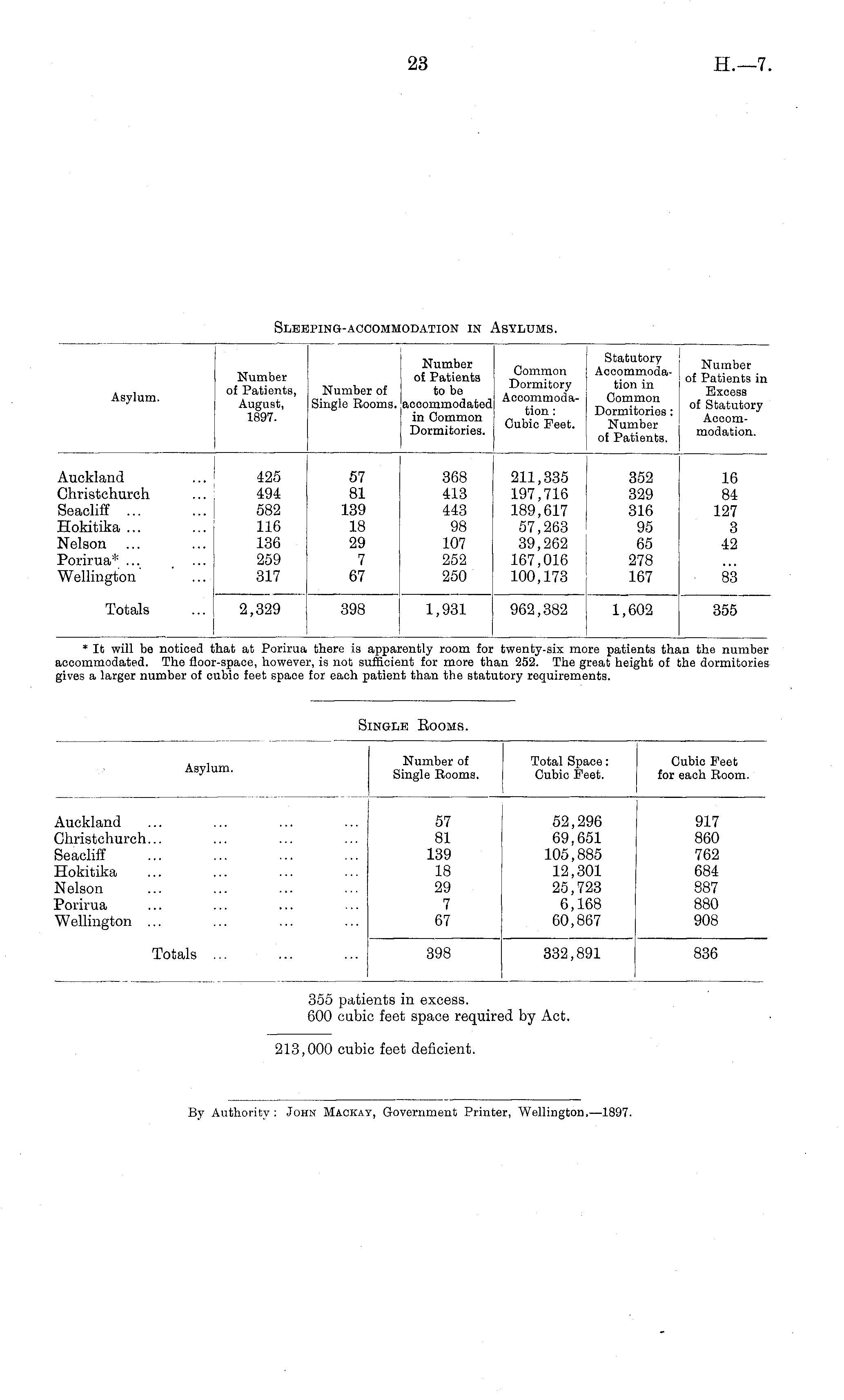 Asylum. Number of Patients, August, 1897. Number of Patients Number of to be Single Rooms, accommodated, in Common Dormitories. Common Dormitory Accommodation : Cubic Feet. Statutory Accommodation in Common Dormitories: Number of Patients. Number of Patients in Excess of Statutory Accommodation. Auckland Christchurch Seacliff ... Hokitika ... Nelson Porirua* ... Wellington 425 494 582 116 136 259 317 57 81 139 18 29 7 67 368 413 443 98 107 252 250 211,335 197,716 189,617 57,263 39,262 167,016 100,173 352 329 316 95 65 278 167 16 84 127 3 42 83 Totals 2,329 398 1,931 962,382 1,602 355 * It will be noticed that at Porirua accommodated. The floor-space, howeve: gives a larger number of cubic feet space there is apparently room for r, is not sufficient for more th for each patient than the stati : twenty-six mo ian 252. The g; utory requireme ire patients thi reat height of snts. an the number the dormitories