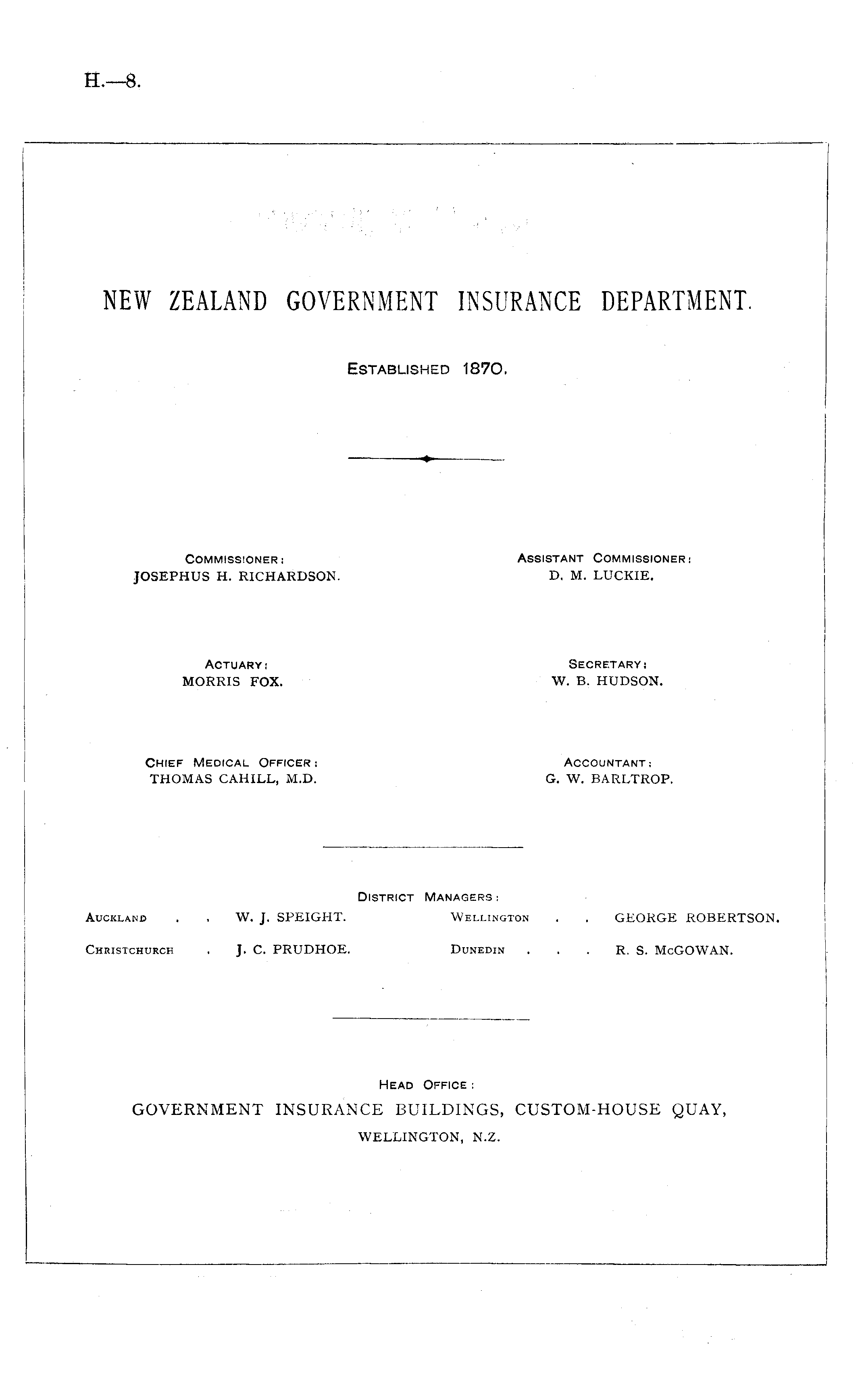 COMMISSIONER: ASSISTANT COMMISSIONER: JOSEPHUS H. RICHARDSON. D. M. LUCKIE. Actuary: Secretary: MORRIS FOX. W. B. HUDSON. Chief Medical Officer: Accountant: THOMAS CAHILL, M.D. G. W. BARLTROP.
