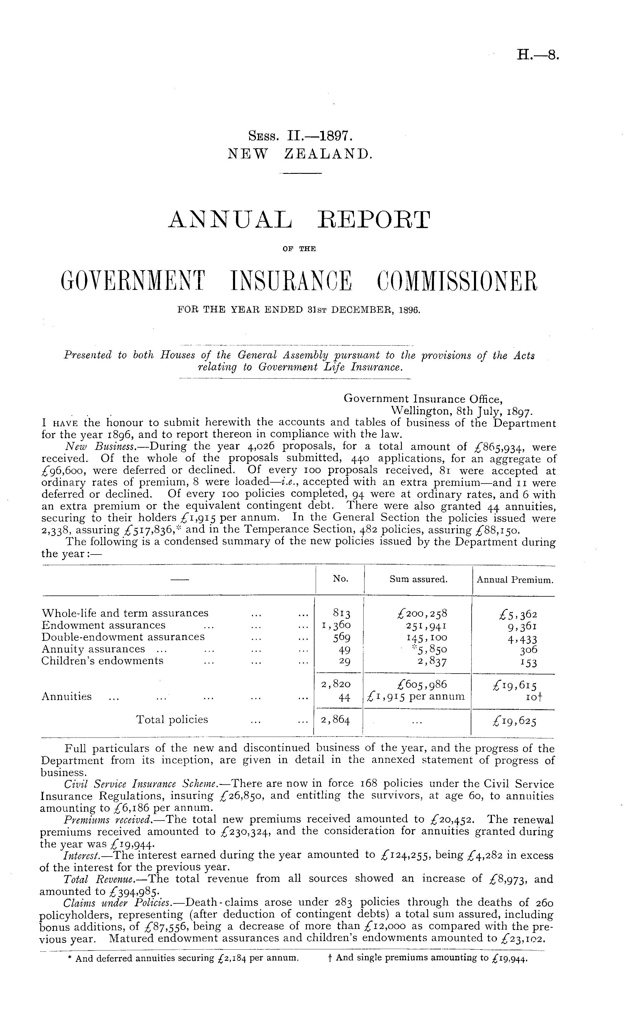 Government Insurance Office, Wellington, Bth July, 1897. I have the honour to submit herewith the accounts and tables of business of the Department for the year 1896, and to report thereon in compliance with the law. New Business. —During the year 4,026 proposals, for a total amount of £"865,934, were received. Of the whole of the proposals submitted, 440 applications, for an aggregate of £"96,600, were deferred or declined. Of every 100 proposals received, 81 were accepted at ordinary rates of premium, 8 were loaded— i.e., accepted with an extra premium—and 11 were deferred or declined. Of every 100 policies completed, 94 were at ordinary rates, and 6 with an extra premium or the equivalent contingent debt. There were also granted 44 annuities, securing to their holders £"1,915 per annum. In the General Section the policies issued were 2,338, assuring £"517,836,* and in the Temperance Section, 482 policies, assuring £"88,150. The following is a condensed summary of the new policies issued by the Department during the year:—