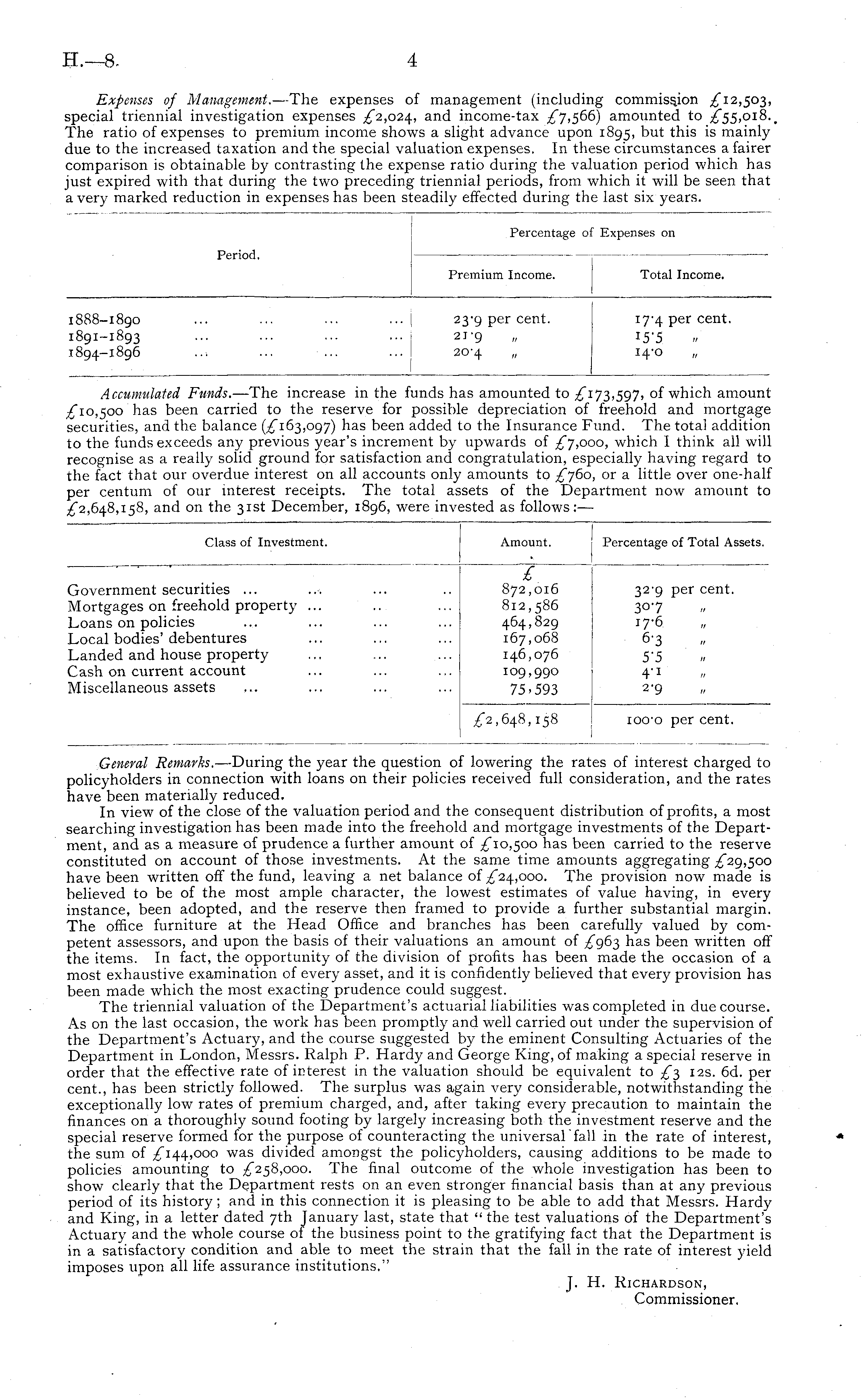 General Remarks. —During the year the question of lowering the rates of interest charged to policyholders in connection with loans on their policies received full consideration, and the rates have been materially reduced. In view of the close of the valuation period and the consequent distribution of profits, a most searching investigation has been made into the freehold and mortgage investments of the Department, and as a measure of prudence a further amount of £"10,500 has been carried to the reserve constituted on account of those investments. At the same time amounts aggregating £"29,500 have been written off the fund, leaving a net balance of £"24,000. The provision now made is believed to be of the most ample character, the lowest estimates of value having, in every instance, been adopted, and the reserve then framed to provide a further substantial margin. The office furniture at the Head Office and branches has been carefully valued by competent assessors, and upon the basis of their valuations an amount of has been written off the items. In fact, the opportunity of the division of profits has been made the occasion of a most exhaustive examination of every asset, and it is confidently believed that every provision has been made which the most exacting prudence could suggest. The triennial valuation of the Department's actuarial liabilities was completed in due course. As on the last occasion, the work has been promptly and well carried out under the supervision of the Department's Actuary, and the course suggested by the eminent Consulting Actuaries of the Department in London, Messrs. Ralph P. Hardy and George King, of making a special reserve in order that the effective rate of interest in the valuation should be equivalent to £"3 12s. 6d. per cent., has been strictly followed. The surplus was again very considerable, notwithstanding the exceptionally low rates of premium charged, and, after taking every precaution to maintain the finances on a thoroughly sound footing by largely increasing both the investment reserve and the special reserve formed for the purpose of counteracting the universal fall in the rate of interest, the sum of £"144,000 was divided amongst the policyholders, causing additions to be made to policies amounting to £"258,000. The final outcome of the whole investigation has been to show clearly that the Department rests on an even stronger financial basis than at any previous period of its history ; and in this connection it is pleasing to be able to add that Messrs. Hardy and King, in a letter dated 7th January last, state that " the test valuations of the Department's Actuary and the whole course of the business point to the gratifying fact that the Department is in a satisfactory condition and able to meet the strain that the fall in the rate of interest yield imposes upon all life assurance institutions." J. H. Richardson, Commissioner.