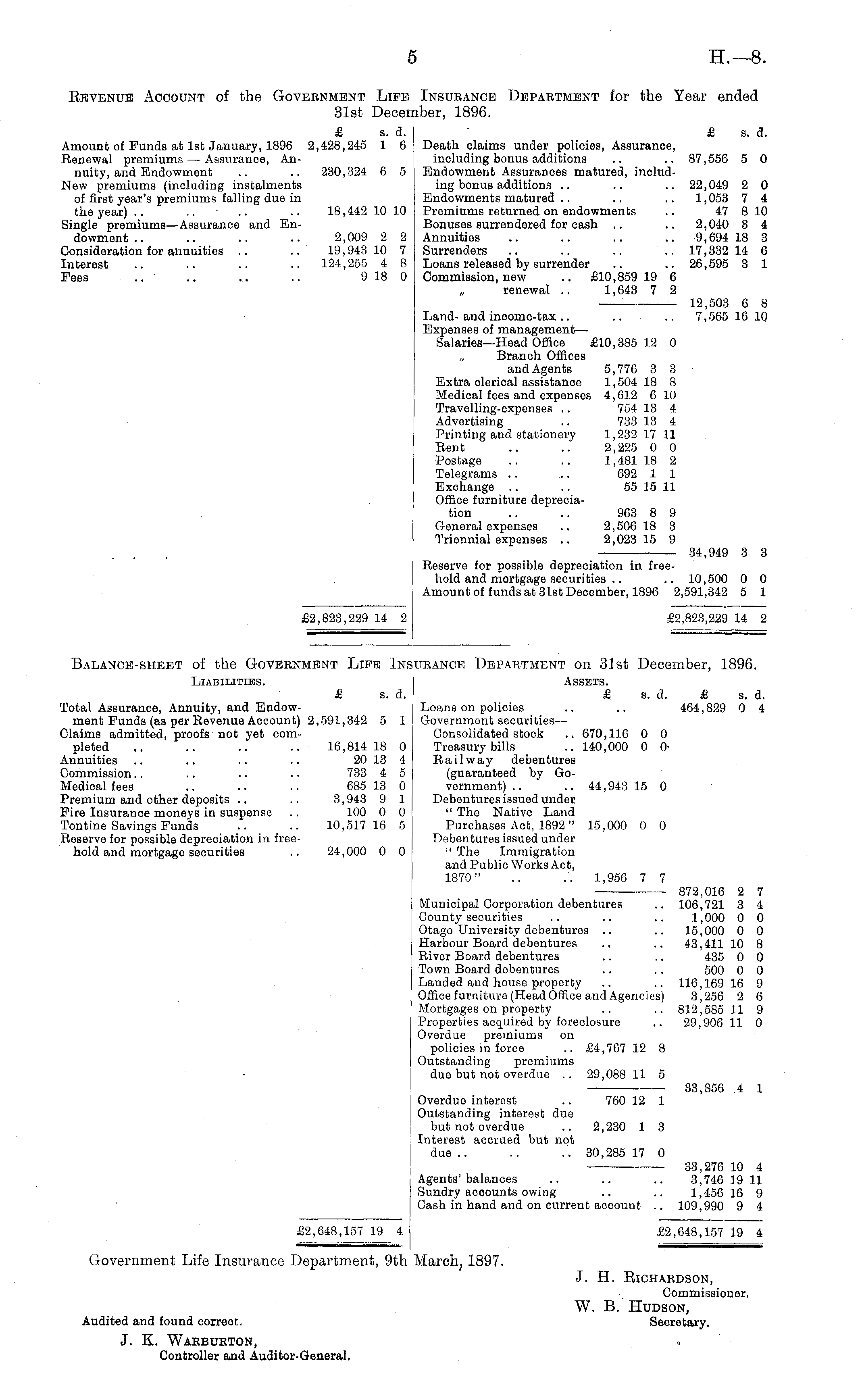 Balance-sheet of the Government Life Insurance Department on 31st December, 1896. Liabilities. Assets. s, s. a. £ s. a. s s. a. Total Assurance, Annuity, and Endow- Loans on policies .. .. 464,829 0 4 ment Funds (as per Bevenue Account) 2,591,342 5 1 Government securities— Claims admitted, proofs not yet com- Consolidated stock .. 670,116 0 0 pleted .. .. .. .. 16,814 18 0 Treasury bills .. 140,000 0 0Annuities .. .. .. .. 20 13 4 Railway debentures Commission.. .. .. .. 733 4 5 (guaranteed by GoMedical fees .. .. .. 685 13 0 vornment) .. .. 44,94.3 15 0 Premium and other deposits .. .. 3,943 9 1 Debentures issued under Fire Insurance moneys in suspense .. 100 0 0 j " The Native Land Tontine Savings Funds .. .. 10,517 16 5 Purchases Act, 1892" 15,000 0 0 Reserve for possible depreciation in free- Debentures issued under hold and mortgage securities .. 24,000 0 0 "The Immigration and Public Works Act, 1870" .. .'. 1,956 7 7 872,016 2 7 Municipal Corporation debentures .. 106,721 3 4 County securities .. .. .. 1,000 0 0 Otago University debentures .. .. 15,000 0 0 Harbour Board debentures .. .. 43,411 10 8 River Board debentures .. .. 435 0 0 Town Board debentures .. .. 500 0 0 Landed and house property .. .. 116,169 16 9 Office furniture (Head Office and Agencies) 3,256 2 6 Mortgages on property .. .. 812,585 11 9 Properties acquired by foreclosure .. 29,906 11 0 Overdue premiums on policies in force .. £4,767 12 8 Outstanding premiums due but not overdue .. 29,088 11 5 33,856 4 1 Overdue interest .. 760 12 1 Outstanding interest due but not overdue .. 2,230 1 3 Interest accrued but not due .. .. .. 30,285 17 0 33,276 10 4 Agents'balances .. .. .. 3,746 39 11 Sundry accounts owing .. .. 1,456 16 9 Cash in hand and on current account .. 109,990 9 4 £2,648,157 19 4 £2,648,157 19 4 Government Life Insurance Department, 9th March, 1897. J. H. Eichardson, Commissioner. W. B. Hudson, Audited and found correct. Secretary. J. K. Wahburton, Controller and Auditor-General.