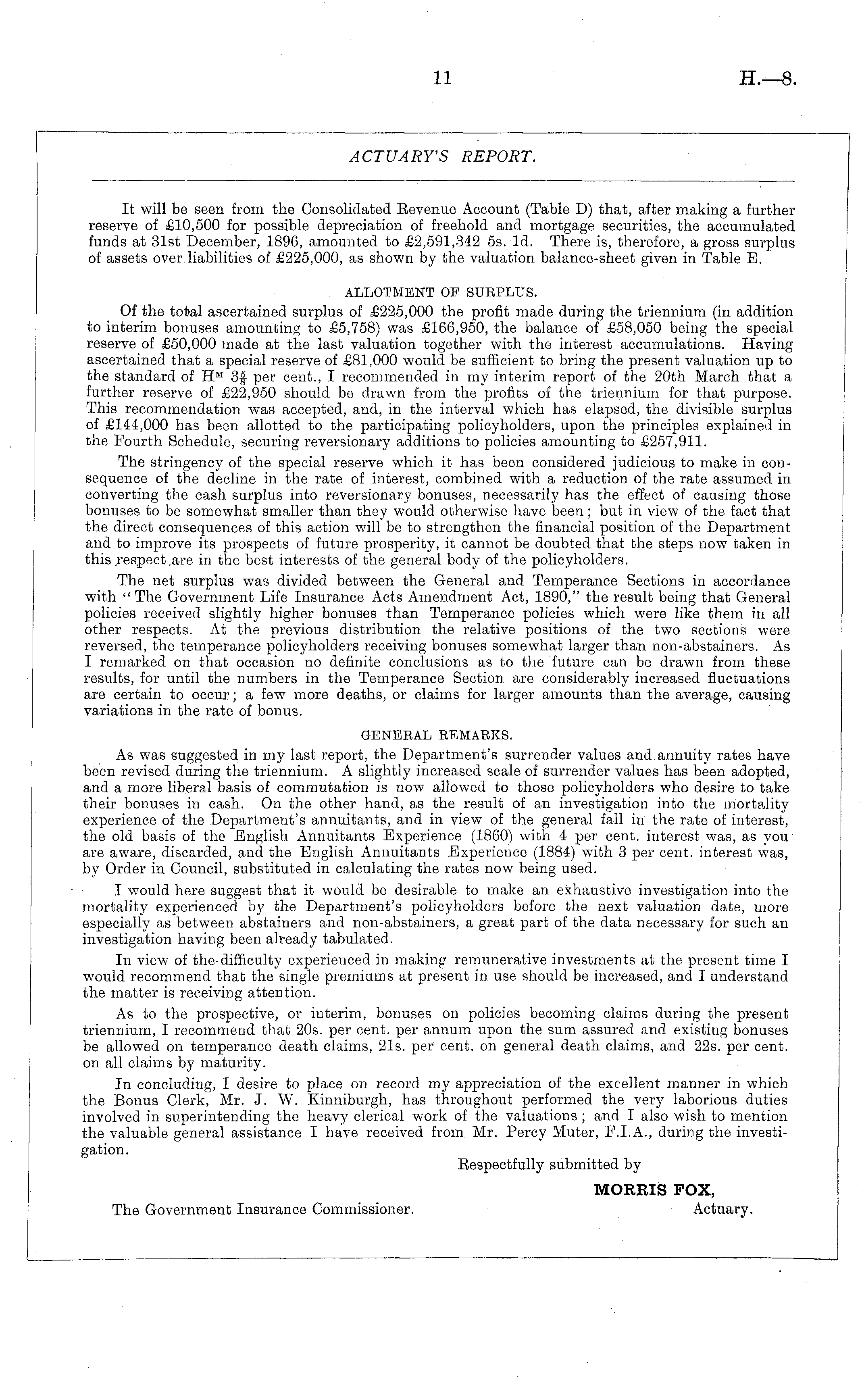 It will be seen from the Consolidated Revenue Account (Table D) that, after making a further reserve of £10,500 for possible depreciation of freehold and mortgage securities, the accumulated funds at 31st December, 1896, amounted to £2,591,342 ss. Id. There is, therefore, a gross surplus of assets over liabilities of £225,000, as shown by the valuation balance-sheet given in Table B. ALLOTMENT OF SURPLUS. Of the total ascertained surplus of £225,000 the profit made during the triennium (in addition to interim bonuses amounting to £5,758) was £166,950, the balance of £58,050 being the special reserve of £50,000 made at the last valuation together with the interest accumulations. Having ascertained that a special reserve of £81,000 would be sufficient to bring the present valuation up to the standard of H M 3f- per cent., I recommended in my interim report of the 20th March that a further reserve of £22,950 should be drawn from the profits of the triennium for that purpose. This recommendation was accepted, and, in the interval which has elapsed, the divisible surplus of £144,000 has been allotted to the participating policyholders, upon the principles explained in the Fourth Schedule, securing reversionary additions to policies amounting to £257,911. The stringency of the special reserve which it has been considered judicious to make in consequence of the decline in the rate of interest, combined with a reduction of the rate assumed in converting the cash surplus into reversionary bonuses, necessarily has the effect of causing those bonuses to be somewhat smaller than they would otherwise have been ; but in view of the fact that the direct consequences of this action will be to strengthen the financial position of the Department and to improve its prospects of future prosperity, it cannot be doubted that the steps now taken in this .respect .are in the best interests of the general body of the policyholders. The net surplus was divided between the General and Temperance Sections in accordance with "The Government Life Insurance Acts Amendment Act, 1890," the result being that General policies received slightly higher bonuses than Temperance policies which were like them in all other respects. At the previous distribution the relative positions of the two sections were reversed, the temperance policyholders receiving bonuses somewhat larger than non-abstainers. As I remarked on that occasion no definite conclusions as to the future can be drawn from these results, for until the numbers in the Temperance Section are considerably increased fluctuations are certain to occur; a few more deaths, or claims for larger amounts than the average, causing variations in the rate of bonus. GENERAL REMARKS. As was suggested in my last report, the Department's surrender values and annuity rates have been revised during the triennium. A slightly increased scale of surrender values has been adopted, and a more liberal basis of commutation is now allowed to those policyholders who desire to take their bonuses in cash. On the other hand, as the result of an investigation into the mortality experience of the Department's annuitants, and in view of the general fall in the rate of interest, the old basis of the English Annuitants Experience (1860) with 4 per cent, interest was, as you are aware, discarded, and the English Annuitants Experience (1884) with 3 per cent, interest was, by Order in Council, substituted in calculating the rates now being used. I would here suggest that it would be desirable to make an exhaustive investigation into the mortality experienced by the Department's policyholders before the next valuation date, more especially as between abstainers and non-abstainers, a great part of the data necessary for such an investigation having been already tabulated. In view of the-difficulty experienced in making remunerative investments at the present time I would recommend that the single premiums at present in use should be increased, and I understand the matter is receiving attention. As to the prospective, or interim, bonuses on policies becoming claims during the present triennium, I recommend that 20s. per cent, per annum upon the sum assured and existing bonuses be allowed on temperance death claims, 21s. per cent, on general death claims, and 225. per cent, on all claims by maturity. In concluding, I desire to place on record my appreciation of the excellent manner in which the Bonus Clerk, Mr. J. W. Kinniburgh, has throughout performed the very laborious duties involved in superintending the heavy clerical work of the valuations ; and I also wish to mention the valuable general assistance I have received from Mr. Percy Muter, F.1.A., during the investigation. Respectfully submitted by MORRIS FOX, The Government Insurance Commissioner. Actuary.