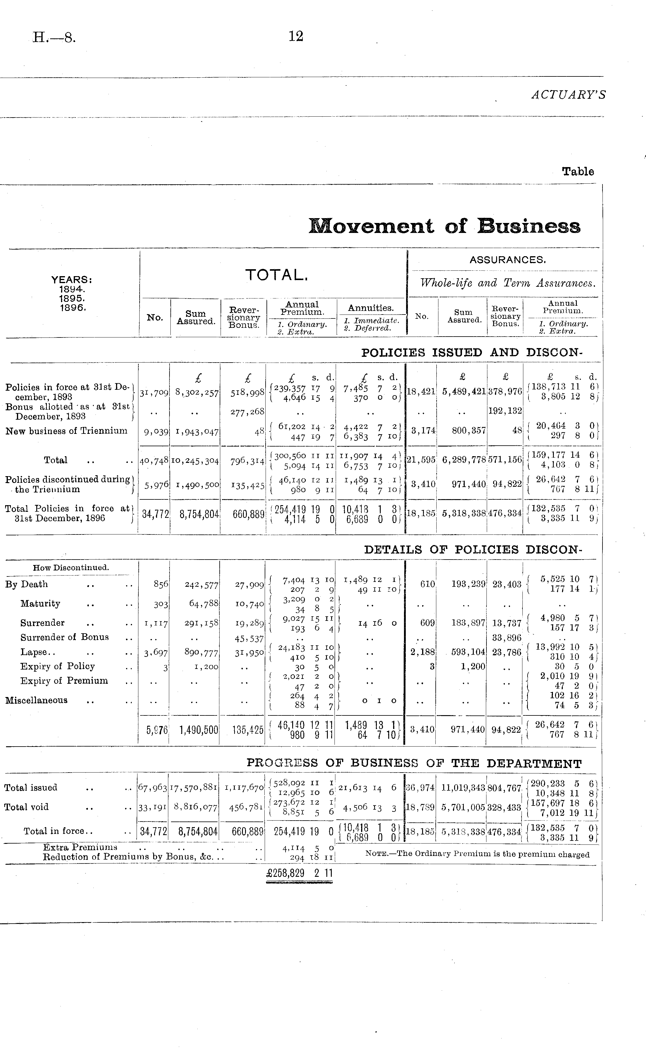 ASSURANCES. YEARS: 1894. TOTAL. Whole-life and Term Assurances. ie»o. 1896. No Sum &- P&u a m. Jl^^^^ Annual Sum Kever- Premium. No - Assured S1 °nary _ assured. Bonug> j Ordinary. 2. Extra. 2. Deferred. POLIC [ES ISSUED AND DISGONPolicies in force at 31st De-1 cember, 1893 f Bonus allotted • as • at 31st | December, 1893 j New business of Triennium 3i,7 0 9! 9,039 £ ■■ 8,302,257 1,943,047 £ 518,998 277,268 48 £ s. d. £ s. d. f239,357 17 9 7,485 7 2) \ 4,646 15 4 370 o of f 6l,202 14- 2 4,422 7 2 I I 447 19 7 6,383 7 iof £ £ £ s. d. 18,421 5,489,421378,976 j 18 f'7i? }l 51 ' I d,80o 12 8j 192,132 a iuJ qao »r, aq ' 20,464 3 0) 3,174i 800,35/ 48 < ' on _ „ ., 1 297 8 0 1 21,595 ! 6,289,778:571,156 { 159 ' ]H 14 „ I i t 4,103 0 8 1 j 1 3,410 971,440- 94,822 j 26 'J! 42 [ lb 1 8 111 Total Policies discontinued during) the Triennium f 40,748 10,245,304 796,314 (300,560 11 11 11,907 14 4) I 5,094 14 " 6,753 7 iof f 46,140 12 II 1,489 13 ll ( 980 9 II 64 7 IO) 21,595 5,976 1,490,500 135,425 3,410 Total Policies in force at) 31st December, 1896 f 34,772 ! 8,754,804 660,889 '254,419 19 0 10,413 1 3) I 4,114 5 0 6,689 0 07 18,185 5,318,338476,334 ,? „;- [ d,33o 11 9) I j I 18,185 deta: :ls F POLICIES DISCONHow Discontinued. By Death f 7.4°4 r 3 10 I 207 2 9 ( 3,209 o 2 I 34 8 5 f 9,027 15 n 1 i'93 6 4 1,489 12 1) 49 n iof j 23 , 0 j 5,525 10 7) 23,463 J 177 14 856 242,577 27,909 610 193,239: Maturity 3°3 64,788 10,740 f I f 14 16 o ( 4,980 5 7! is, liI j 157 17 3) - 33,896 ' f 13,992 10 5) 2,6, 78b j 310 1Q 4J - 30 5 0 f 2,010 19 9) •• 1 47 2 Of f 102 16 2i •• j 74 5 3f Q4 R99 lf 26 > 642 7 6 I 94 > 822 ( 767 8 llf Surrender 1,117 291,158 19,289 609 183,897 Surrender of Bonus 45,537 ( 24,183 11 10 t 4 10 5 10 3° 5 o ' 2,021 2 o I 47 2 o ! 264 4 2 1 88 4 7 2,188 Lapse 3-697 890,777 31,950 I 593,104 Expiry of Policy 3 1,200 3 1,200 Expiry of Premium 1 f I J OIO Miscellaneous 5,976 1,490,500! 135,425 1 46,140 12 11 ( 980 9 11 1,489 13 1) 64 7 10/ 3,410; 971,440 PR GRESS OF BUSINE ■S OF THE DEPARTMENT 'otal issued 67,96317,570,881 1,117,670; 33,191 8,816,077 456,7 Sl 2S -°f " *| 21,613 14 6 I ( 12,905 10 6 ' j t (273,672 12 ll , 1 00 c 4,5°6 13 3 8,851 5 6 MJ ° J 36,974 11,019,343 804,767 I 2 ??' 2 ? 3 ? t\ I ( 10,348 11 8) 18,789 5,701,005 328,433 j 19 11} 1M8~5"5^^47J^;{ 132 : |5J 0) 'otal void Total in force.. 954 419 19 0 i 10,4-18 1 81 Z04.4I9 ia u jj i 689_o_fjf 34,772 8,754,804 660,889 Extra Premiums Reduction of Premi mg by Bonus, &c. .. 4,114 5 O:' 294 l8 IIj Note.—The Ordinary Premium is the premium charged £258,829 2 11