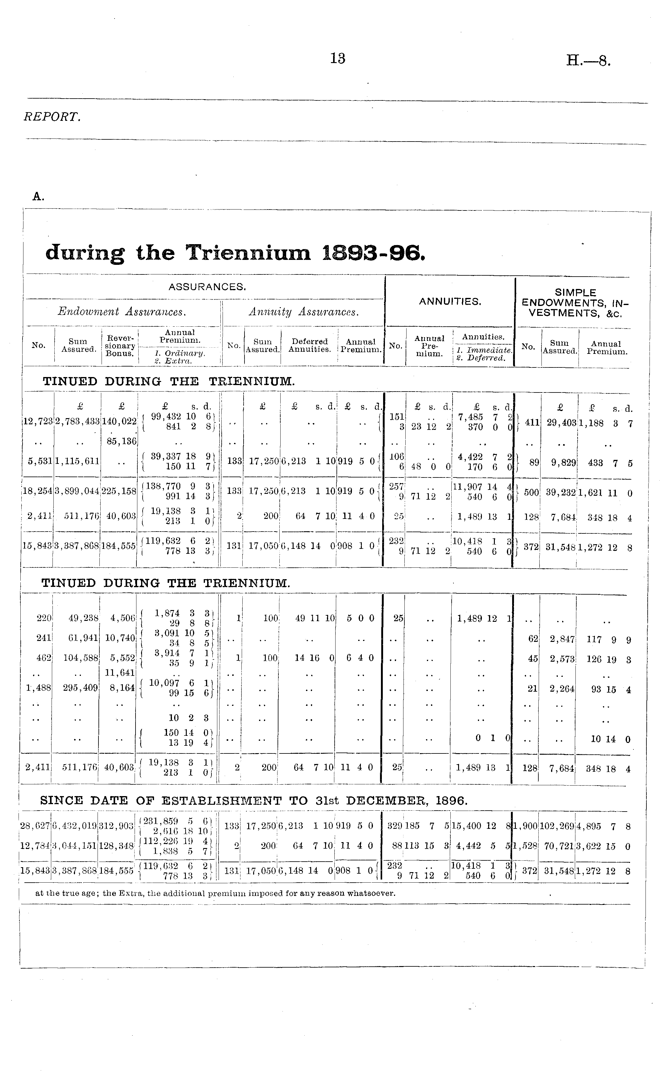 ASSURAN ICES. SIMPLE ENDOWMENTS, INVESTMENTS, &c. ANNUITIES. Endowment Assurances. Annuity Assurances. ; Annual Sum I Kever- , Premium. No - Assured Bipnary— Assured. Bonua# | ,, Ordinary. I 2. Ex tret. No. Sum Deferred ; Annual Assured. Annuities, i Premium. Annual : Annuities. r,,i,-,rv, I 1 - Immediate. mium. , g< deferred. N Sum j Annual ' Assured.; Premium. :nued dur: :ng the t; ,ie: nium. £ £ £ s. d. I 99,432 10 6| 1 841 2 8f £ £ s. d. £ s. d. J 17,2506,213 1 10919 5 0-' : 17,250:6,213 1 10 919 5 0-1 1 200; 64 7 10; 11 4 0 17,050 0,148 14 0 ! 908 1 0-[ £ s. d. £ s. d. 151 .. 7,485 7 2 3 23 12 2 370 0 0 £ i £ s. d. 12,723' '2,783,433 140,022! i | 411 29,4031,188 3 7 85,136 106 .. 4,422 7 2 6| 48 0 0 170 6 0 257 ; .. 11,907 14 4 9. 71 12 2 540 6 0 5,531 1,115,611 ( 39,337 18 9) 1 150 11 7 J 133 I 89 9,829 433 7 5 i 18,254 (3,899,044 1225,158 . (138,770 9 3) 1 \ 991 14 3 f 133; 1 50o; ! 39,2321,621 11 0 .2,411 511,176 i 40,603 , f 19,138 3 1) ' ( 213 1 Of - (119,632 6 2) 1 | 778 13 3 j 2 131 25| •• | 1,489 13 1 232 .. 10,418 1 3 9 71 12 2 540 6 0 I i 128 7,684, 348 18 4 15,843 ;3,387,868 ! 184,555 1 372! j 31,5481,272 12 8 !! i ' . ii I Tl INUED DUR1 ING THE TF he: NIU I i 220; 241! I 49,238 61,941 ! ! 4,506 ! 4,506 j 1 ' a ! 2 * ° °[ 1 100; 49 11 10 5 0 0 . 10,740 in 74n ' 3 ' 091 10 5 1 10 ' 740 1 34 8 5f •■ j 1,874 3 8) "1 29 8 8 1 ( 3,091 10 5) 1 34 8 5 f ( 3,914 7 1) 1 35 9 If ] i &o 25 1,489 12 1 62, •■ ! 2,847 | 117 9 9 4G2 104,588 ! 5,552 l 5,552 | 3 ' 944 I \\ 1 100 14 16 0 6 4 0 { 35 9 lj 1 45 2,573 ! 126 19 3 11,641 i 11,641 .. ; .. - ... . ( 19 097 fi 11 f 10,097 6 1) 1 99 15 6f i *' 1,488 295,409 8,164 W 1} 21 2,264 93 15 4 10 2 3 10 2 3 ( 150 14 0) •• [ 13 19 4f " V ""** ■*-«* * I ( 150 14 0) [ 13 19 4f ( 19,138 3 1) j ( 213 1 0 f 2 I 0 1 0 10 14 0 2,411 511,1761 j 40,603; '• 40,603;-; 19j o?o ? ll 2 200 64 7 10 11 4 0 ( Zld 1 oj I 25 1 .. j 1,489 13 1 128 I 7,684 ! 348 18 4 i r ' i I i SI [NCE E >ATE OF ESTABLISHMENT TO 31st DECI IMBER, 18! 96. i I 312,903 i 234 /' .f! 1 -: 133 17,250*6,213 1 10 919 5 0 ( 2,61b 18 10 i I 128,348 I 112 ' 22 q 19 t\\ 2 2001 64 7 10! 11 4 0 ( 1,8.38 0 / | j ; ; ] I 184,555 I 119 '^ 32 t l\ 13117,050 6,148 14 0:908 1 oj I [ i to 16 O \ \ I I 28,627 6,432,019 329185 7 5 |15,400 12 8 1,900 102,269| |4,895 7 8 12,784 3,044,151 88113 15 3 4,442 5 5 1,528 70,721| |3,622 15 0 15,843 3,387,868 232 9 71 12 2 10,418 1 3 540 6 0 a [- 372 31,548; 1,272 12 8