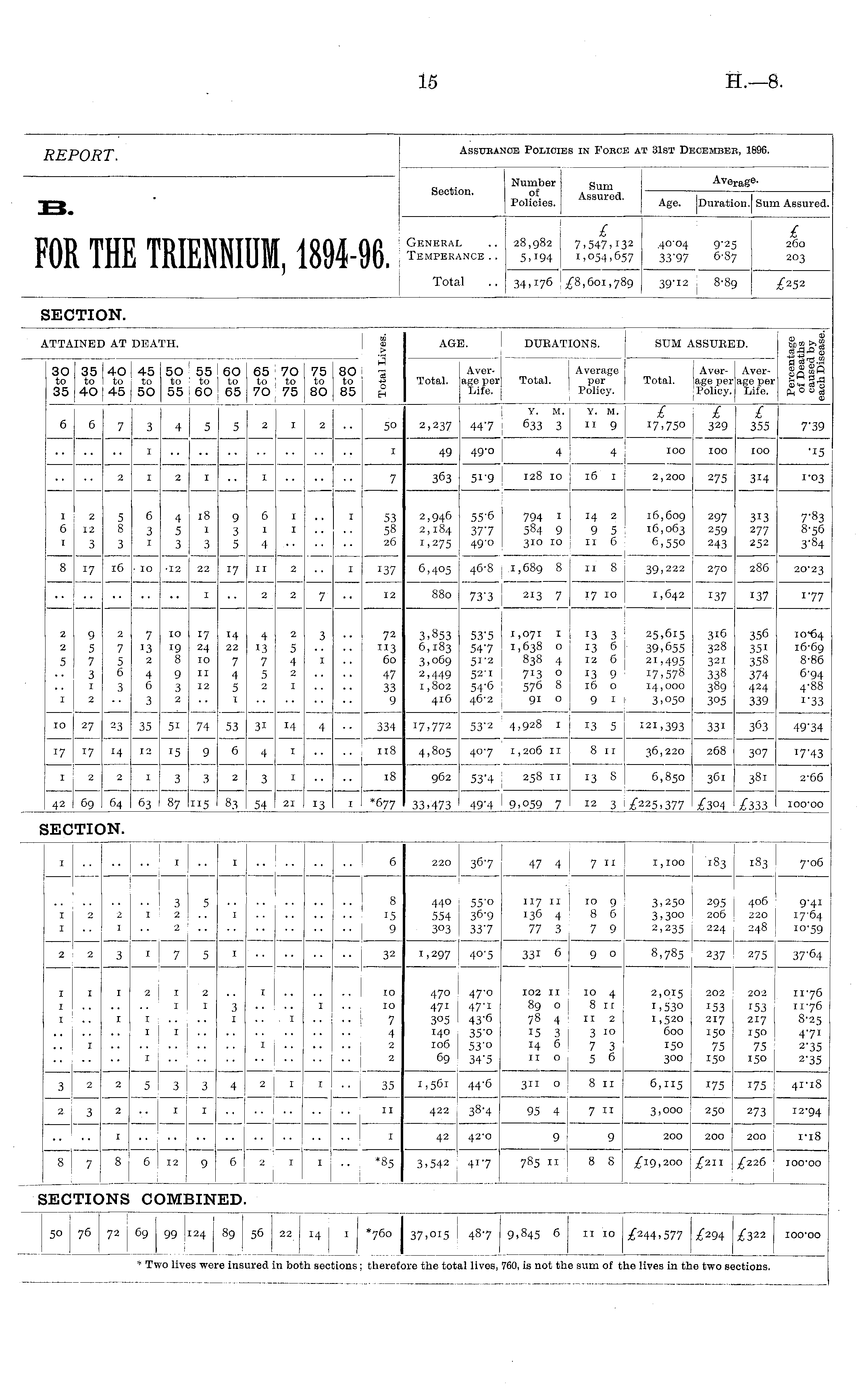 Section. Number of Policies. Sum Assured. AverageAge. Duration. Sum Assured. General Temperance .. £ 28,982 i 7,547,132 5,194 ; 1,054,657 4004 33'97 9-25 6-87 £ 260 203 Total 34,176 .£8,601,780, 39'I2 8-89 £252