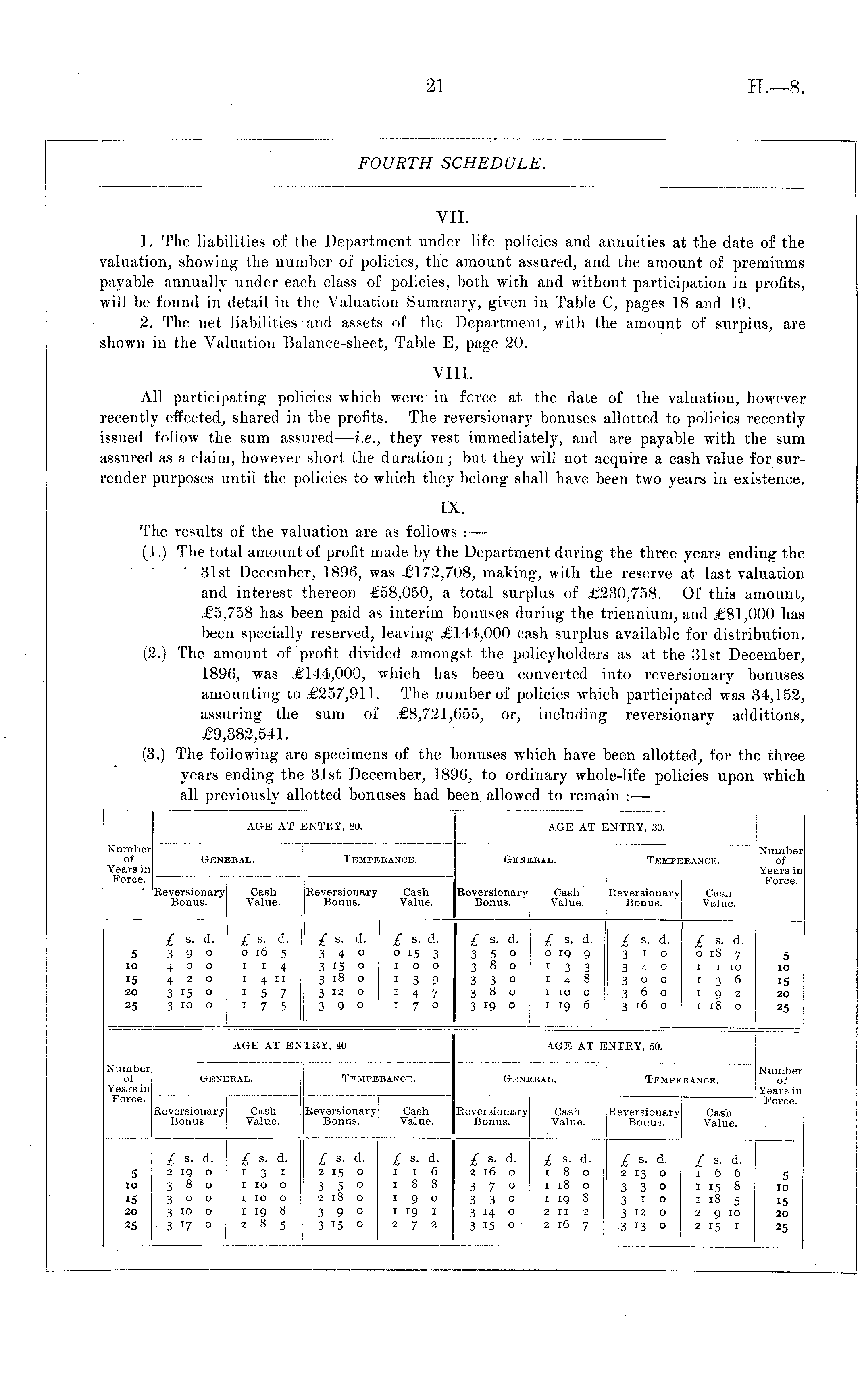FOURTH SCHEDULE. VII. 1. The liabilities of the Department under life policies and annuities at the date of the valuation;, showing the number of policies, the amount assured, and the amount of premiums payable annually under each class of policies, both with and without participation in profits, will be found in detail in the Valuation Summary, given in Table 0, pages 18 and 19. 2. The net liabilities and assets of the Department, with the amount of surplus, are shown in the Valuation Balance-sheet, Table E, page 20. VIII. All participating policies which were in force at the date of the valuation, however recently effected, shared in the profits. The reversionary bonuses allotted to policies recently issued follow the sum assured — i.e., they vest immediately, and are payable with the sum assured as a claim, however short the duration ; but they will not acquire a cash value for surrender purposes until the policies to which they belong shall have been two years in existence. IX. The results of the valuation are as follows :— (1.) The total amount of profit made by the Department during the three years ending the 31st December, 1896, was £172,708, making, with the reserve at last valuation and interest thereon £58,050, a total surplus of £230,758. Of this amount, .£5,758 has been paid as interim bonuses during the triennium, and £81,000 has been specially reserved, leaving £144,000 cash surplus available for distribution. (2.) The amount of profit divided amongst the policyholders as at the 31st December, 1896, was £144,000, which has beeu converted into reversionary bonuses amounting to £257,911. The number of policies which participated was 34,152, assuring the sum of £8,721,655, or, including reversionary additions, £9,382,541. (3.) The following are specimens of the bonuses which have been allotted, for the three years ending the 31st December, 1896, to ordinary whole-life policies upon which all previously allotted bonuses had been allowed to remain : —