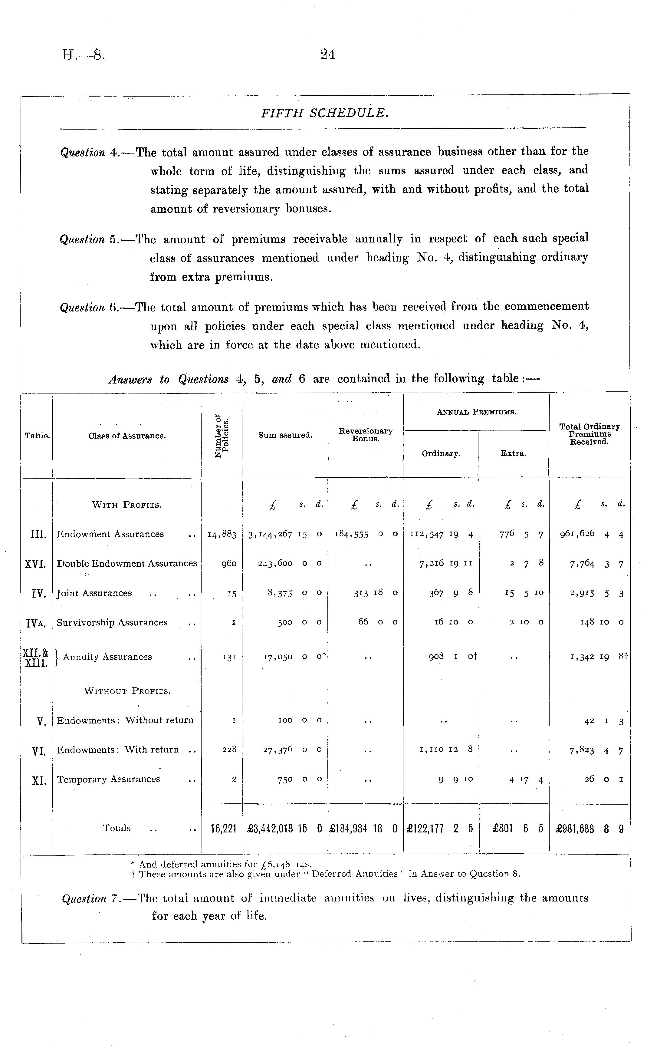 Question 4. —The total amount assured under classes of assurance business other than for the whole term of life, distinguishing the sums assured under each class, and stating separately the amount assured, with and without profits, and the total amount of reversionary bonuses. Question 5. —The amount of premiums receivable annually in respect of each such special class of assurances mentioned under heading No. 4, distinguishing ordinary from extra premiums. Question 6. —The total amount of premiums which has been received from the commencement upon all policies under each special class mentioned under heading No. 4, which are in force at the date above mentioned.