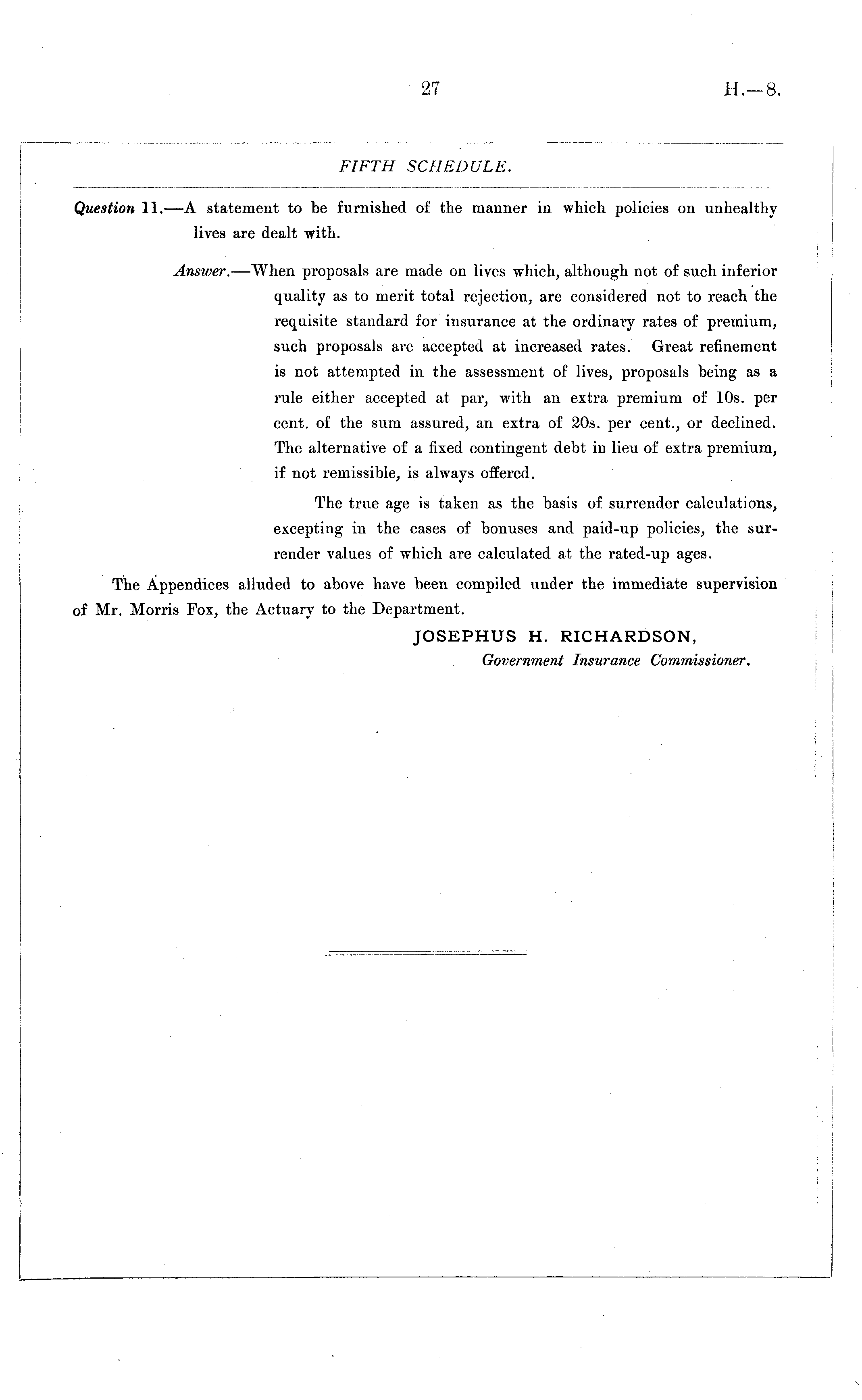 Question 11.—A statement to be furnished of the manner in which policies on unhealthy lives are dealt with. Answer. —When proposals are made on lives which, although not of such inferior quality as to merit total rejection, are considered not to reach the requisite standard for insurance at the ordinary rates of premium, such proposals are accepted at increased rates. Great refinement is not attempted in the assessment of lives, proposals being as a rule either accepted at par, with an extra premium of 10s. per cent, of the sum assured, an extra of 20s. per cent., or declined. The alternative of a fixed contingent debt in lieu of extra premium, if not remissible, is always offered. The true age is taken as the basis of surrender calculations, excepting in the cases of bonuses and paid-up policies, the surrender values of which are calculated at the rated-up ages. The Appendices alluded to above have been compiled under the immediate supervision of Mr. Morris Fox, the Actuary to the Department. JOSEPHUS H. RICHARDSON, Government Insurance Commissioner.