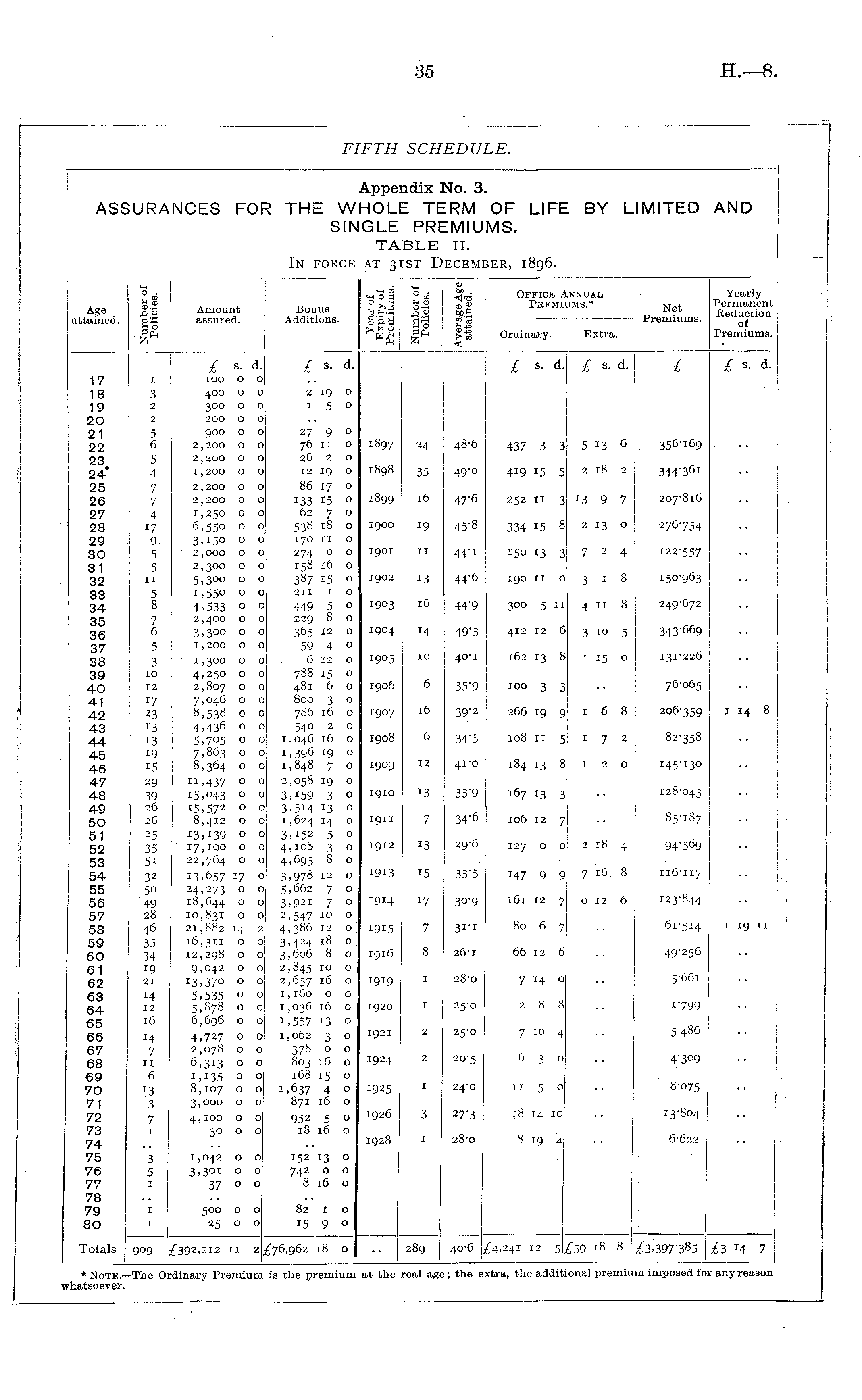 Appendix No. 3. ASSURANCES FOR THE WHOLE TERM OF LIFE BY LIMITED AND SINGLE PREMIUMS. TABLE II. In force at 31st December, 1896.
