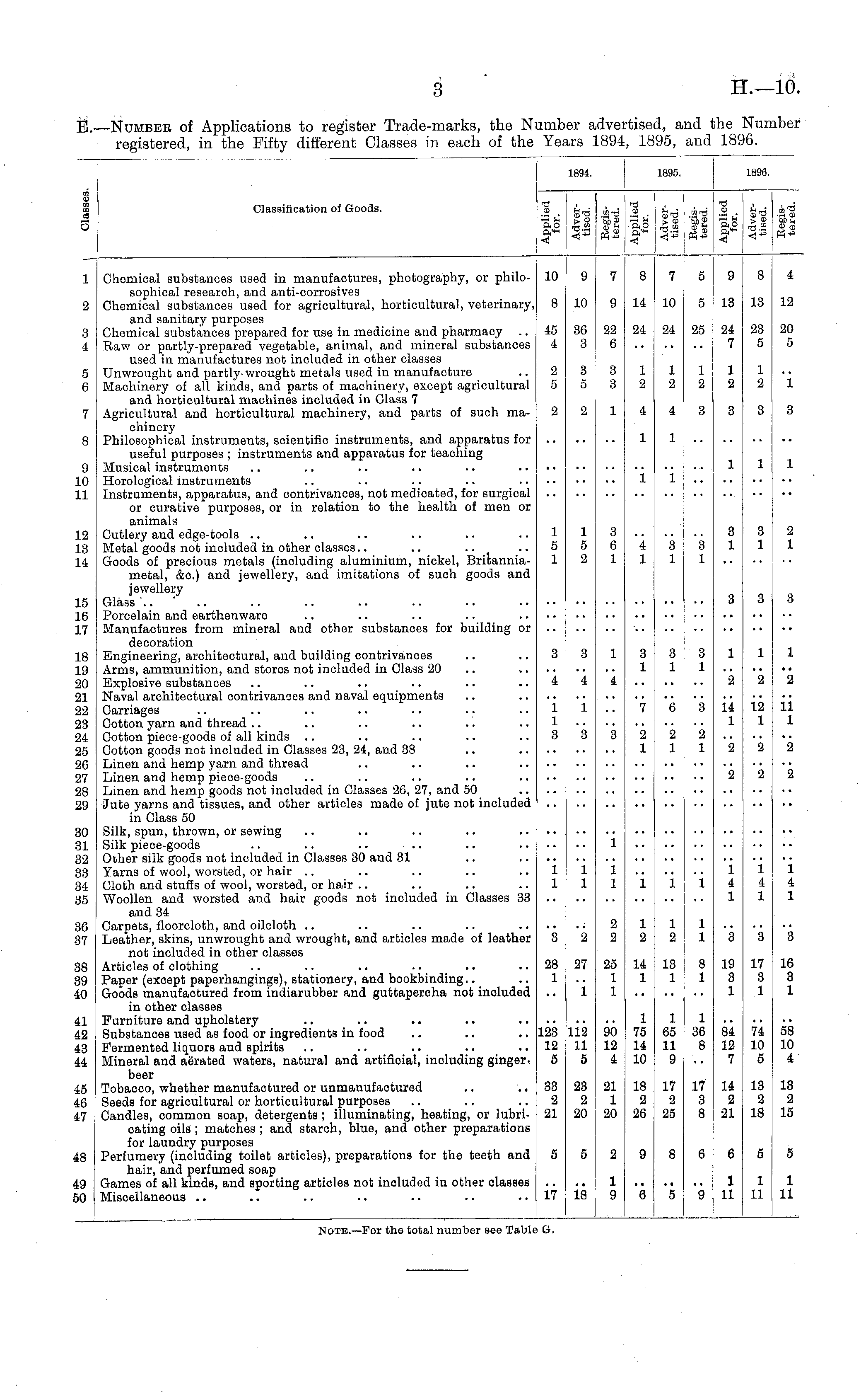 E.—Number of Applications to register Trade-marks, the Number advertised, and the Number registered, in the Fifty different Classes in each of the Years 1894, 1895, and 1896.