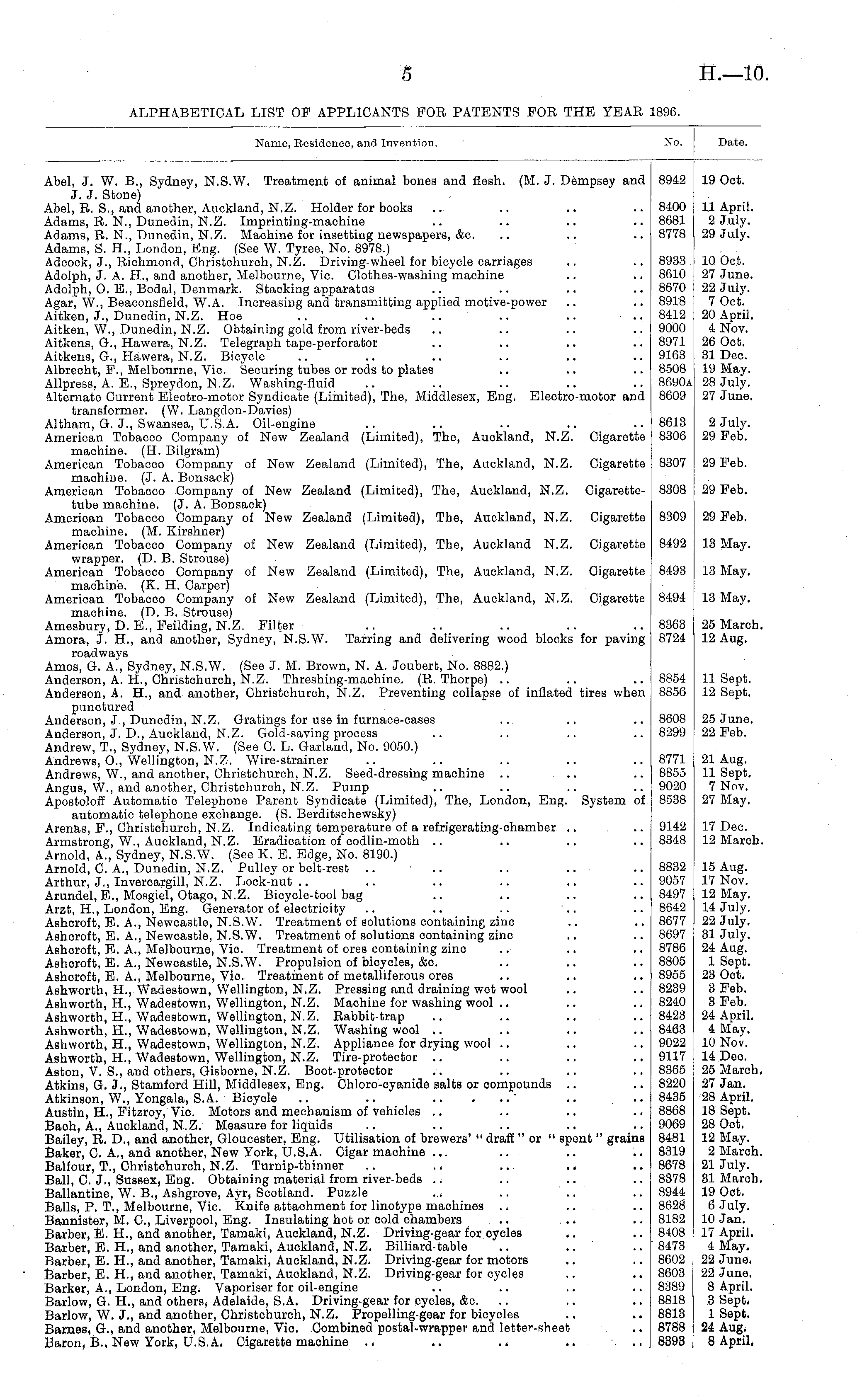 ALPHABETICAL LIST OF APPLICANTS FOR PATENTS FOR THE YEAR 1896.