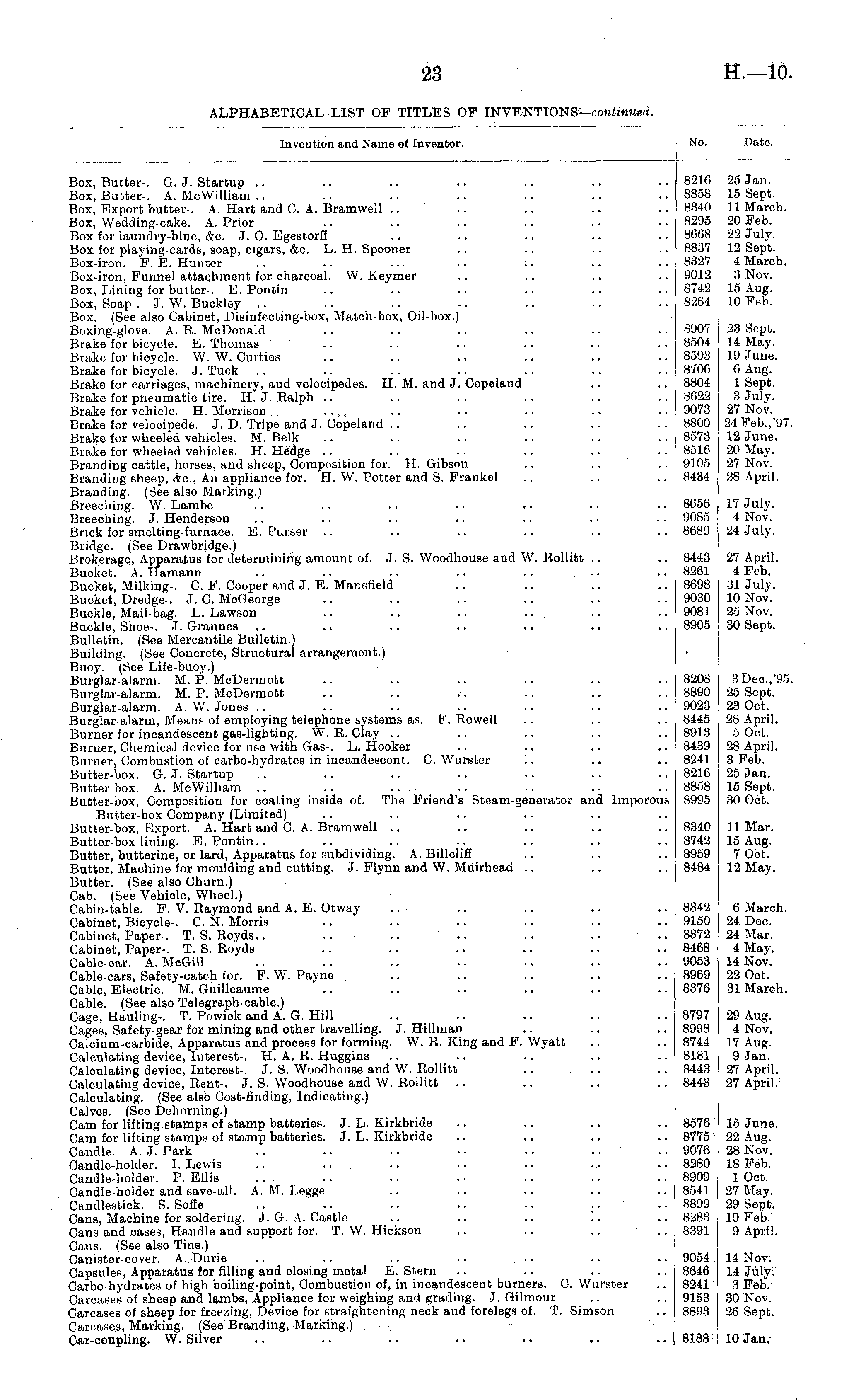 Invention and Name of Inventor. ;o. be. Box, Butter-. G. J. Startup Box, Butter-. A. McWilliam .. Box, Export butter-. A. Hart and C. A. Bramwell Box, Wedding-cake. A. Prior Box for laundry-blue, &c. J. 0. Egestorff Box for playing-cards, soap, cigars, &c. L. H. Spooner Box-iron. F. E. Hunter Box-iron, Funnel attachment for charcoal. W. Keymer Box, Lining for butter-. E. Pontin Box, Soap . J. W. Buckley Box. (See also Cabinet, Disinfecting-box, Match-box, Oil-box.) Boxing-glove. A. R. McDonald Brake for bicycle. E. Thomas Brake for bicycle. W. W. Curties Brake for bicycle. J. Tuck Brake for carriages, machinery, and velocipedes. H. M. and J. Copeland Brake for pneumatic tire. H. J. Ralph Brake for vehicle. H. Morrison .... Brake for velocipede. J. D. Tripe and J. Copeland Brake for wheeled vehicles. M. Belk Brake for wheeled vehicles. H. Hedge Branding cattle, horses, and sheep, Composition for. H. Gibson Branding sheep, &c, An appliance for. H. W. Potter and S. Frankel Branding. (See also Marking.) Breeching. W. Lambe Breeching. J. Henderson .. .. .. Bnck for smelting-furnace. E. Purser .. Bridge. (See Drawbridge.) Brokerage, Apparatus for determining amount of. J. S. Woodhouse and W. Rollitt Bucket. A. Hamann .. .. .. .. .. ... Bucket, Milking-. C. F. Cooper and J. E. Mansfield Bucket, Dredge-. J. C. McGeorge Buckle, Mail-bag. L. Lawson Buckle, Shoe-. J. Grannes Bulletin. (See Mercantile Bulletin.) Building. (See Concrete, Structural arrangement.) Buoy. (See Life-buoy.) Burglar-alarm. M. P. McDermott Burglar-alarm. M. P. McDermott Burglar-alarm. A. W.Jones .. Burglar alarm, Means of employing telephone systems as. F. Rowell Burner for incandescent gas-lighting. W.R.Clay .. Burner, Chemical device for use with Gas-. L. Hooker Burner, Combustion of carbo-hydrates in incandescent. C. Wurster Butter-box. G. J. Startup Butter-box. A. McWilliam .. Butter-box, Composition for coating inside of. The Friend's Steam-generator and Imporous Butter-box Company (Limited) .. ... Butter-box, Export. A. Hart and C. A. Bramwell Butter-box lining. E. Pontin.. Butter, butterine, or lard, Apparatus for subdividing. A. Billcliff Butter, Machine for moulding and cutting. J. Flynn and W. Muirhead Butter. (See also Churn.) Cab. (See Vehicle, Wheel.) Cabin-table. F. V. Raymond and A. E. Otway Cabinet, Bicycle-. C. N. Morris Cabinet, Paper-. T.S. Royds.. Cabinet, Paper-. T. S. Royds Cable-car. A. McGill Cable-cars, Safety-catch for. F. W. Payne Cable, Electric. M. Guilleaume Cable. (See also Telegraph-cable.) Cage, Hauling-. T. Powick and A. G. Hill Cages, Safety-gear for mining and other travelling. J. Hillman Calcium-carbide, Apparatus and process for forming. W. R. King and F. Wyatt Calculating device, Interest-. H. A. R. Huggins Calculating device, Interest-. J. S. Woodhouse and W. Rollitt Calculating device, Rent-. J. S. Woodhouse and W. Rollitt Calculating. (See also Cost-finding, Indicating.) Calves. (See Dehorning.) Cam for lifting stamps of stamp batteries. J. L. Kirkbride Cam for lifting stamps of stamp batteries. J. L. Kirkbride Candle. A. J. Park Candle-holder. I. Lewis Candle-holder. P. Ellis Candle-holder and save-all. A. M. Legge Candlestick. S. Sofie .. .. .. .. .. .. Cans, Machine for soldering. J. G. A. Castle Cans and cases, Handle and support for. T. W. Hickson Cans. (See also Tins.) Canister-cover. A. Durie .. .. .. .. ■• Capsules, Apparatus for filling and closing metal. E. Stern Carbohydrates of high boiling-point, Combustion of, in incandescent burners. C. Wurster Carcases of sheep and lambs, Appliance for weighing and grading. J. Gilmour Carcases of sheep for freezing, Device for straightening neck and forelegs of. T. Simson Carcases, Marking. (See Branding, Marking.) Car-coupling. W. Silver 8216 8858 8340 8295 8668 8837 8327 9012 8742 8264 8907 8504 8593 8706 8804 8622 9073 8800 8573 8510 9105 8434 8656 9085 8689 8443 8261 8698 9030 9081 8905 8208 8890 9023 8445 8913 8439 8241 8216 8858 8995 25 Jan. 15 Sept. 11 March. 20 Feb. 22 July. 12 Sept. 4 March. 3 Nov. 15 Aug. 10 Feb. 23 Sept. 14 May. 19 June. 6 Aug. 1 Sept. 3 July. 27 Nov. 24 Feb.,'97 12 June. 20 May. 27 Nov. 28 April. 17 July. 4 Nov. 24 July. 27 April. 4 Feb. 31 July. 10 Nov. 25 Nov. 30 Sept. 3 Dec.'95 25 Sept. 23 Oct. 28 April. 5 Oct. 28 April. 3 Feb. 25 Jan. 15 Sept. 30 Oct. 8340 8742 8959 8484 11 Mar. 15 Aug. 7 Oct. 12 May. 8342 9150 8372 8468 9053 8969 8376 6 March. 24 Dec. 24 Mar. 4 May. 14 Nov. 22 Oct. 31 March. 8797 8998 8744 8181 8443 8443 29 Aug. 4 Nov. 17 Aug. 9 Jan. 27 April. 27 April. 8576 8775 9076 8280 8909 8541 8899 8283 8391 15 June. 22 Aug. 28 Nov. 18 Feb. 1 Oct. 27 May. 29 Sept. 19 Feb. 9 April. 9054 8646 8241 ' 9153 8893 14 Nov. 14 July. 3 Feb. 30 Nov. 26 Sept. 8188 10 Jan.