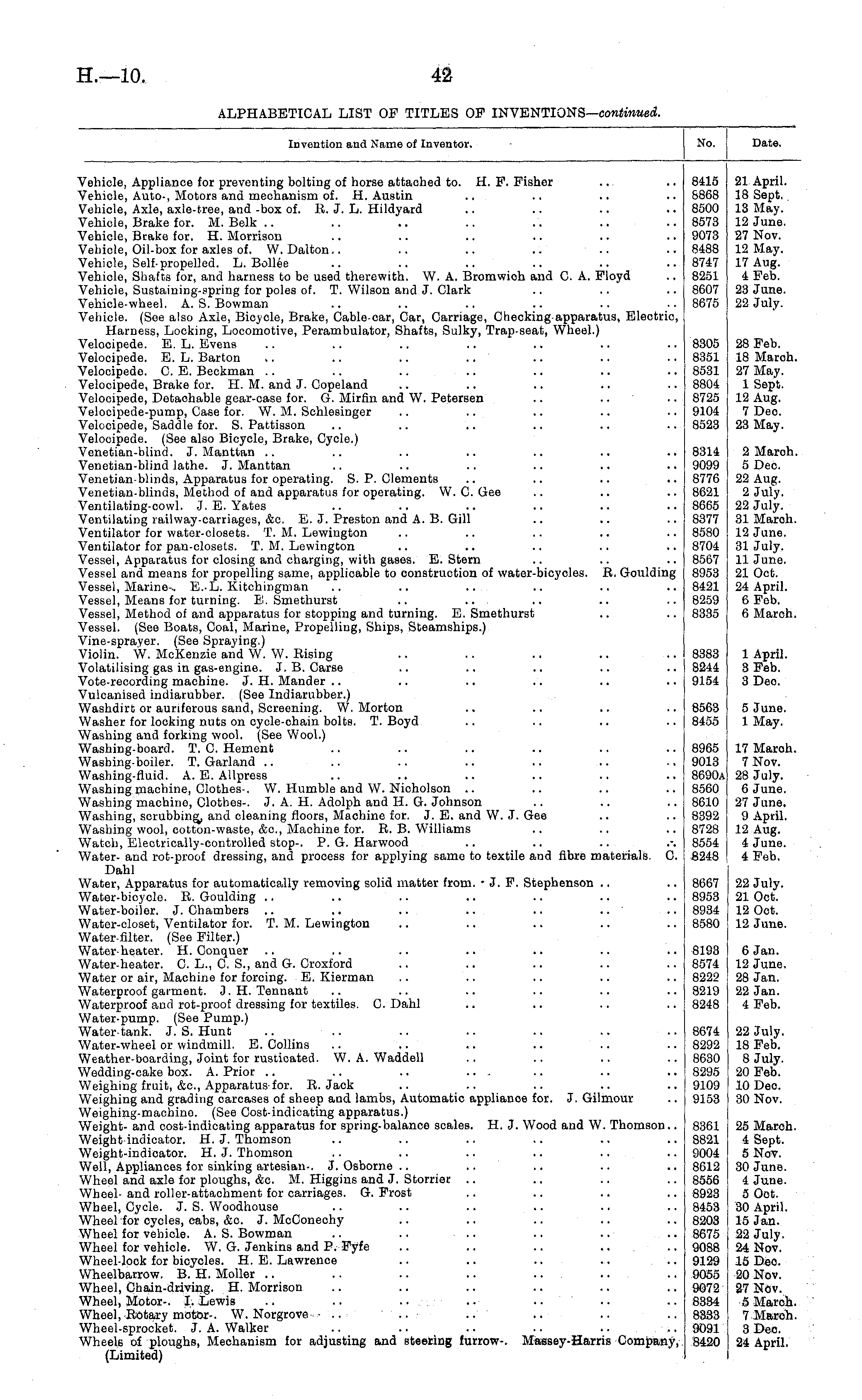 Invention am 'ame 01 Inventor. fo, :e. Vehicle, Appliance for preventing bolting of horse attached to. H. F. Fisher Vehicle, Auto-, Motors and mechanism of. H.Austin Vehicle, Axle, axle-tree, and -box of. R. J. L. Hildyard Vehicle, Brake for. M. Belk Vehicle, Brake for. H. Morrison Vehicle, Oil-box for axles of. W. Dalton.. .. .. .. .. Vehicle, Self-propelled. L. Bollee Vehicle, Shafts for, and harness to be used therewith. W. A. Bromwich and C. A. Floyd Vehicle, Sustaining-spring for poles of. T. Wilson and J. Clark Vehicle-wheel. A.S.Bowman Vehicle. (See also Axle, Bicycle, Brake, Cable-car, Car, Carriage, Checking-apparatus, Electric, Harness, Locking, Locomotive, Perambulator, Shafts, Sulky, Trap-seat, Wheel.) Velocipede. E. L. Evens Velocipede. E. L. Barton Velocipede. C. E. Beckman Velocipede, Brake for. H. M. and J. Copeland Velocipede, Detachable gear-case for. G. Mirfin and W. Petersen Velocipede-pump, Case for. W. M. Schlesinger Velocipede, Saddle for. S. Pattisson Velocipede. (See also Bicycle, Brake, Cycle.) Venetian-blind. J. Manttan .. Venetian-blind lathe. J. Manttan Venetian-blinds, Apparatus for operating. S.P.Clements Venetian-blinds, Method of and apparatus for operating. W. C. Gee Ventilating-cowl. J.E.Yates Ventilating railway-carriages, &c. E. J. Preston and A. B. Gill Ventilator for water-closets. T. M. Lewington Ventilator for pan-closets. T. M. Lewington Vessel, Apparatus for closing and charging, with gases. E. Stern Vessel and means for propelling same, applicable to construction of water-bicycles. R. Goulding Vessel, Marine-. E.-L. Kitchingman Vessel, Means for turning. B. Smethurst Vessel, Method of and apparatus for stopping and turning. E. Smethurst Vessel. (See Boats, Coal, Marine, Propelling, Ships, Steamships.) Vine-sprayer. (See Spraying.) Violin. W. McKenzie and W. W. Rising Volatilising gas in gas-engine. J. B. Carse Vote-recording machine. J. H. Mander Vulcanised indiarubber. (See Indiarubber.) Washdirt or auriferous sand, Screening. W. Morton Washer for locking nuts on cycle-chain bolts. T. Boyd Washing and forking wool. (See Wool.) Washing-board. T. C. Hement Washing-boiler. T. Garland Washing-fluid. A. E. AUpress Washing machine, Clothes-. W. Humble and W. Nicholson .. Washing machine, Clothes-. J. A. H. Adolph and H. G. Johnson Washing, scrubbing, and cleaning floors, Machine for. J. E. and W. J. Gee Washing wool, cotton-waste, &c, Machine for. R. B. Williams Watch, Electrically-controlled stop-. P. G. Harwood Water- and rot-proof dressing, and process for applying same to textile and fibre materials. C. Dahl Water, Apparatus for automatically removing solid matter from. - J. F. Stephenson Water-bicycle. R. Goulding Water-boiler. J. Chambers .. .. .. .. .. Water-closet, Ventilator for. T. M. Lewington Water-filter. (See Filter.) Water-heater. H. Conquer Water-heater. C. L., C. S., and G. Croxford Water or air, Machine for forcing. E. Kierman Waterproof garment. 3. H. Tennant Waterproof and rot-proof dressing for textiles. C. Dahl Water-pump. (See Pump.) Water-tank. J. S. Hunt .. .. .. .. .. .. Water-wheel or windmill. E. Collins Weather-boarding, Joint for rusticated. W. A. Waddell Wedding-cake box. A. Prior .. .. .. ... Weighing fruit, &c, Apparatus for. R.Jack Weighing and grading carcases of sheep and lambs, Automatic appliance for. J. Gilmour Weighing-machino. (See Cost-indicating apparatus.) Weight- and cost-indicating apparatus for spring-balance scales. H. J. Wood and W. Thomson.. Weight indicator. H. J. Thomson Weight-indicator. H. J. Thomson Well, Appliances for sinking artesian-. J. Osborne Wheel and axle for ploughs, &o. M. Higgins and J. Storrier Wheel- and roller-attachment for carriages. G. Frost Wheel, Cycle. J. S. Woodhouse Wheel for cycles, cabs, &c J. McConeohy Wheel for vehicle. A. S. Bowman .. .. Wheel for vehicle. W. G. Jenkins and P. Fyfe .. .. .. ... Wheel-lock for bicycles. H.E.Lawrence .. .. .. .. .. Wheelbarrow. B. H. Moller Wheel, Chain-driving. H. Morrison Wheel, Motor-. I. Lewis .. .. ..... Wheel, Rotary motor-. W. Norgrove- • .. .. ..'.' Wheel-sprocket. J. A. Walker .. .. .. .. .. Wheels of ploughs, Mechanism for adjusting and steering furrow-. Massey-Harris Company, (Limited) 8415 8868 8500 8573 9073 8488 8747 8251 8607 8675 8305 8351 8531 8804 8725 9104 8523 8314 9099 8776 8621 8665 8377 8580 8704 8567 8953 8421 8259 8335 8383 8244 9154 8563 8455 8965 9013 8690a 8560 8610 8392 8728 8554 8248 21 April. 18 Sept. 13 May. 12 June. 27 Nov. 12 May. 17 Aug. 4 Feb. 23 June. 22 July. 28 Feb. 18 Maroh 27 May. 1 Sept, 12 Aug. 7 Dec. 23 May. 2 Maroh 5 Dec. 22 Aug. 2 July. 22 July. 31 March. 12 June. 31 July. 11 June. 21 Oct. 24 April. 6 Feb. 6 March, 1 April. 3 Feb. 3 Deo. 5 June. 1 May. 17 Maroh, 7 Nov. 28 July. 6 June. 27 June. 9 April. 12 Aug. 4 June. 4 Feb. 8667 8953 8934 8580 22 July. 21 Oct, 12 Oct. 12 June. 8193 8574 8222 8219 8248 6 Jan. 12 June. 28 Jan. 22 Jan. 4 Feb. 8674 8292 8630 8295 9109 9153 22 July. 18 Feb. 8 July. 20 Feb. 10 Dec. 30 Nov. 8361 8821 9004 8612 8556 8923 8453 8203 8675 9088 9129 9055 9072 8334 8333 9091 8420 25 March, 4 Sept. 5 Nov. 30 June. 4 June. 5 Oct. 30 April, 15 Jan. 22 July, 24 Nov. 15 Deo. 20 Nov. 27 Nov. 5 March, 7 March 3 Dec. 24 April.