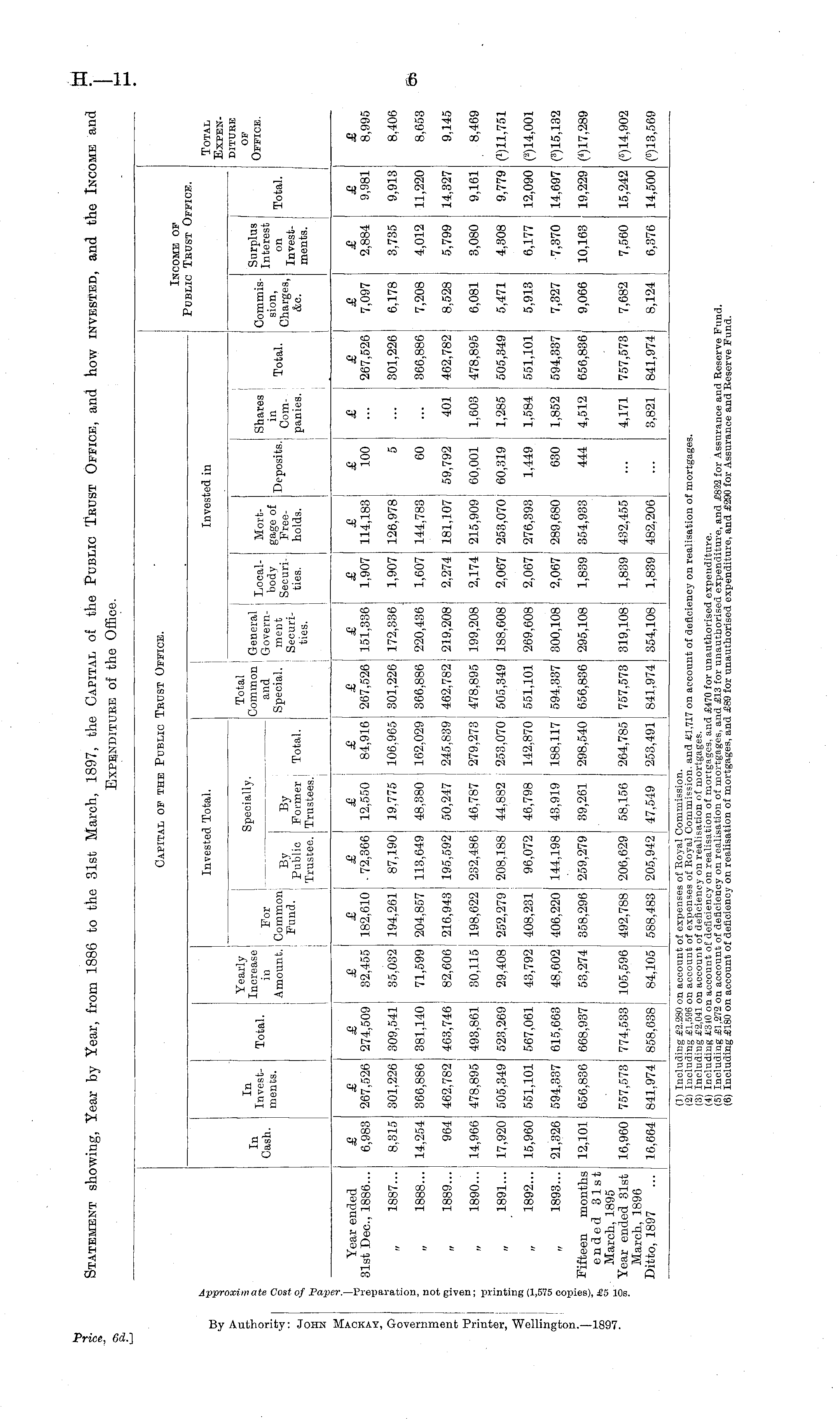Capital of the Public Trust Office. Income of ublic Teust Office. Invested Total. Invested in Total Expenditure of In Cash. In Investments. Total. Yearly I Increase in [ For Specially. Total J Common , General and I GovernSpecial. ! ment Securities. Localbody Securities. Mortgage of Freeholds. Shares Com- TotaL panies. Commission, Charges, &c. Surplus Interest Officf,. Amount. Common Fund. L By Public Trustee. By Former Total. Trustees. Deposits. on Investments. Total. Year ended 31st Dec, 1886... £ 6,983 £ 267,526 £ 274,509 £ 32,455 £ 182,610 £ . 72,366 £ 12,550 £ 84,916 £ 267,526 £ 151,336 £ 1,907 £ 114,183 £ 100 £ £ 267,526 £ 7,097 £ 2,884 £ 9,981 £ 8,995 1887... 8,315 301,226 309,541 35,032 194,261 87,190 19,775 106,965 301,226 172,336 1,907 126,978 5 301,226 6,178 3,735 9,913 8,406 1888... 14,254 366,886 381,140 71,599 204,857 113,649 48,380 162,029 366,886 220,436 1,607 144,783 60 366,886 7,208 4,012 11,220 8,653 1889... 964 462,782 463,746 82,606 216,943 195,592 50,247 245,839 462,782 219,208 2,274 181,107 59,792 401 462,782 8,528 5,799 14,327 9,145 1890... 14,966 478,895 493,861 30,115 198,622 232,486 46,787 279,273 478,895 199,208 2,174 215,909 60,001 1,603 478,895 6,081 3,080 9,161 8,469 1891... 17,920 505,349 523,269 29,408 252,279 208,188 44,882 253,070 505,349 188,608 2,067 253,070 60,319 1,285 505,349 5,471 4,308 9,779 011,751 „ 1892... 15,960 551,101 567,061 43,792 408,231 96,072 46,798 142,870 551,101 269,608 2,067 276,393 1,449 1,584 551,101 5,913 6,177 12,090 ( 2 ) 14,001 1893... 21,326 594,337 615,663 48,602 406,220 144,198 43,919 188,117 594,337 300,108 2,067 289,680 630 1,852 594,337 7,327 7,370 14,697 ( 3 )15,132 Fifteen months ended 31st March, 1895 Year ended 31st March, 1896 Ditto, 1897 12,101 656,836 668,937 53,274 358,296 259,279 39,261 298,540 656,836 295,108 1,839 354,933 444 4,512 656,836 9,066 10,163 19,229 ( 4 )17,289 16,960 757,573 774,533 105,596 492,788 206,629 58,156 264,785 757,573 319,108 1,839 432,455 4,171 757,573 7,682 7,560 15,242 f) 14,902 16,664 841,974 858,638 84,105 588,483 205,942 47,549 253,491 841,974 354,108 1,839 482,206 3,821 841,974 8,124 6,376 14,500 (")13,569