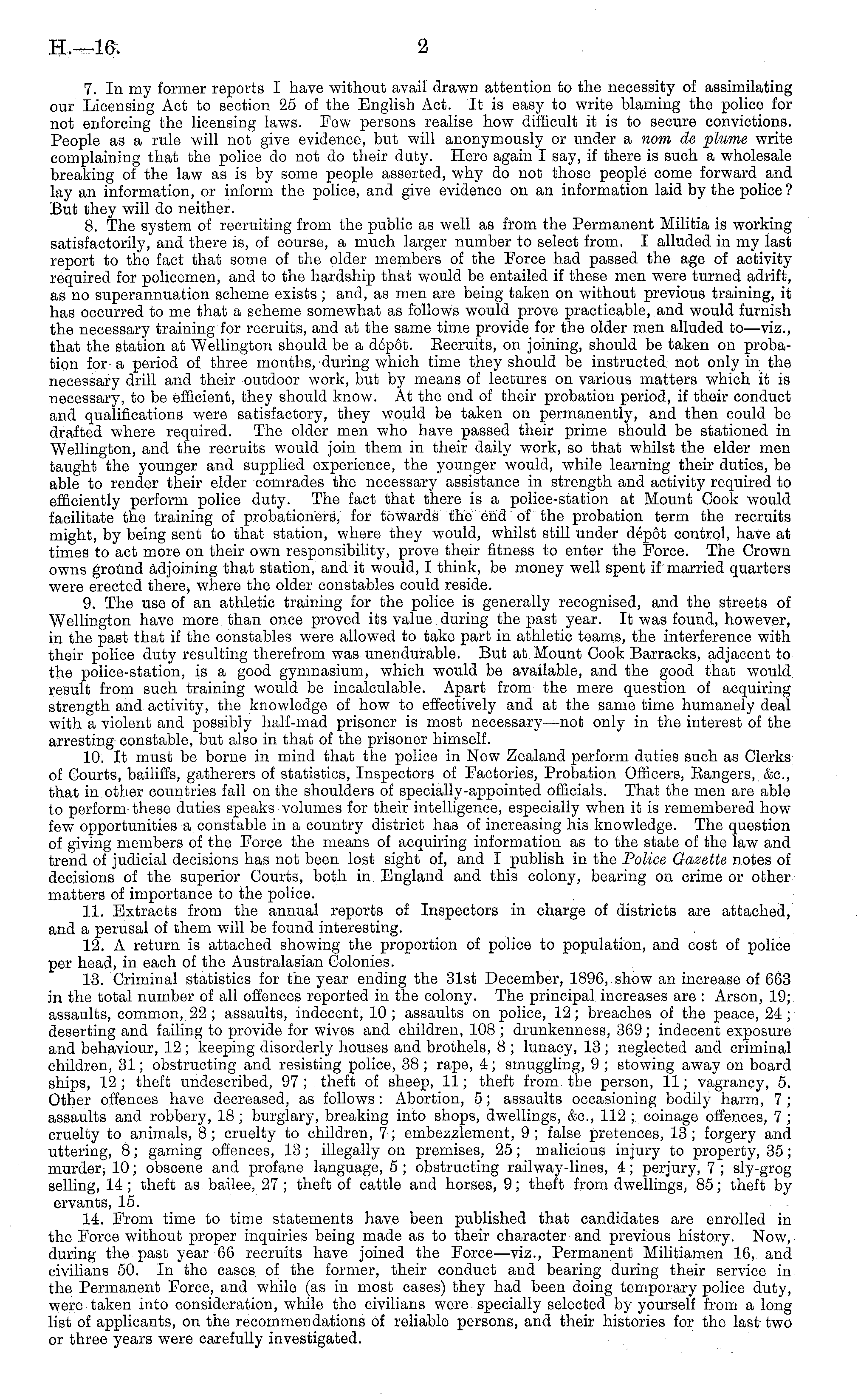 7. In my former reports I have without avail drawn attention to the necessity of assimilating our Licensing Act to section 25 of the English Act. It is easy to write blaming the police for not enforcing the licensing laws. Pew persons realise how difficult it is to secure convictions. People as a rule will not give evidence, but will anonymously or under a now, ale plume write complaining that the police do not do their duty. Here again I say, if there is such a wholesale breaking of the law as is by some people asserted, why do not those people come forward and lay an information, or inform the police, and give evidence on an information laid by the police ? But they will do neither. 8. The system of recruiting from the public as well as from the Permanent Militia is working satisfactorily, and there is, of course, a much larger number to select from. I alluded in my last report to the fact that some of the older members of the Force had passed the age of activity required for policemen, and to the hardship that would be entailed if these men were turned adrift, as no superannuation scheme exists; and, as men are being taken on without previous training, it has occurred to me that a scheme somewhat as follows would prove practicable, and would furnish the necessary training for recruits, and at the same time provide for the older men alluded to—viz., that the station at Wellington should be a depdt. Recruits, on joining, should be taken on probation for a period of three months, during which time they should be instructed not only in the necessary drill and their outdoor work, but by means of lectures on various matters which it is necessary, to be efficient, they should know. At the end of their probation period, if their conduct and qualifications were satisfactory, they would be taken on permanently, and then could be drafted where required. The older men who have passed their prime should be stationed in Wellington, and the recruits would join them in their daily work, so that whilst the elder men taught the younger and supplied experience, the younger would, while learning their duties, be able to render their elder comrades the necessary assistance in strength and activity required to efficiently perform police duty. The fact that there is a police-station at Mount Cook would facilitate the training of probationers, for towards the end of the probation term the recruits might, by being sent to that station, where they would, whilst still under depot control, have at times to act more on their own responsibility, prove their fitness to enter the Force. The Crown owns ground adjoining that station, and it would, I think, be money well spent if married quarters were erected there, where the older constables could reside. 9. The use of an athletic training for the police is generally recognised, and the streets of Wellington have more than once proved its value during the past year. It was found, however, in the past that if the constables were allowed to take part in athletic teams, the interference with their police duty resulting therefrom was unendurable. But at Mount Cook Barracks, adjacent to the police-station, is a good gymnasium, which would be available, and the good that would result from such training would be incalculable. Apart from the mere question of acquiring strength and activity, the knowledge of how to effectively and at the same time humanely deal with a violent and possibly half-mad prisoner is most necessary—not only in the interest of the arresting constable, but also in that of the prisoner himself. 10. It must be borne in mind that the police in New Zealand perform duties such as Clerks of Courts, bailiffs, gatherers of statistics, Inspectors of Factories, Probation Officers, Rangers, &c, that in other countries fall on the shoulders of specially-appointed officials. That the men are able to perform these duties speaks volumes for their intelligence, especially when it is remembered how few opportunities a constable in a country district has of increasing his knowledge. The question of giving members of the Force the means of acquiring information as to the state of the law and trend of judicial decisions has not been lost sight of, and I publish in the Police Gazette notes of decisions of the superior Courts, both in England and this colony, bearing on crime or other matters of importance to the police. 11. Extracts from the annual reports of Inspectors in charge of districts are attached, and a perusal of them will be found interesting. 12. A return is attached showing the proportion of police to population, and cost of police per head, in each of the Australasian Colonies. 13. Criminal statistics for the year ending the 31st December, 1896, show an increase of 663 in the total number of all offences reported in the colony. The principal increases are : Arson, 19; assaults, common, 22 ; assaults, indecent, 10 ; assaults on police, 12; breaches of the peace, 24; deserting and failing to provide for wives and children, 108 ; drunkenness, 369; indecent exposure and behaviour, 12 ; keeping disorderly houses and brothels, 8 ; lunacy, 13 ; neglected and criminal children, 31; obstructing and resisting police, 38 ; rape, 4; smuggling, 9 ; stowing away on board ships, 12; theft undescribed, 97; theft of sheep, 11; theft from, the person, 11; vagrancy, 5. Other offences have decreased, as follows: Abortion, 5; assaults occasioning bodily harm, 7 ; assaults and robbery, 18 ; burglary, breaking into shops, dwellings, &c, 112 ; coinage offences, 7 ; cruelty to animals, 8; cruelty to children, 7; embezzlement, 9 ; false pretences, 13; forgery and uttering, 8; gaming offences, 13; illegally on premises, 25; malicious injury to property, 35; murder, 10; obscene and profane language, 5 ; obstructing railway-lines, 4; perjury, 7 ; sly-grog selling, 14; theft as bailee, 27 ; theft of cattle and horses, 9; theft from dwellings, 85; theft by ervants, 15. 14. From time to 