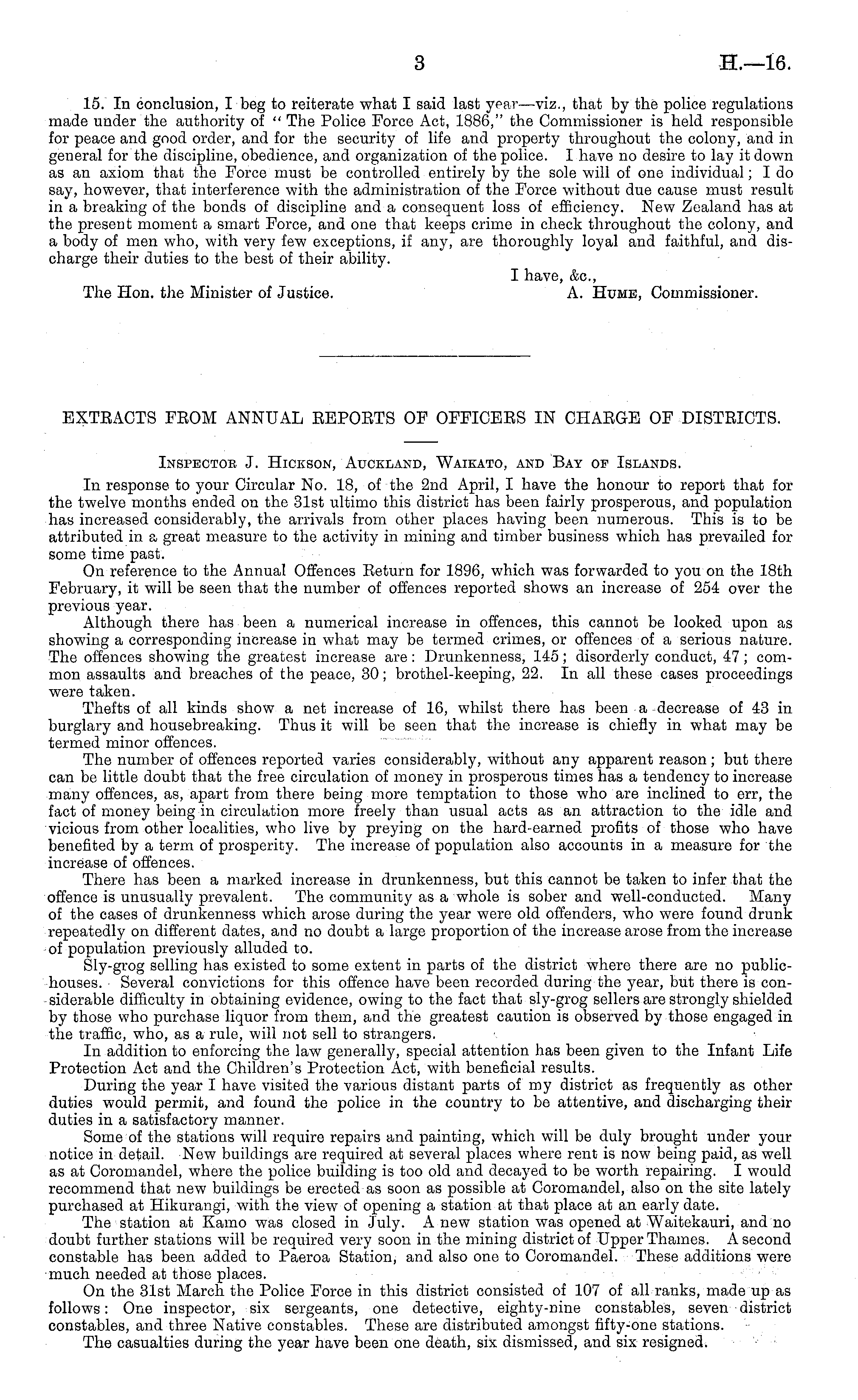 Inspector J. Hickson, Auckland, Waikato, and Bay of Islands. In response to your Circular No. 18, of the 2nd April, I have the honour to report that for the twelve months ended on the 31st ultimo this district has been fairly prosperous, and population has increased considerably, the arrivals from other places having been numerous. This is to be attributed in a great measure to the activity in mining and timber business which has prevailed for some time past. On reference to the Annual Offences Eeturn for 1896, which was forwarded to you on the 18th February, it will be seen that the number of offences reported shows an increase of 254 over the previous year. Although there has been a numerical increase in offences, this cannot be looked upon as showing a corresponding increase in what may be termed crimes, or offences of a serious nature. The offences showing the greatest increase are: Drunkenness, 145; disorderly conduct, 47; common assaults and breaches of the peace, 30; brothel-keeping, 22. In all these cases proceedings were taken. Thefts of all kinds show a net increase of 16, whilst there has been a decrease of 43 in burglary and housebreaking. Thus it will be seen that the increase is chiefly in what may be termed minor offences. The number of offences reported varies considerably, without any apparent reason; but there can be little doubt that the free circulation of money in prosperous times has a tendency to increase many offences, as, apart from there being more temptation to those who are inclined to err, the fact of money being in circulation more freely than usual acts as an attraction to the idle and vicious from other localities, who live by preying on the hard-earned profits of those who have benefited by a term of prosperity. The increase of population also accounts in a measure for the increase of offences. There has been a marked increase in drunkenness, but this cannot be taken to infer that the offence is unusually prevalent. The community as a whole is sober and well-conducted. Many of the cases of drunkenness which arose during the year were old offenders, who were found drunk repeatedly on different dates, and no doubt a large proportion of the increase arose from the increase of population previously alluded to. Sly-grog selling has existed to some extent in parts of the district where there are no publichouses. Several convictions for this offence have been recorded during the year, but there is considerable difficulty in obtaining evidence, owing to the fact that sly-grog sellers are strongly shielded by those who purchase liquor from them, and the greatest caution is observed by those engaged in the traffic, who, as a rule, will not sell to strangers. In addition to enforcing the law generally, special attention has been given to the Infant Life Protection Act and the Children's Protection Act, with beneficial results. During the year I have visited the various distant parts of my district as frequently as other duties would permit, and found the police in the country to be attentive, and discharging their duties in a satisfactory manner. Some of the stations will require repairs and painting, which will be duly brought under your notice in detail. New buildings are required at several places where rent is now being paid, as well as at Coromandel, where the police building is too old and decayed to be worth repairing. I would recommend that new buildings be erected as soon as possible at Coromandel, also on the site lately purchased at Hikurangi, with the view of opening a station at that place at an early date. The station at Kamo was closed in July. A new station was opened at Waitekauri, and no doubt further stations will be required very soon in the mining district of Upper Thames. A second constable has been added to Paeroa Station, and also one to Coromandel. These additions were much needed at those places. On the 31st March the Police Force in this district consisted of 107 of all ranks, made up as follows: One inspector, six sergeants, one detective, eighty-nine constables, seven district constables, and three Native constables. These are distributed amongst fifty-one stations. The casualties during the year have been one death, six dismissed, and six resigned.