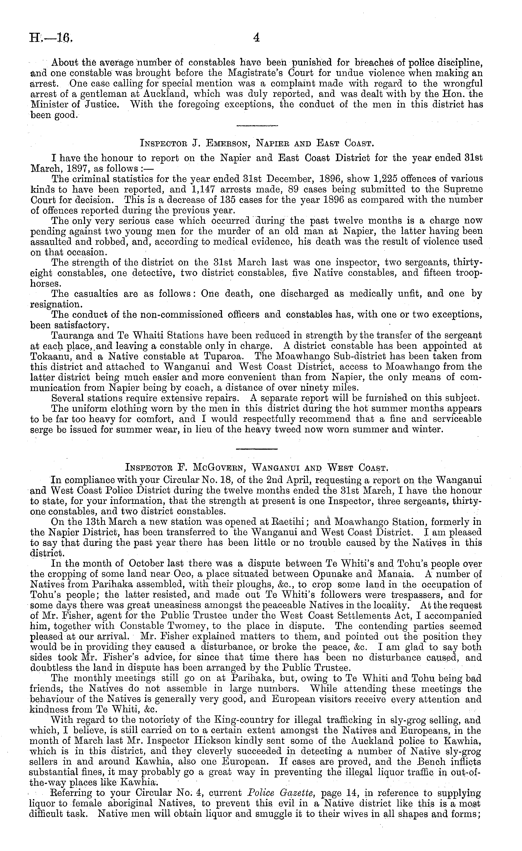 Inspectob J. Emebson, Napieb and East Coast. I have the honour to report on the Napier and East Coast District for the year ended 31st March, 1897, as follows :— The criminal statistics for the year ended 31st December, 1896, show 1,225 offences of various kinds to have been reported, and 1,147 arrests made, 89 cases being submitted to the Supreme Court for decision. This is a decrease of 135 cases for the year 1896 as compared with the number of offences reported during the previous year. The only very serious case which occurred during the past twelve months is a charge now pending against two young men for the murder of an old man at Napier, the latter having been assaulted and robbed, and, according to medical evidence, his death was the result of violence used on that occasion. The strength of the district on the 31st March last was one inspector, two sergeants, thirtyeight constables, one detective, two district constables, five Native constables, and fifteen troophorses. The casualties are as follows: One death, one discharged as medically unfit, and one by resignation. The conduct of the non-commissioned officers and constables has, with one or two exceptions, been satisfactory. Tauranga and Te Whaiti Stations have been reduced in strength by the transfer of the sergeant at each place,.and leaving a constable only in charge. A district constable has been appointed at Tokaanu, and a Native constable at Tuparoa. The Moawhango Sub-district has been taken from this district and attached to Wanganui and West Coast District, access to Moawhango from the latter district being much easier and more convenient than from Napier, the only means of communication from Napier being by coach, a distance of over ninety miles. Several stations require extensive repairs. A separate report will be furnished on this subject. The uniform clothiDg worn by the men in this district during the hot summer months appears to be far too heavy for comfort, and I would respectfully recommend that a fine and serviceable serge be issued for summer wear, in lieu of the heavy tweed now worn summer and winter.