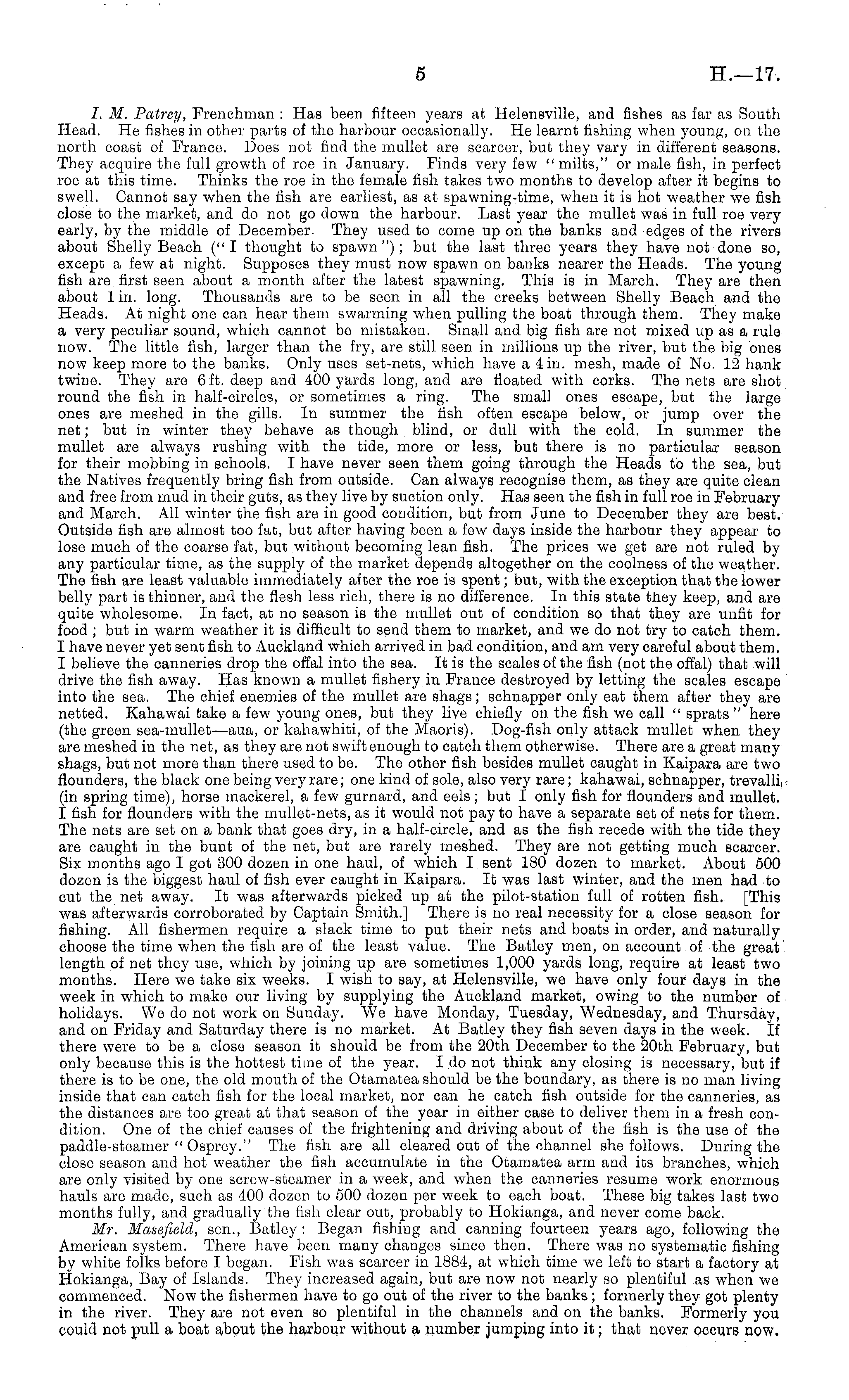 /. M. Patrey, Frenchman : Has been fifteen years at Helensville, and fishes as far as South Head. He fishes in other parts of the harbour occasionally. He learnt fishing when young, on the north coast of France. Does not find the mullet are scarcer, but they vary in different seasons. They acquire the full growth of roe in January. Finds very few " milts," or male fish, in perfect roe at this time. Thinks the roe in the female fish takes two months to develop after it begins to swell. Cannot say when the fish are earliest, as at spawning-time, when it is hot weather we fish close to the market, and do not go down the harbour. Last year the mullet was in full roe very early, by the middle of December. They used to come up on the banks and edges of the rivers about Shelly Beach ("I thought to spawn"); but the last three years they have not done so, except a few at night. Supposes they must now spawn on banks nearer the Heads. The young fish are first seen about a month after the latest spawning. This is in March. They are then about 1 in. long. Thousands are to be seen in all the creeks between Shelly Beach and the Heads. At night one can hear them swarming when pulling the boat through them. They make a very peculiar sound, which cannot be mistaken. Small and big fish are not mixed up as a rule now. The little fish, larger than the fry, are still seen in millions up the river, but the big ones now keep more to the banks. Only uses set-nets, which have a 4 in. mesh, made of No. 12 hank twine. They are 6 ft. deep and 400 yards long, and are floated with corks. The nets are shot round the fish in half-circles, or sometimes a ring. The small ones escape, but the large ones are meshed in the gills. In summer the fish often escape below, or jump over the net; but in winter they behave as though blind, or dull with the cold. In summer the mullet are always rushing with the tide, more or less, but there is no particular season for their mobbing in schools. I have never seen them going through the Heads to the sea, but the Natives frequently bring fish from outside. Can always recognise them, as they are quite clean and free from mud in their guts, as they live by suction only. Has seen the fish in full roe in February and March. All winter the fish are in good condition, but from June to December they are best. Outside fish are almost too fat, but after having been a few days inside the harbour they appear to lose much of the coarse fat, but without becoming lean fish. The prices we get are not ruled by any particular time, as the supply of the market depends altogether on the coolness of the weather. The fish are least valuable immediately after the roe is spent; but, with the exception that the lovver belly part is thinner, and the flesh loss rich, there is no difference. In this state they keep, and are quite wholesome. In fact, at no season is the mullet out of condition so that they are unfit for food ; but in warm weather it is difficult to send them to market, and we do not try to catch them. I have never yet sent fish to Auckland which arrived in bad condition, and am very careful about them. I believe the canneries drop the offal into the sea. It is the scales of the fish (not the offal) that will drive the fish away. Has known a mullet fishery in France destroyed by letting the scales escape into the sea. The chief enemies of the mullet are shags; schnapper only eat them after they are netted. Kahawai take a few young ones, but they live chiefly on the fish we call " sprats " here (the green sea-mullet—aua, or kahawhiti, of the Maoris). Dog-fish only attack mullet when they are meshed in the net, as they are not swift enough to catch them otherwise. There are a great many shags, but not more than there used to be. The other fish besides mullet caught in Kaipara are two flounders, the black one being very rare; one kind of sole, also very rare; kahawai, schnapper, trevalli (in spring time), horse mackerel, a few gurnard, and eels; but I only fish for flounders and mullet. I fish for flounders with the mullet-nets, as it would not pay to have a separate set of nets for them. The nets are set on a bank that goes dry, in a half-circle, and as the fish recede with the tide they are caught in the bunt of the net, but are rarely meshed. They are not getting much scarcer. Six months ago I got 300 dozen in one haul, of which I sent 180 dozen to market. About 500 dozen is the biggest haul of fish ever caught in Kaipara. It was last winter, and the men had to cut the net away. It was afterwards picked up at the pilot-station full of rotten fish. [This was afterwards corroborated by Captain Smith.] There is no real necessity for a close season for fishing. All fishermen require a slack time to put their nets and boats in order, and naturally choose the time when the fish are of the least value. The Batley men, on account of the great length of net they use, which by joining up are sometimes 1,000 yards long, require at least two months. Here we take six weeks. I wish to say, at Helensville, we have only four days in the week in which to make our living by supplying the Auckland market, owing to the number of holidays. We do not work on Sunday. We have Monday, Tuesday, Wednesday, and Thursday, and on Friday and Saturday there is no market. At Batley they fish seven days in the week. If there were to be a close season it should be from the 20th December to the 20th February, but only because this is the hottest time of the year. Ido not think any closing is necessary, but if there is to be one, the old mouth of the Otamatea should be the boundary, as there is no man living inside that can catch fish for the local market, nor can he catch fish outside for the canneries, as the distances are too great at that season of the year in either case to deliver them in a fresh condition. One of the chief causes of the frightening and driving about of the fish is the use of the paddle-steamer " Osprey." The f
