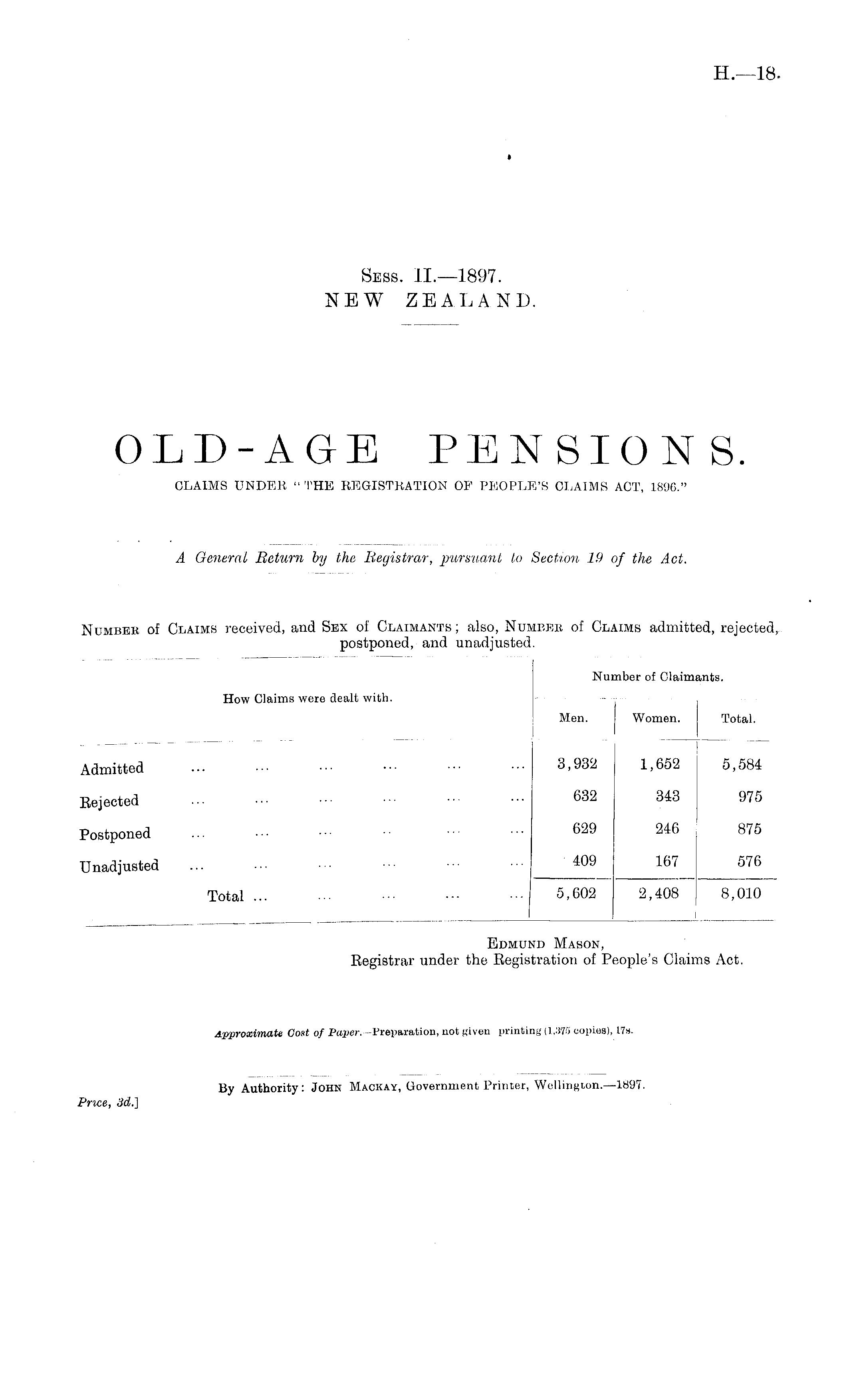 Edmund Mason, Eegistrar under the Begistration of People's Claims Act. Approximate Cost of Paper. -Preparation, not given printing (1,378 copies), 17a.