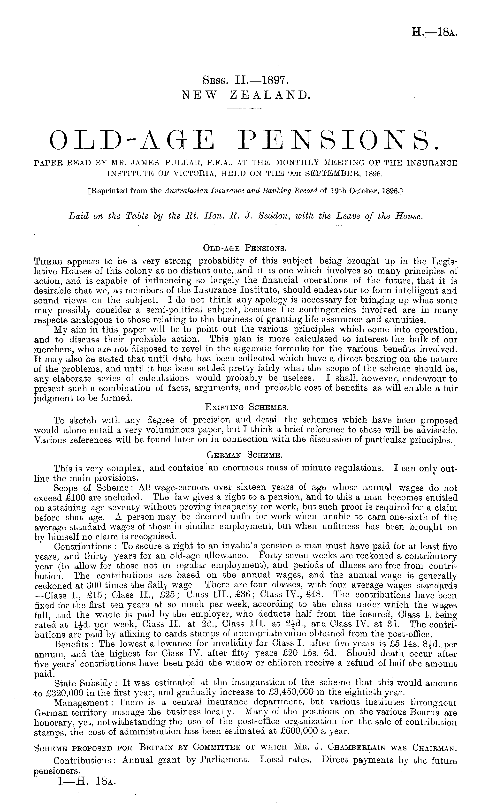 OLD-AGE PENSIONS. PAPER READ BY MR. JAMES PULLAR, F.F.A., AT THE MONTHLY MEETING OF THE INSURANCE INSTITUTE OF VICTORIA, HELD ON THE 9th SEPTEMBER, 1896. [Reprinted from the Australasian Insurance and Banking Record of 19th October, 1896.]