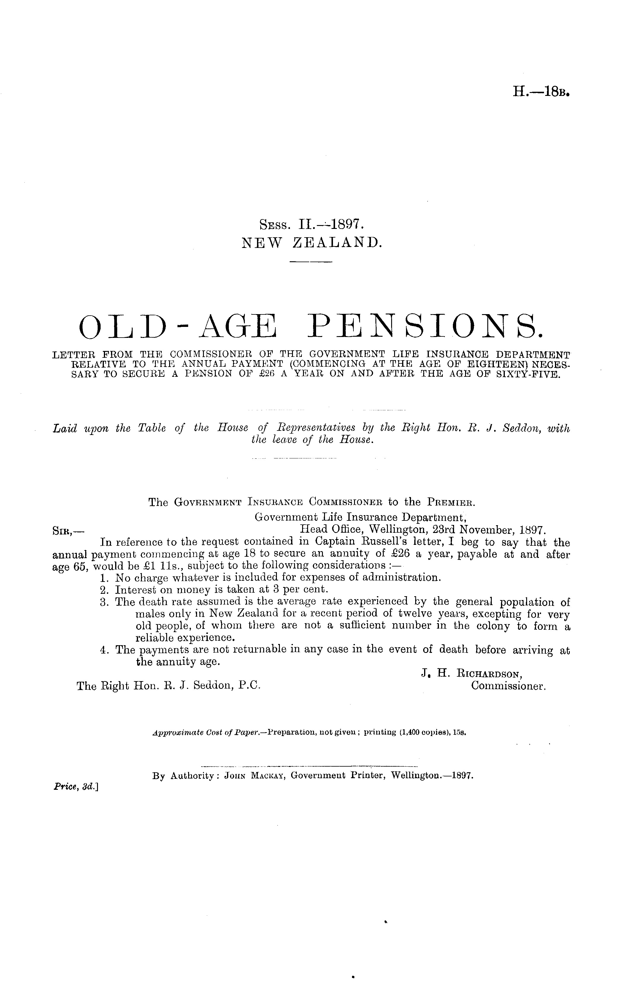 The Government Insurance Commissioner to the Premier. Government Life Insurance Department, Sir,— Head Office, Wellington, 23rd November, 1897. In reference to the request contained in Captain Eussell's letter, I beg to say that the annual payment commencing at age 18 to secure an annuity of £26 a year, payable at and after age 65, would be £1 lis., subject to the following considerations :— 1. No charge whatever is included for expenses of administration. 2. Interest on money is taken at 3 per cent. 3. The death rate assumed is the average rate experienced by the general population of males only in New Zealand for a recent period of twelve years, excepting for very old people, of whom there are not a sufficient number in the colony to form a reliable experience. 4. The payments are not returnable in any case in the event of death before arriving at the annuity age. J, H. EICHARDSON, The Eight Hon. E. J. Seddon, P.C. Commissioner. Approximate Cost of Paper.— Preparation, not given ; printing (1,400 copies), 15s.
